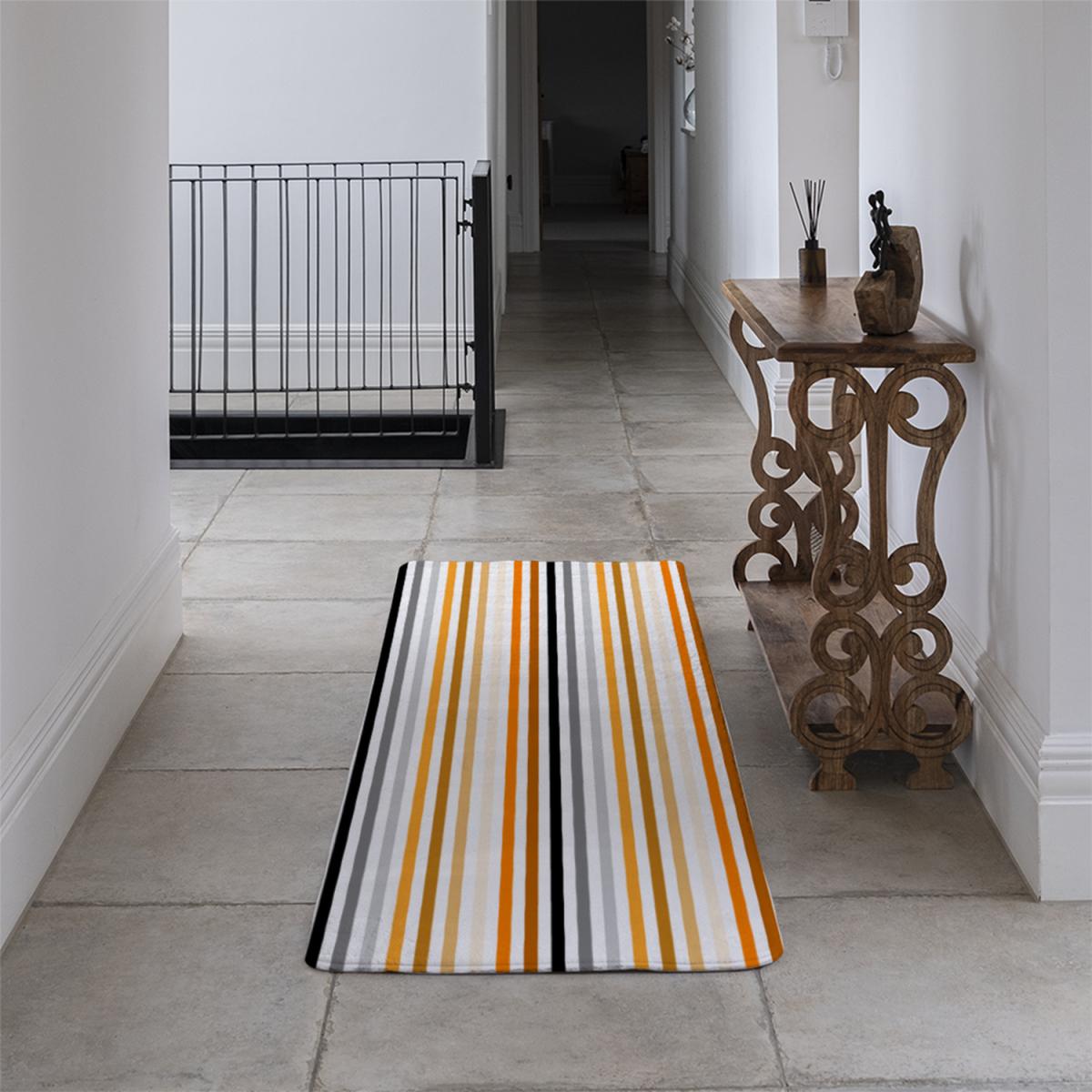 This striped runner rug is a versatile piece that works well in both contemporary and transitional interiors. I love the way its bold pattern adds visual interest without overwhelming the space, making it ideal for hallways, entryways, or beneath a dining table. The mix of warm oranges, greys, and beiges allows it to coordinate easily with neutral colour palettes or to inject a pop of colour into more subdued schemes. Practical styling tips include layering it over hardwood floors with a solid-colour rug pad for comfort and durability, and pairing it with simple, understated furniture to let the pattern stand out. It's perfect for those looking to add a touch of modern flair while maintaining a practical approach.