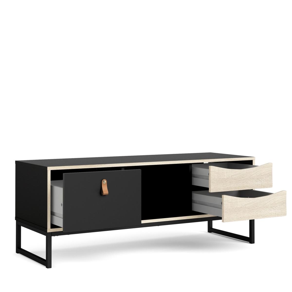 Dimensions H45 x W117.2 x D40 cm. The Stubbe TV unit is perfect for all your storage needs with three drawers and open space for your media units. The matt black unit is complemented by light oak effect drawer fronts and is finished with smooth black or brown leather handle which is your choice as both colour options are included. Features. Perfect storage piece Matt black unit is complemented by light oak effect drawer fronts. Features open and closed shelving. Easy to clean unit. Chose between a black or brown leather handle – both are included. Assembly required. DELIVERY RESTRICTIONS. Please note we are only able to ship this item to UK Mainland postcodes. We are unable to ship to Ireland Northern Ireland Scottish Highland or the Channel Islands...