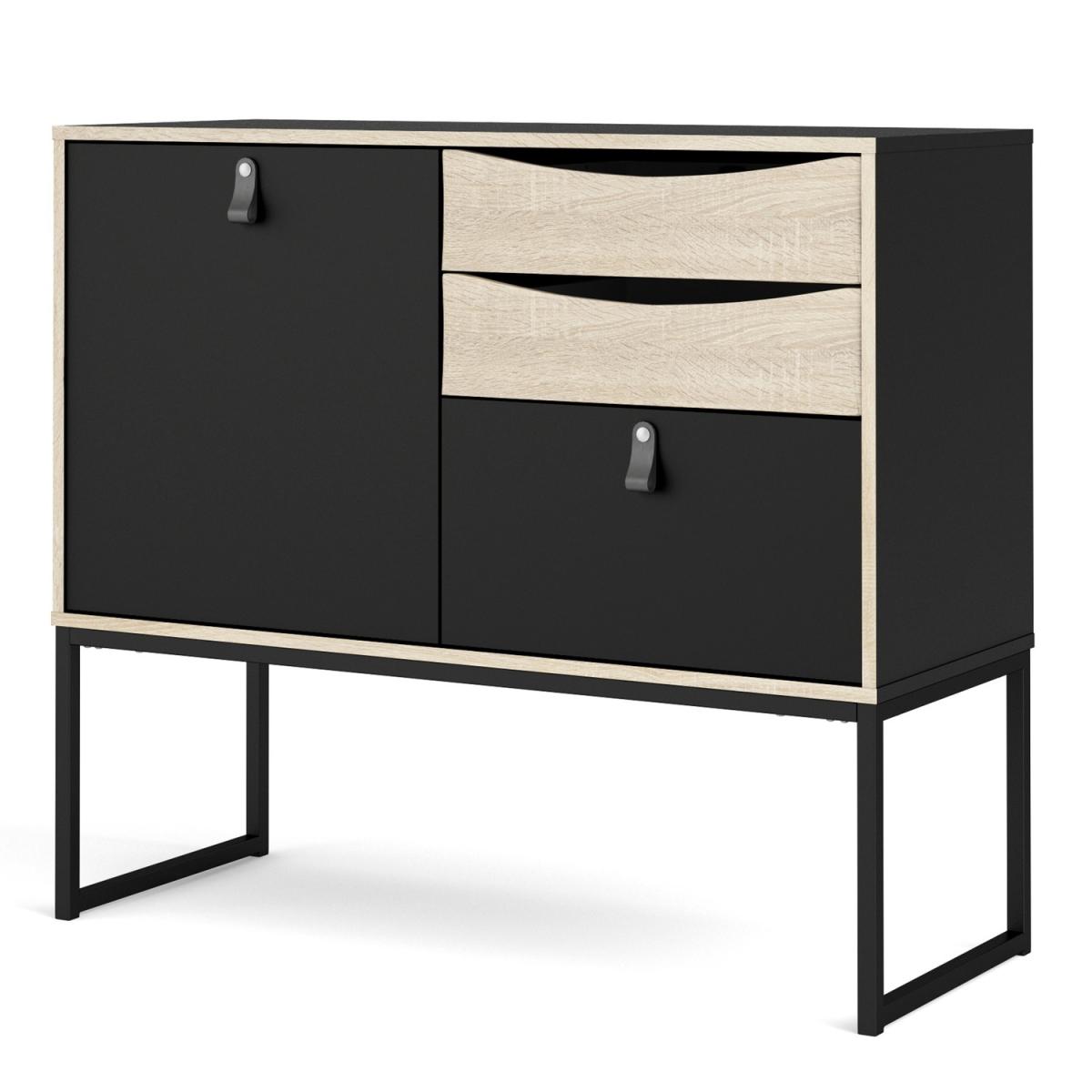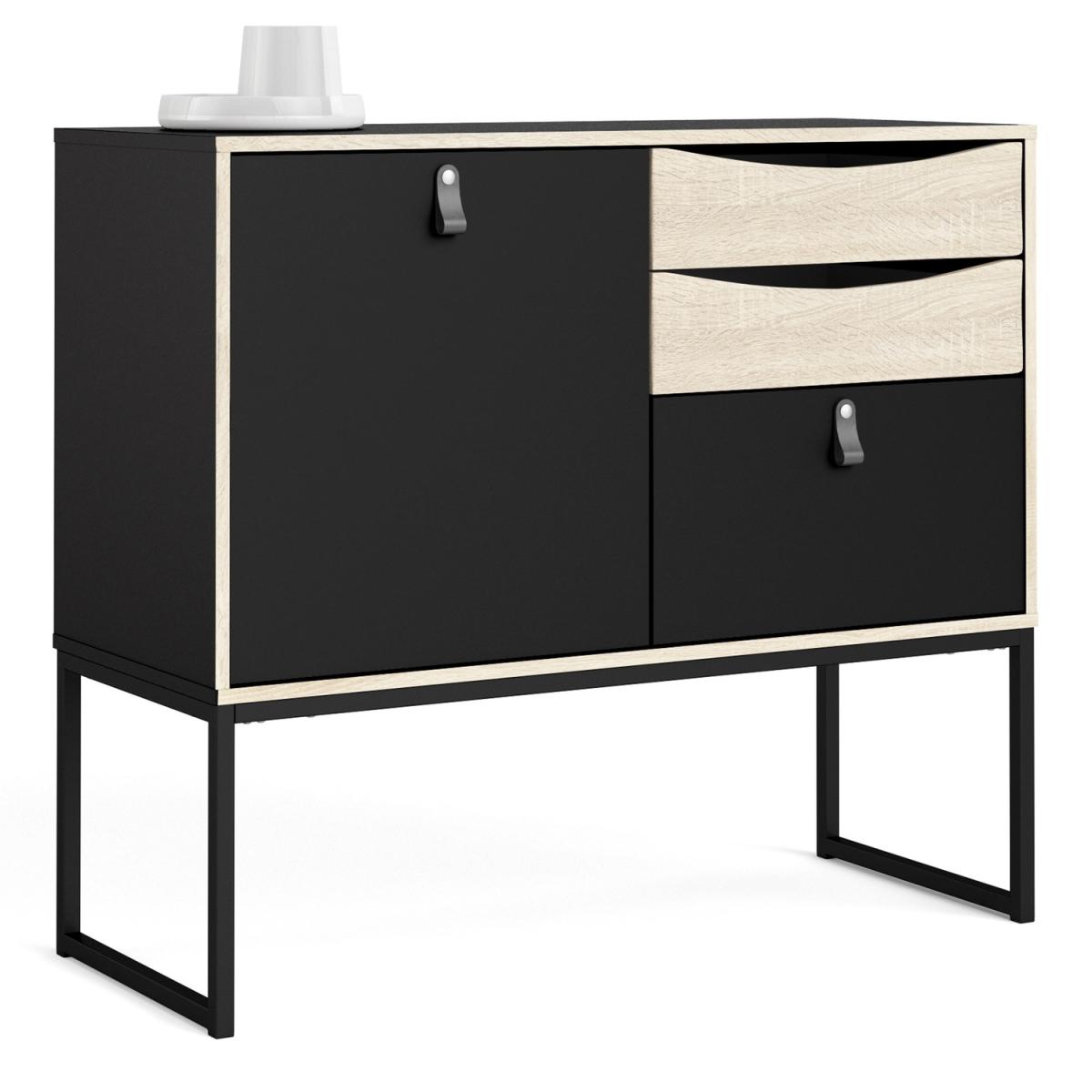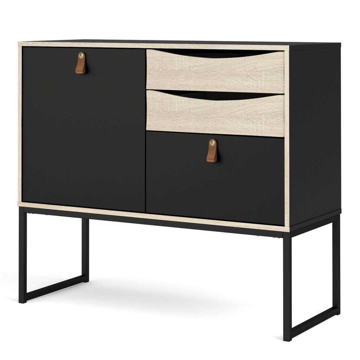 Dimensions H86.6 x W98.7 x D40 cm. The Stubbe sideboard offers a sleek and stylish way of ensuring you have ample storage for all your dining room essentials perfect for a clutter free home. The sideboard comes with brown and black handles for you to choose from. Features. The sideboard has ample storage with 3 drawer and 1 cupboard. The sideboard comes with brown and black handles for you to choose from. Made from high quality laminated board which is resistant to damage and scratches moisture and high temperature. High quality fixings and hinges used throughout. The top surface area is perfect for standing a fresh vase of flowers ornaments photos or an equally stylish lamp Complete with black metalwork on the base Assembly required..