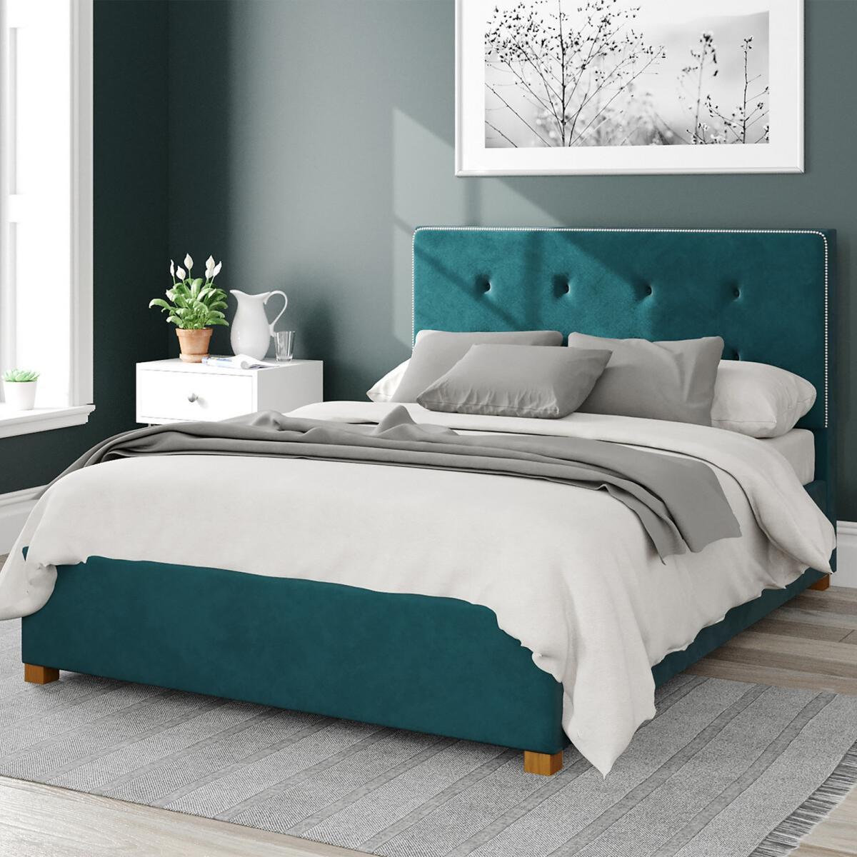 With ample storage space, the refined Presley is perfect for smaller bedrooms. Handmade in the UK, and upholstered in a stunning selection of bold, statement colours it features a button tufted headboard with studded edging. The space-efficient storage compartment is effortlessly accessible with smooth gas lift pistons, providing storage for clothes, shoes and bedroom clutter. It's worth noting that the storage area is not a boarded base, instead a fabric dust protection sheet attaches to the underside of the bed to keep your items neat and clean. Supportive sprung slats mean you can rest easy. Square hand-turned feet, made from solid wood, create an elegant finish. Product details:• Ottoman storage bed• Hand upholstered studded and buttoned headboard design• Upholstered in a luxurious velvet fabric with a soft lustre and plush texture• End-lift mechanism for convenient access• Large storage area with fabric dust protection sheet base• Durable gas pistons ensure the storage area remains securely open for hands-free use• Solid hand-turned hardwood feet• Sprung slatted base• Foam fillings• Made to order and expertly hand finished right here in the UK • Assembly required (2 person recommended)• Mattress not included• 12 month manufacturers warranty• Care advice:Wipe clean with a soft cloth. Composition • Upholstery - Plush Velvet (100% polyester)• Fillings - Foam • Frame - Chipboard, Plywood, MDF, Steel. This product will be dispatched by one of our trusted suppliers. You’ll be contacted by their selected courier about your delivery. Please note this item will be delivered to your doorstep. Please note that this item cannot be delivered to the Offshore Islands, Northern Ireland or the Republic of Ireland. Product Dimensions. Single • Total Dimensions - H112cm x W100cm x L209cm• Storage Area Dimensions - W94 cm x L193 cm x H26 cm • Suitable for use with standard single mattresses (90cm x 190cm)Small Double • Total Dimensions - H112cm x W130cm x L209cm• Storage Area Dimensions - W122 cm x L193 cm x H26 cm • Suitable for use with standard small double mattresses (120cm x 190cm)Double • Total Dimensions - H112cm x W147cm x L209cm• Storage Area Dimensions - W141 cm x L193 cm x H26 cm • Suitable for use with standard double mattresses (135cm x 190cm)King• Total Dimensions - H112cm x W160cm x L219cm• Storage Area Dimensions - W154cm x L204 cm x H26 cm • Suitable for use with standard king mattresses (150cm x 200cm)Super King• Total Dimensions - H112cm x W190cm x L219cm• Storage Area Dimensions - W184 cm x L204 cm x H26 cm • Suitable for use with standard king mattresses (180cm x 200cm)Other dimensions• Headboard Height - 110 cm• Footboard Height: 30cm• Underbed Clearance: 5cm• Ottoman lift mechanism functions with a mattress with weight of up to 60 kg. Package DimensionsSingle:. Parcel 1 - 140cm x 113cm x 12cm, Weight: 12kg Parcel 2 - 212cm x 32cm x 19cm, Weight: 13kg Parcel 3 - 240cm x 180cm x 12, Weight: 18kg. Small Double:Parcel 1 - 140cm x 113cm x 12cm, Weight: 19kg Parcel 2 - 212cm x 32cm x 19cm, Weight: 17kg Parcel 3 - 240cm x 180cm x 12cm, Weight: 22kgDouble: Parcel 1 - 171cm x 113cm x 12cm, Weight: 22kg Parcel 2 - 212cm x 32cm x 19cm, Weight: 18kg Parcel 3 - 240cm x 180cm x 12cm, Weight: 23kgKing:. Parcel 1 - 171cm x 113cm x 12cm, Weight: 27kg Parcel 2 - 212cm x 32cm x 19cm, Weight: 22kg Parcel 3 - 240cm x 180cm x 12cm, Weight: 25kg Super King:Parcel 1 - 201cm x 113cm x 12cm, Weight: 30kg Parcel 2 - 212cm x 32cm x 19cm, Weight: 25kg Parcel 3 - 240cm x 180cm x 12cm, Weight: 27kg