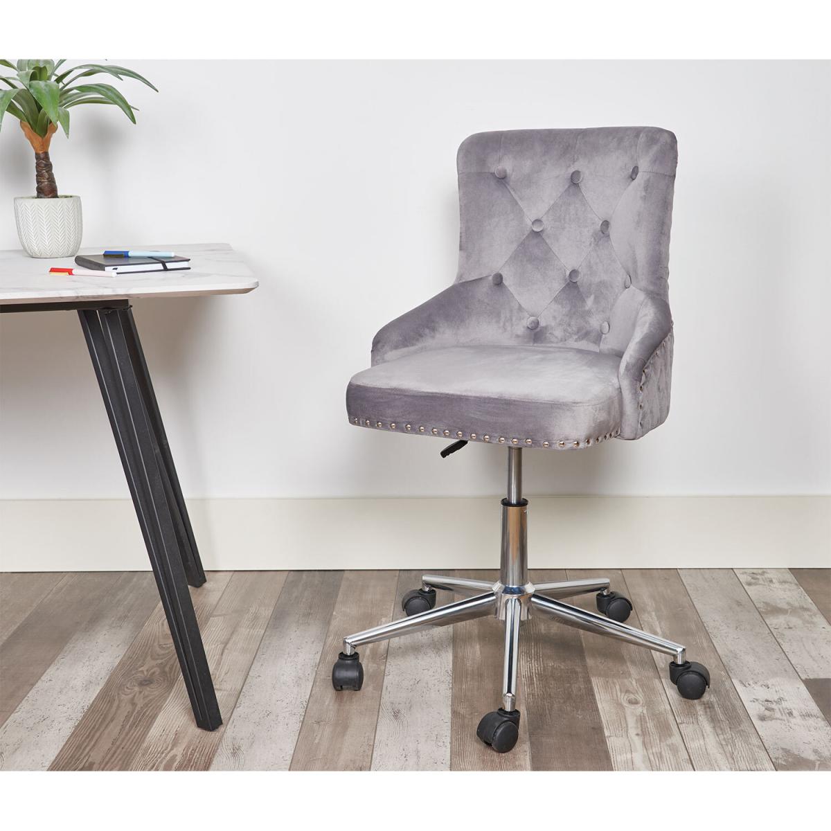 A gorgeous place to sit while working or getting ready, this Studded Home Office Chair will look fabulous in your home or office space. Covered in a layer of lush grey velvet with metallic stud and button details, this chair combines traditional and contemporary styles for a stylish finishing look. Set atop castor wheels with 360° swivel function and an adjustable height, this chair also offers convenience and comfort in your workspace.
