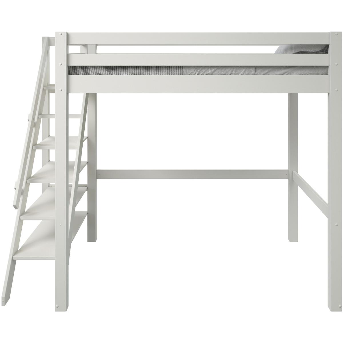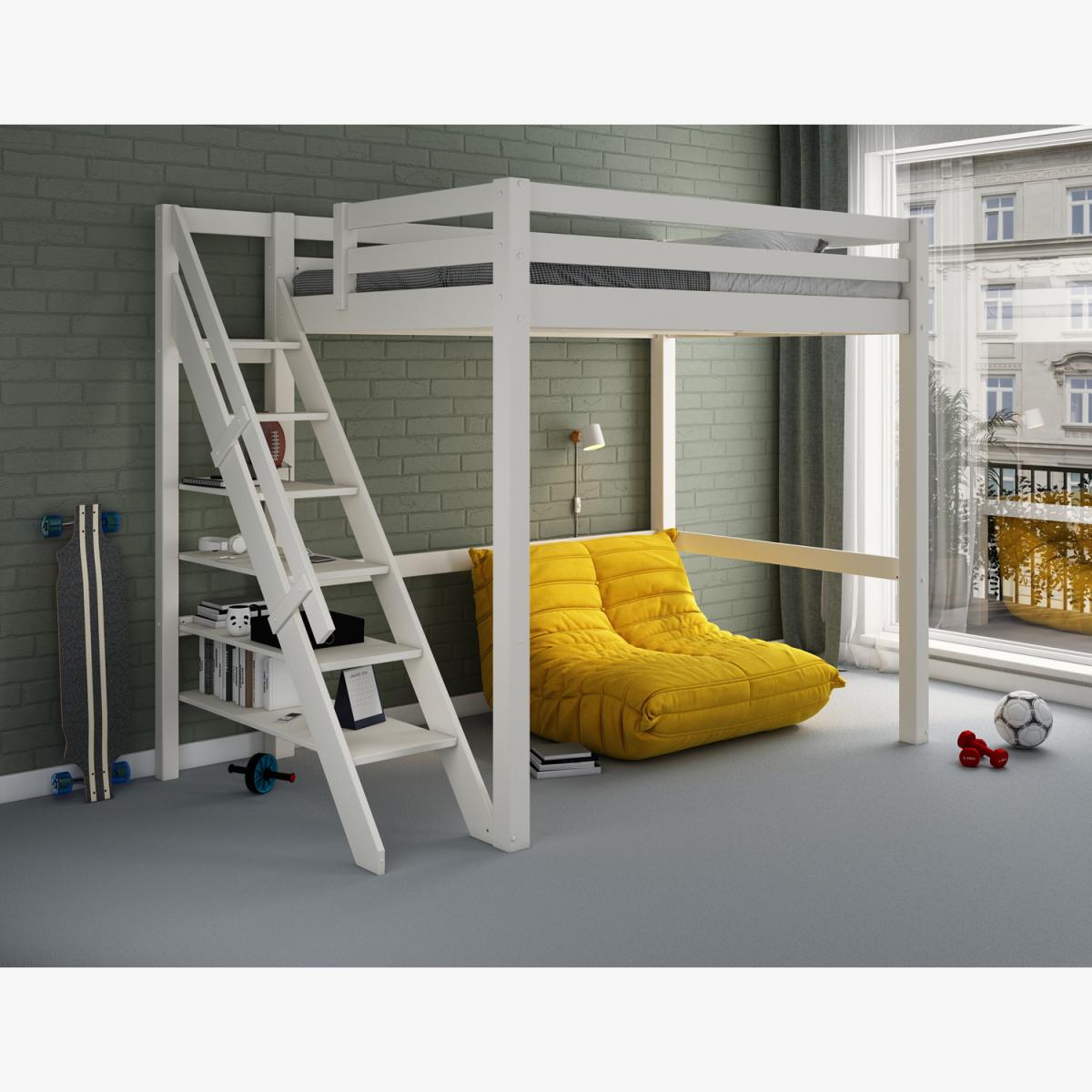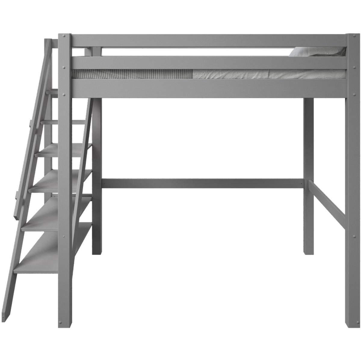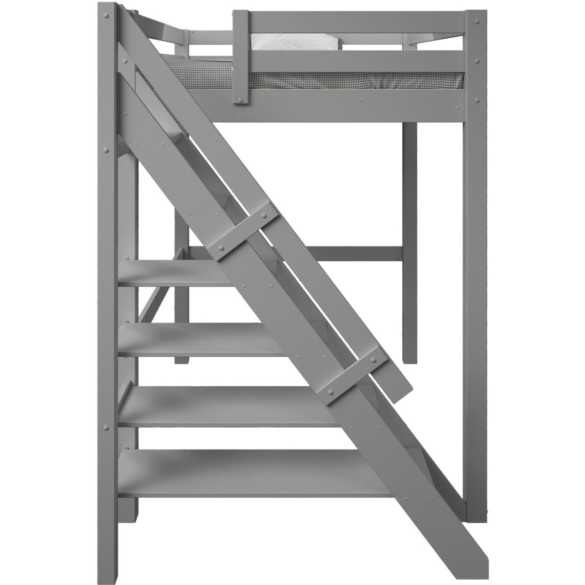 A European double lofted high sleeper bed with an intricately designed side step bookcase. The unique concept design frees valuable floor space in small rooms to provide a space to relax, hang out or even be used as a workspace. The bookcase and shelving step ladder design is accompanied by a handrail for extra safety, along with a small opening at the foot end for easy access. Made from solid wood the Studio Loft bed suits children, teens and also adults. The wide and chunky leg posts give a strong base making for a robust and sturdy frame crafted from Nordic pine that is not only sustainable but long-lasting and durable. Our Studio Loft bed is available in both stone Grey and White. This product is expertly coated in eco-friendly, non-toxic, water-based paint.