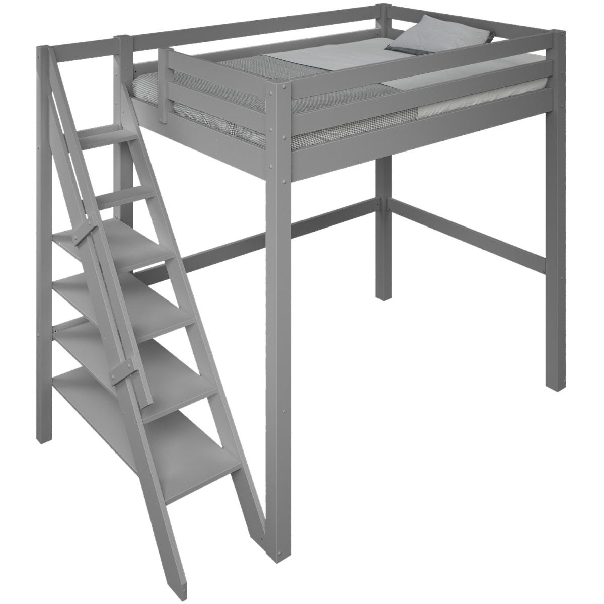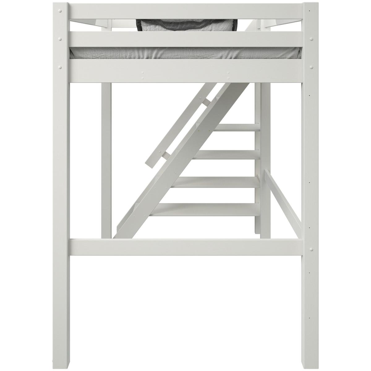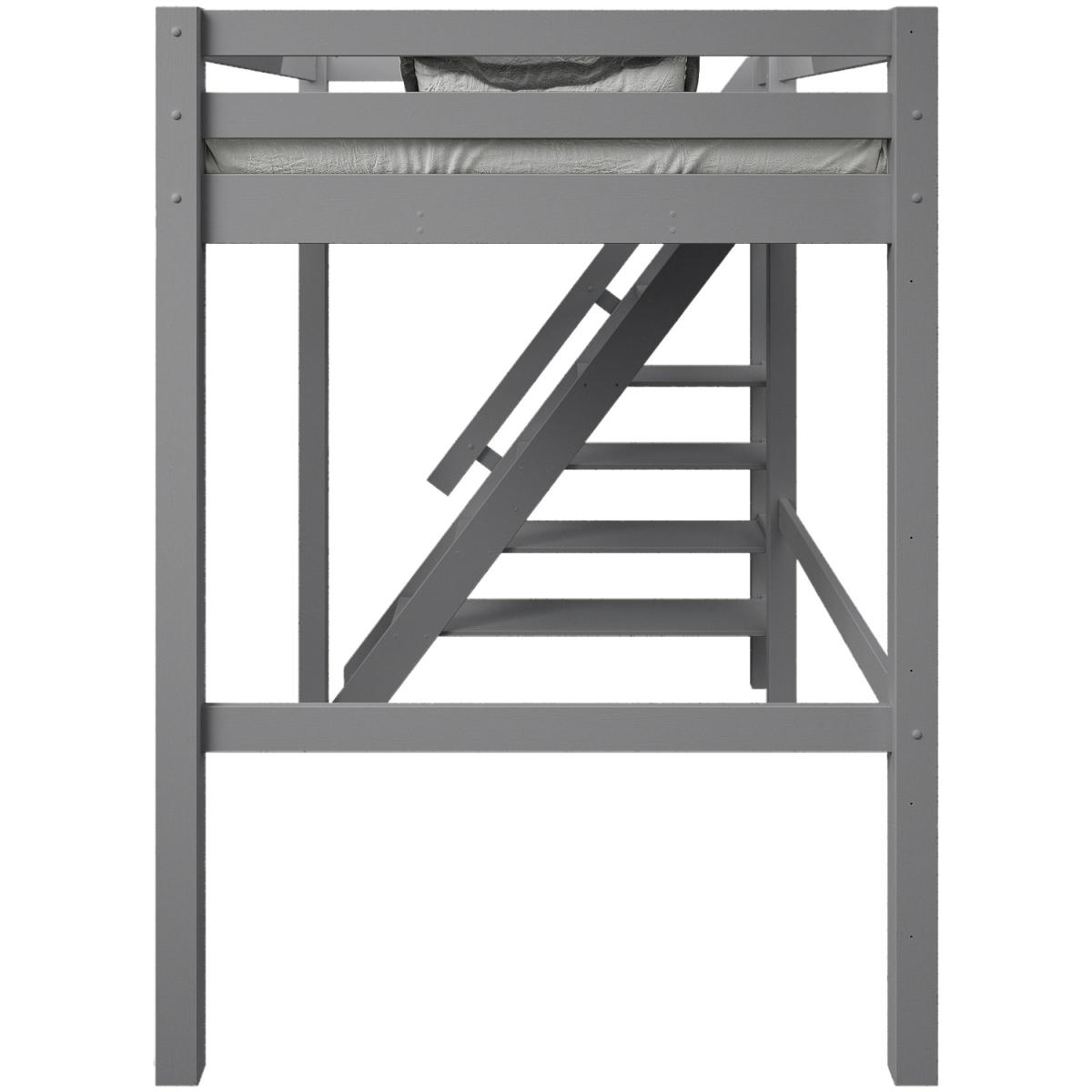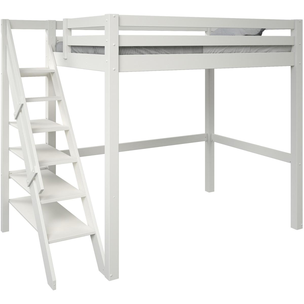 A European double lofted high sleeper bed with an intricately designed side step bookcase. The unique concept design frees valuable floor space in small rooms to provide a space to relax, hang out or even be used as a workspace. The bookcase and shelving step ladder design is accompanied by a handrail for extra safety, along with a small opening at the foot end for easy access. Made from solid wood the Studio Loft bed suits children, teens and also adults. The wide and chunky leg posts give a strong base making for a robust and sturdy frame crafted from Nordic pine that is not only sustainable but long-lasting and durable. Our Studio Loft bed is available in both stone Grey and White. This product is expertly coated in eco-friendly, non-toxic, water-based paint.