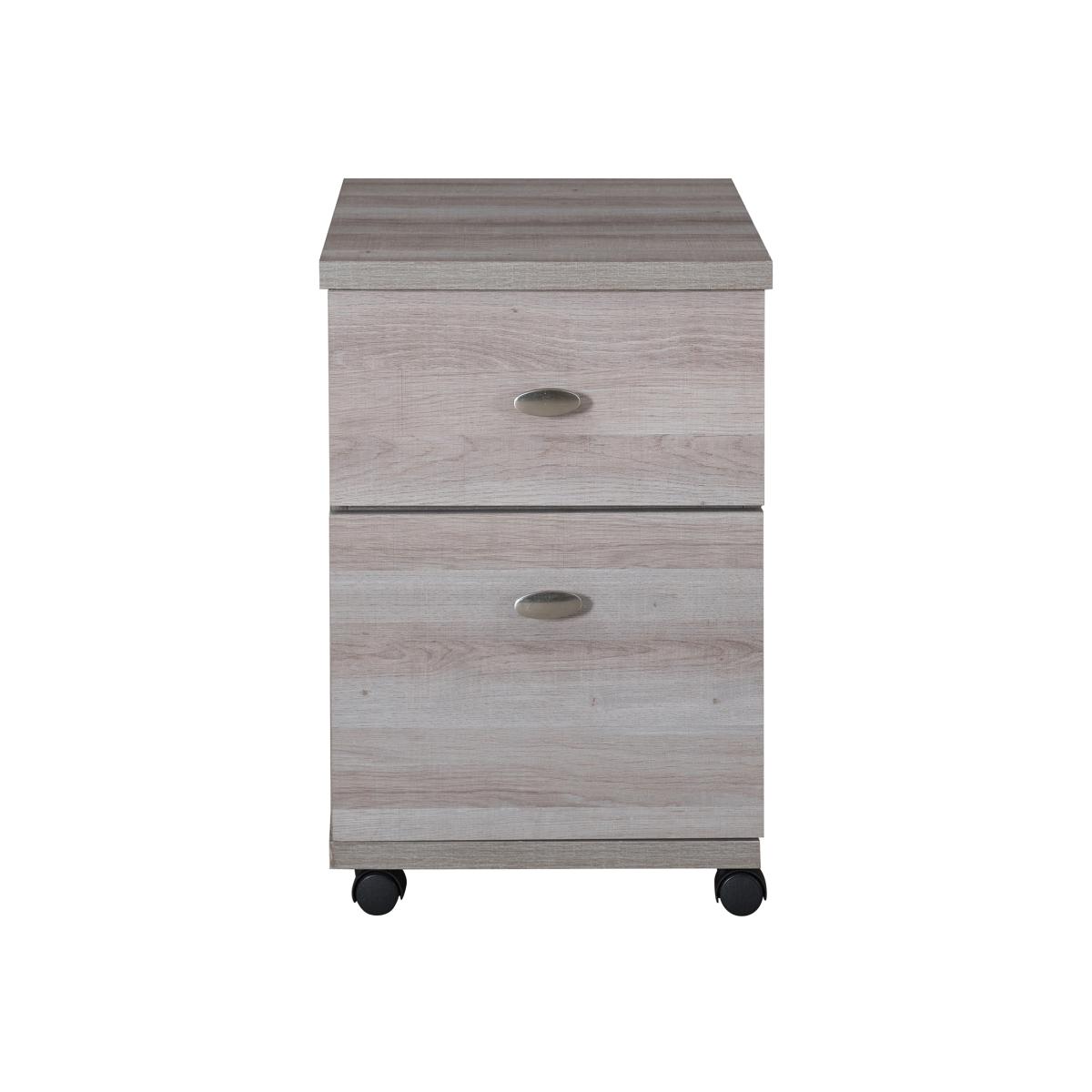Upgrade your home office with this contemporary mobile file cabinet. It features a stylish driftwood finish and durable MDF construction, providing both elegance and functionality. With two spacious drawers and casters for easy mobility, this cabinet keeps clutter organized and out of sight. Compact and easy to assemble, it's perfect for small spaces and comes with a 1-year guarantee.