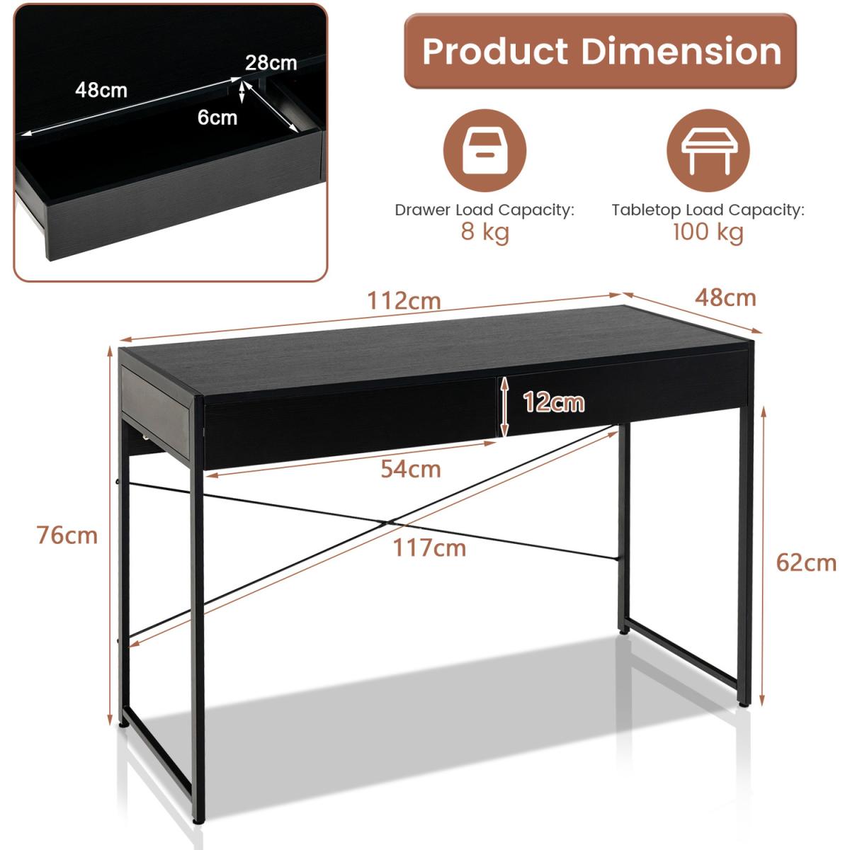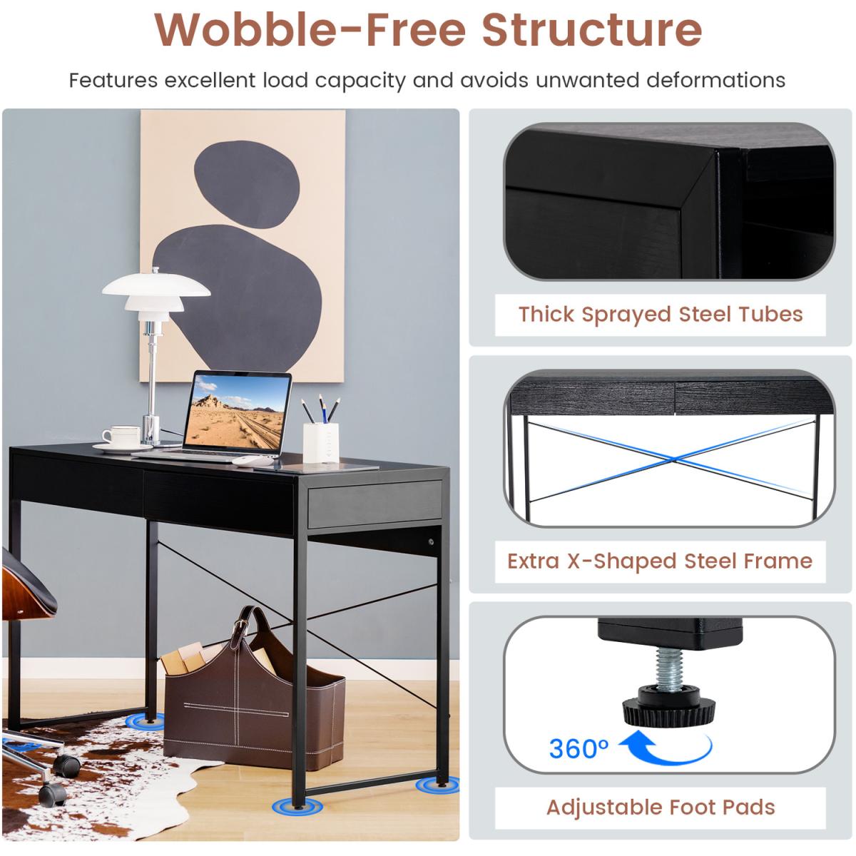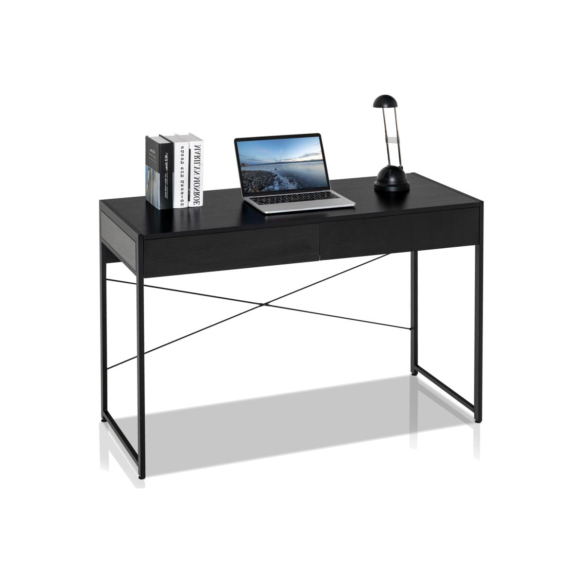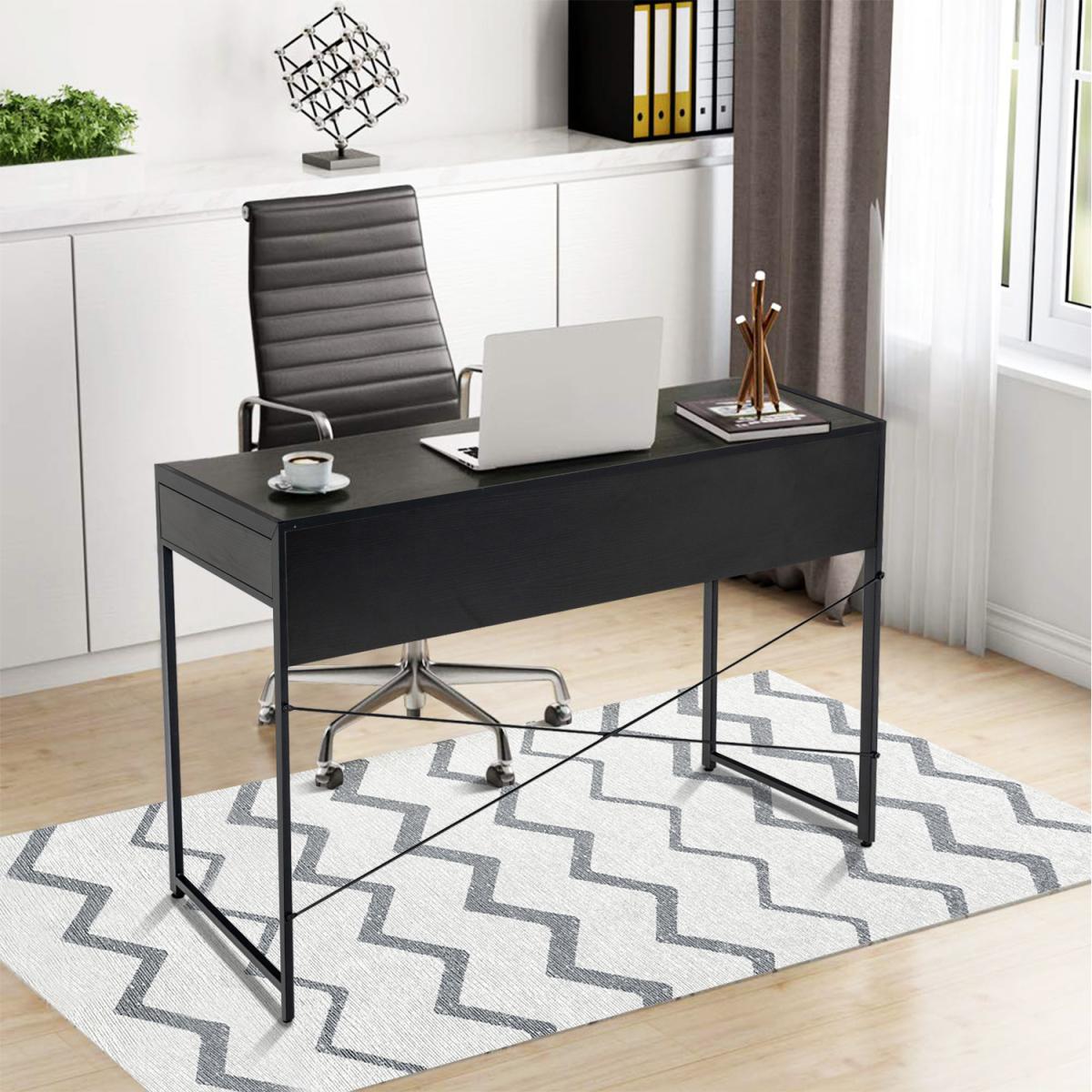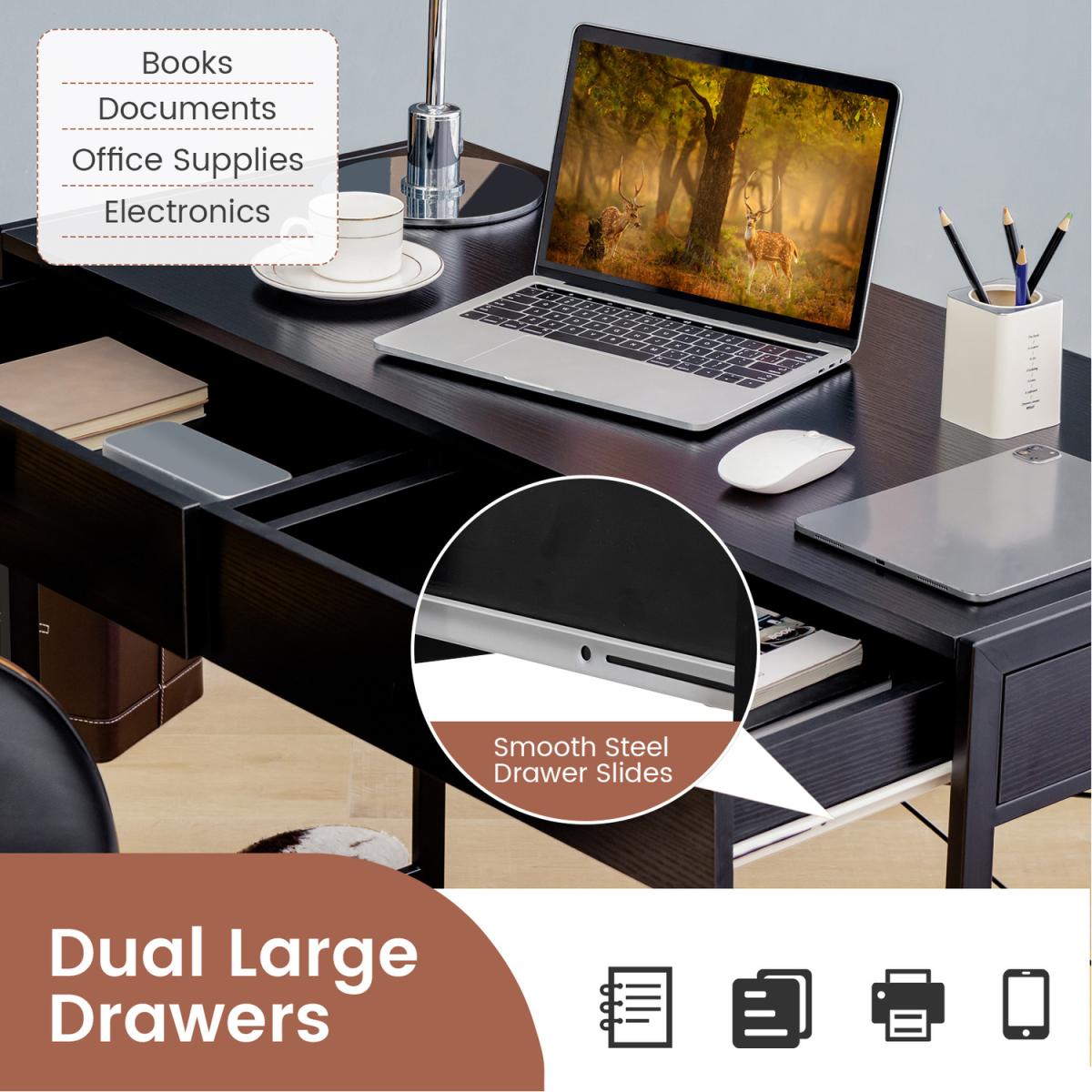 The computer desk with 2 large drawers will give you optimal experience! The tabletop is spacious for your computer, paperwork and other sundries. And the 2 drawers offer a wise storage solution to small and private items. Besides, the drawers are fitted with smooth slides and easy-pull design, ensuring proper use even without handles. What's more, the writing desk is constructed from sturdy steel frame and premium engineered wood, thus to offer superior durability. In addition, featuring X-shaped supporting structure and reinforced crossbars, the steel frame boasts superior stability and large bearing capacity. In all, the desk is a perfect choice for working, gaming and makeup.