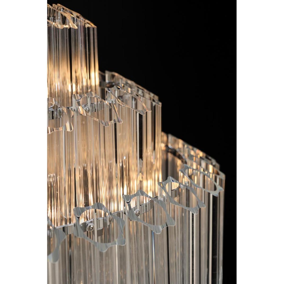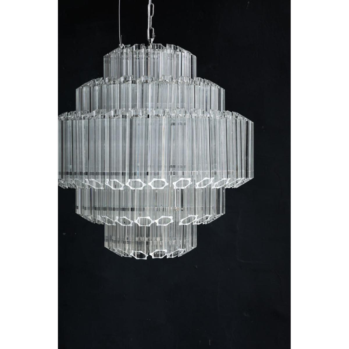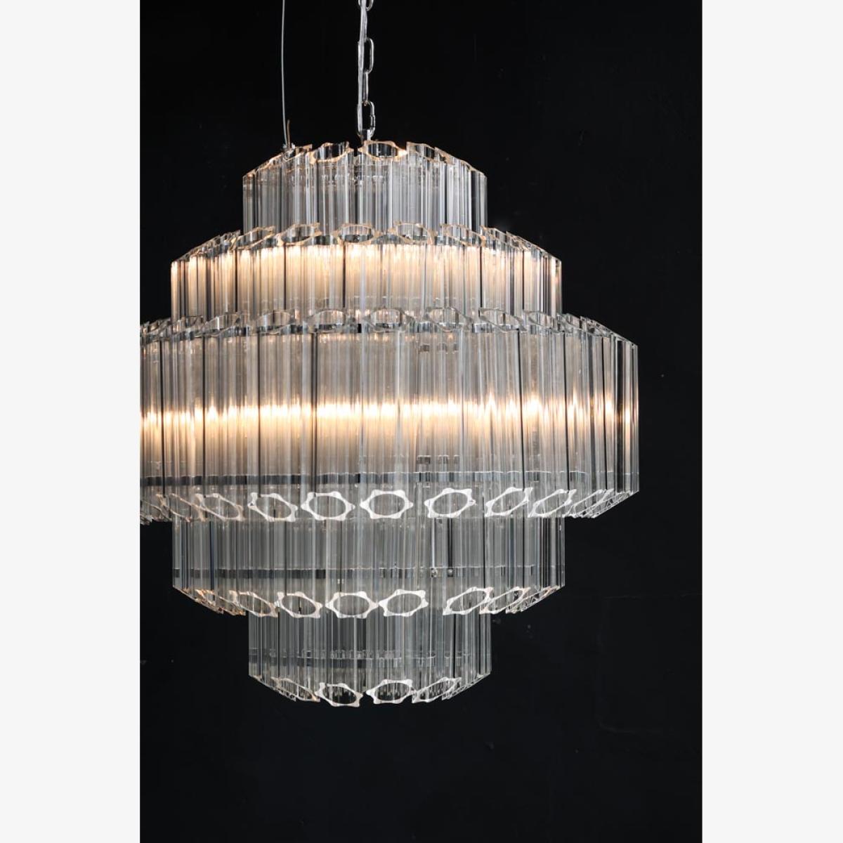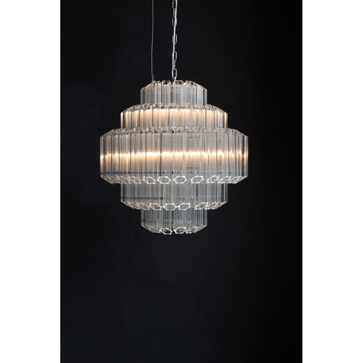 About The Stunning Art Deco Crystal Chandelier Showcasing a glamorous vintage-inspired design, the Stunning Art Deco Crystal Chandelier will make a showstopping statement in your interior décor. Showcasing five layers of fine columns of crystal glass in a striking linear structure, this extraordinary chandelier looks like one of those you’d find in a luxury hotel. Fixed into an iron frame with a shiny chrome finish, this tiered chandelier exudes a wonderful mix of modern meets vintage styles. This glass chandelier measures 65cm in height and 65cm in diameter with an overall height of 175cm including the chain. The flex length is 130cm. Why We Think You’ll Love The Art Nouveau Chandelier Based on a traditional chandelier, this crystal chandelier just screams art deco glitz and glamour! Making a statement just about anywhere you choose to style it, the glass panels will not only help it envelop a radiant glow but it will also inject a striking new dimension into your interior scheme. Luxurious and theatrical, this statement chandelier is most definitely a sight for sore eyes! Where To Style The Large Crystal Chandelier This unique chandelier would make a magnificent hallway light as it will inject instant wow factor from the moment you walk through the door. Displaying this extraordinary chandelier in your hallway also sets the tone for the rest of your interior décor throughout the house, so why not introduce your home with some showstopping glamour! This crystal ceiling light would also make a charming statement hung above a grand dining table or as the central light in a luxurious living room.