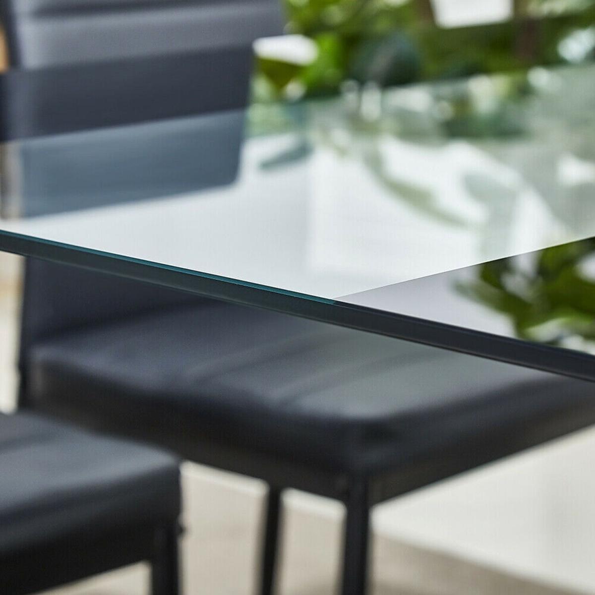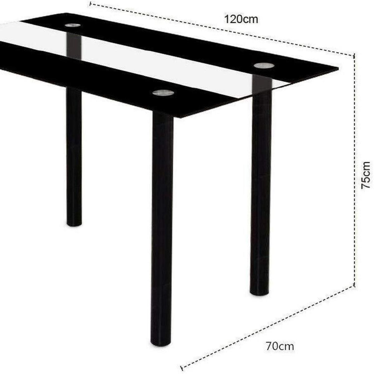 A stunning glass dining table only (Chairs not included). Table with 2 black stripes and clear centre. Safety tempered glass dining table top is 8mm thick and up to four times stronger than regular glass. Add elegance to your home kitchen and dining room. Glass top dining table set is constructed of rust-resistant. All accessories and instructions are included.