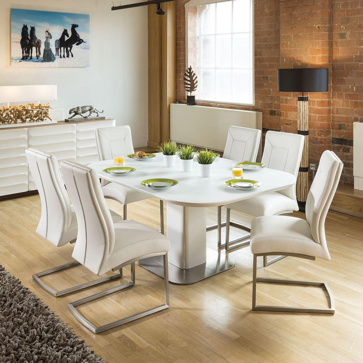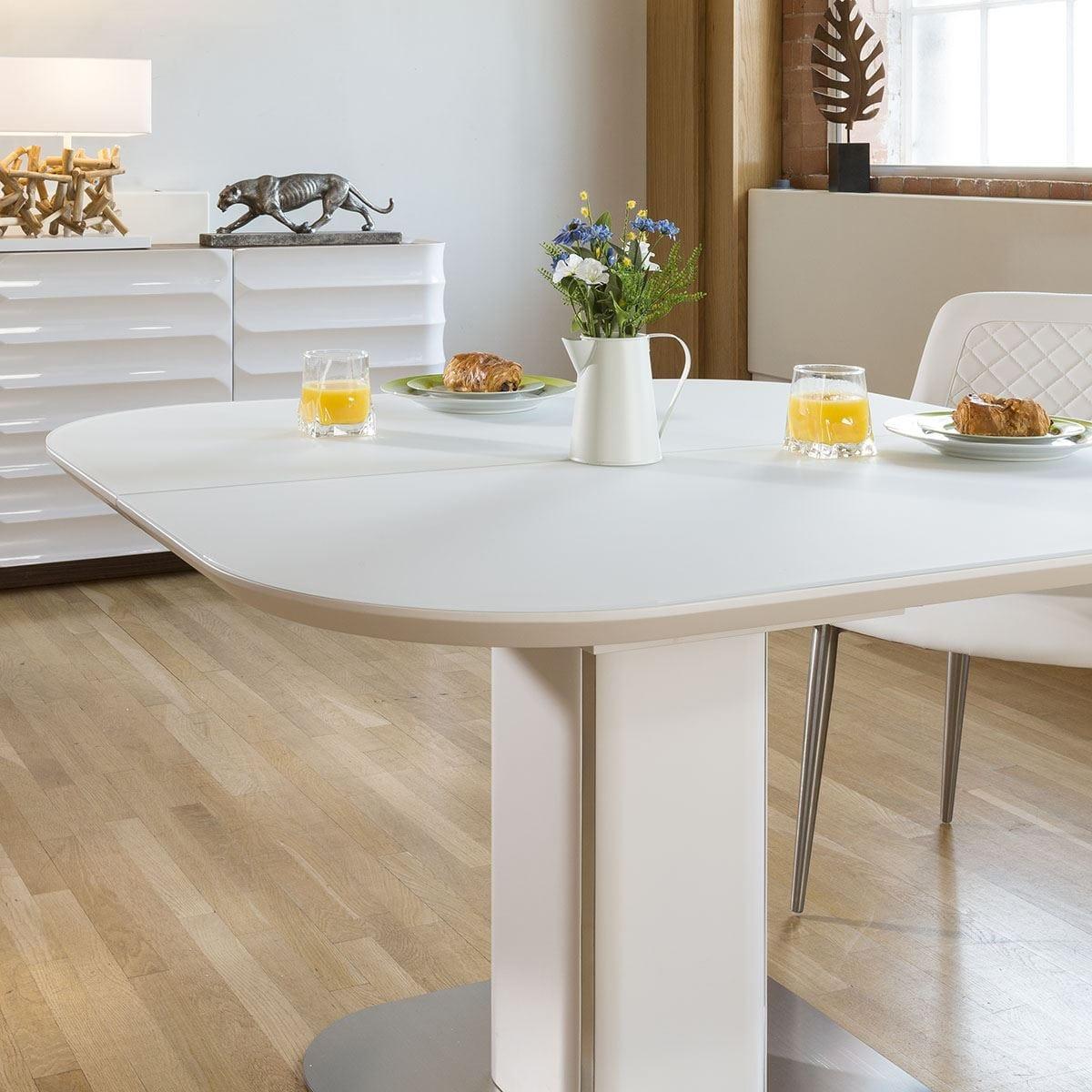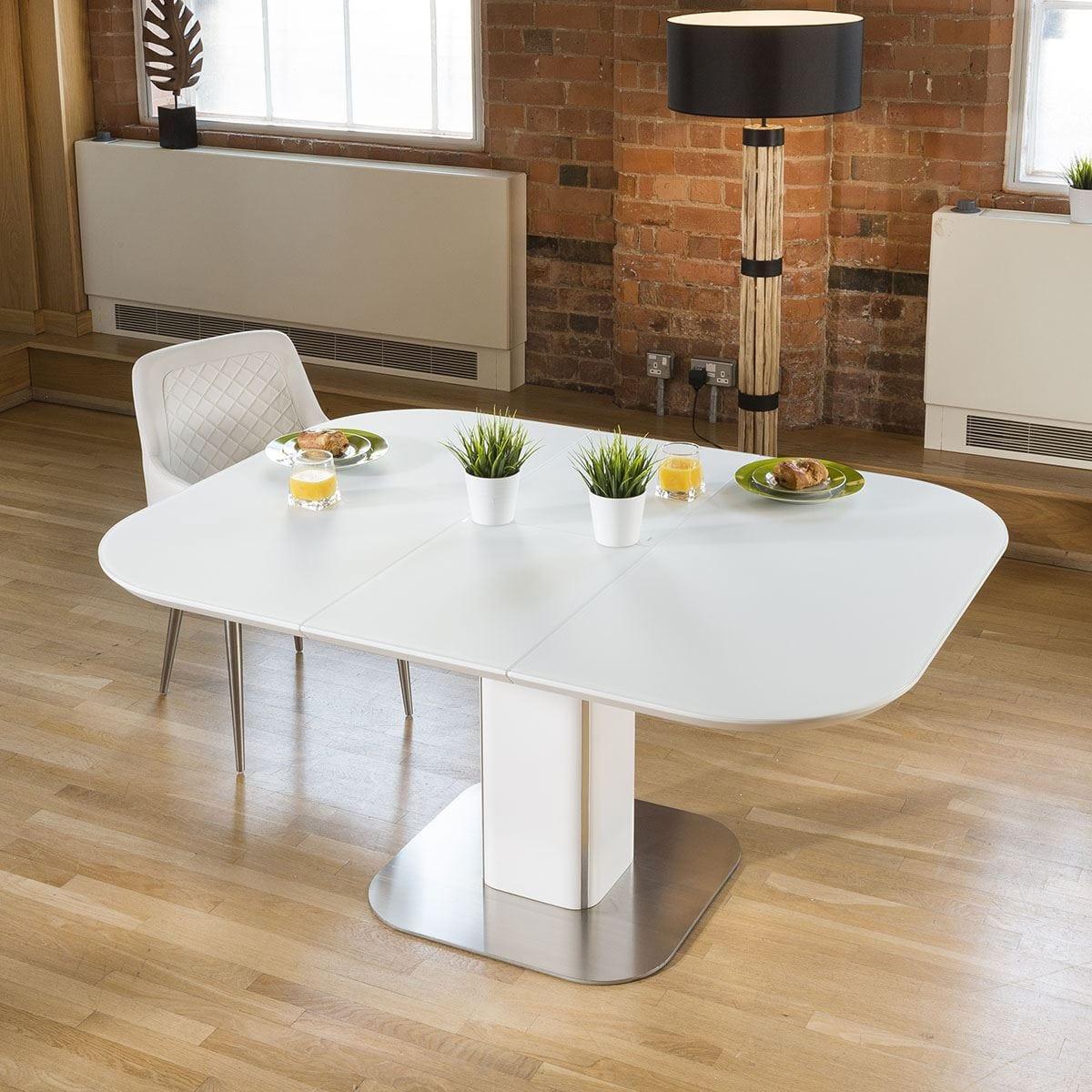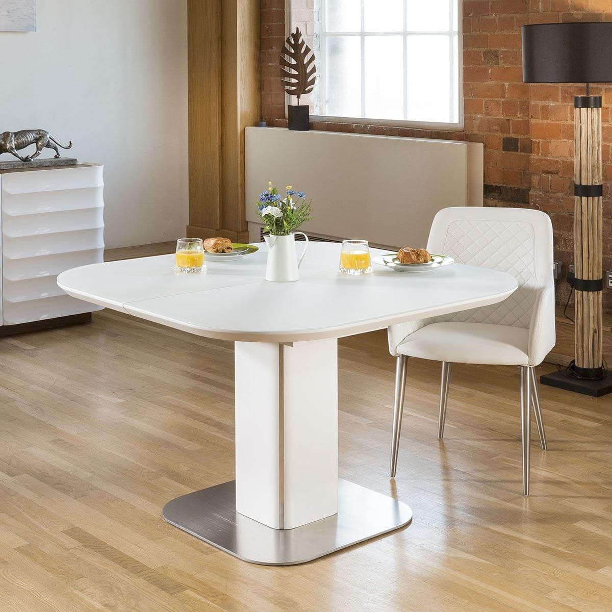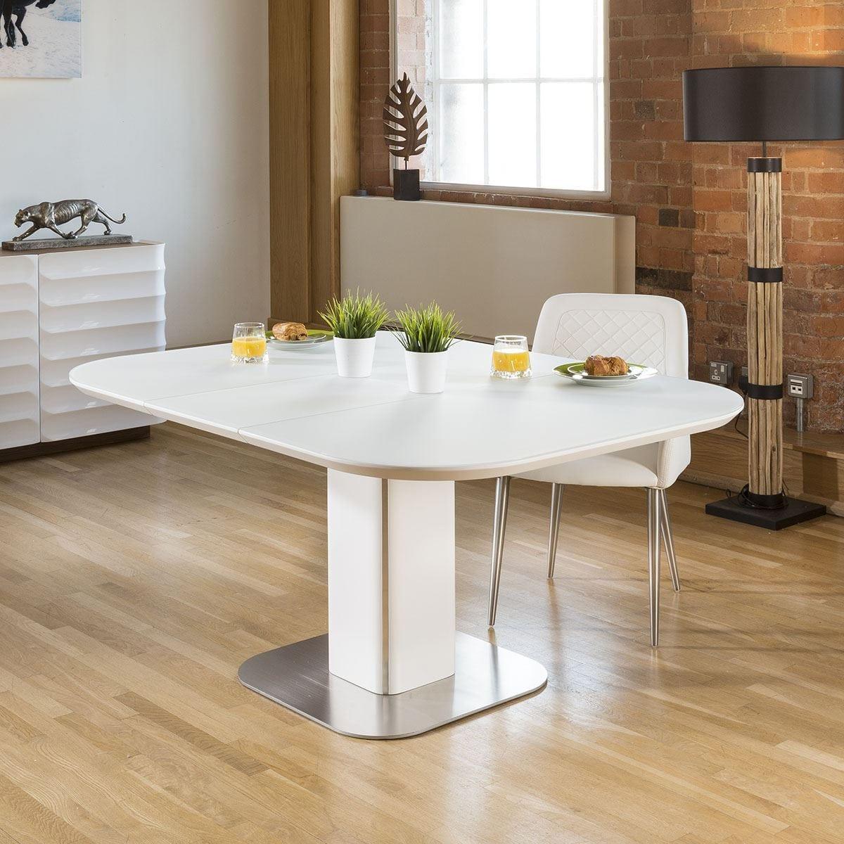 High Quality Extending Square Dining Table with Matt White Glass Top,White Matt Stem and Solid Stainless Steel Base. A lovely square dining table extending to rectangular for seating upto 6 people comfortably. Features include Stainless steel and super-smooth extension mechanism. Very strong and sturdy for a central stem table. W160cm D120cm H76cm Modern Design Premium Quality Furniture