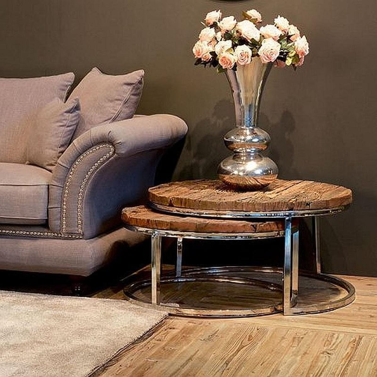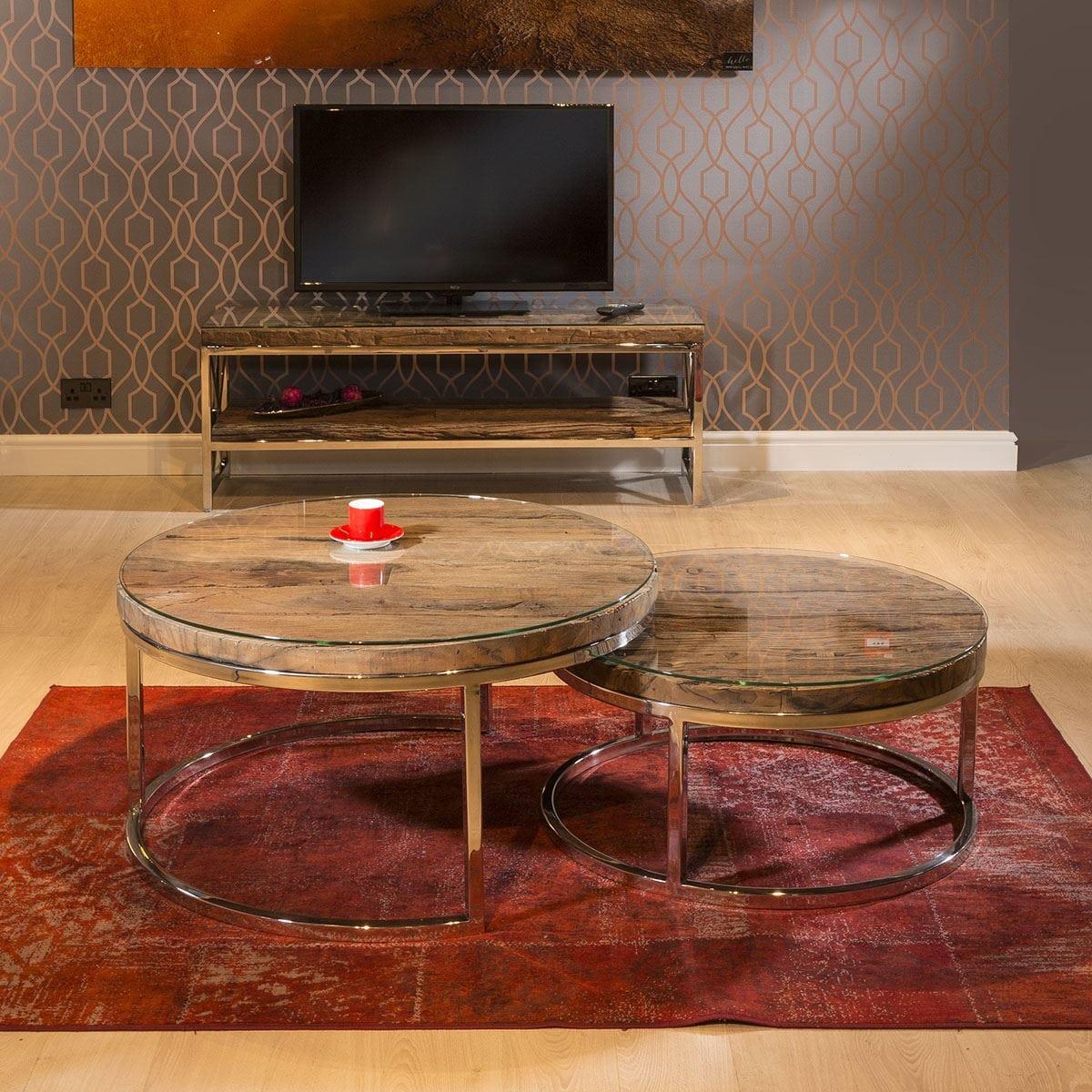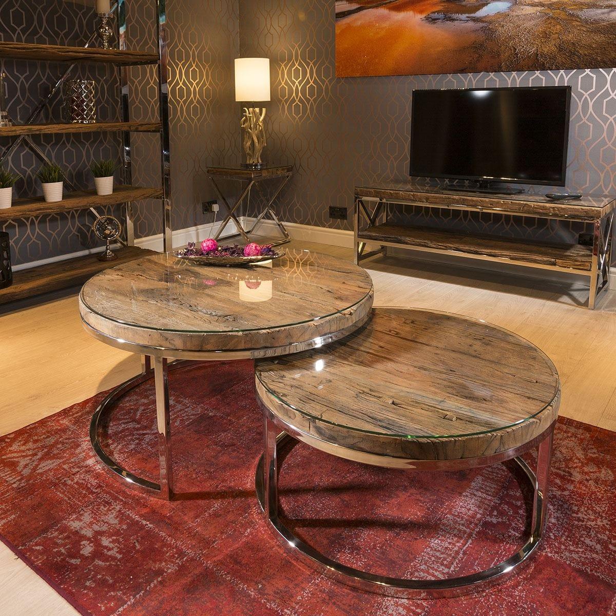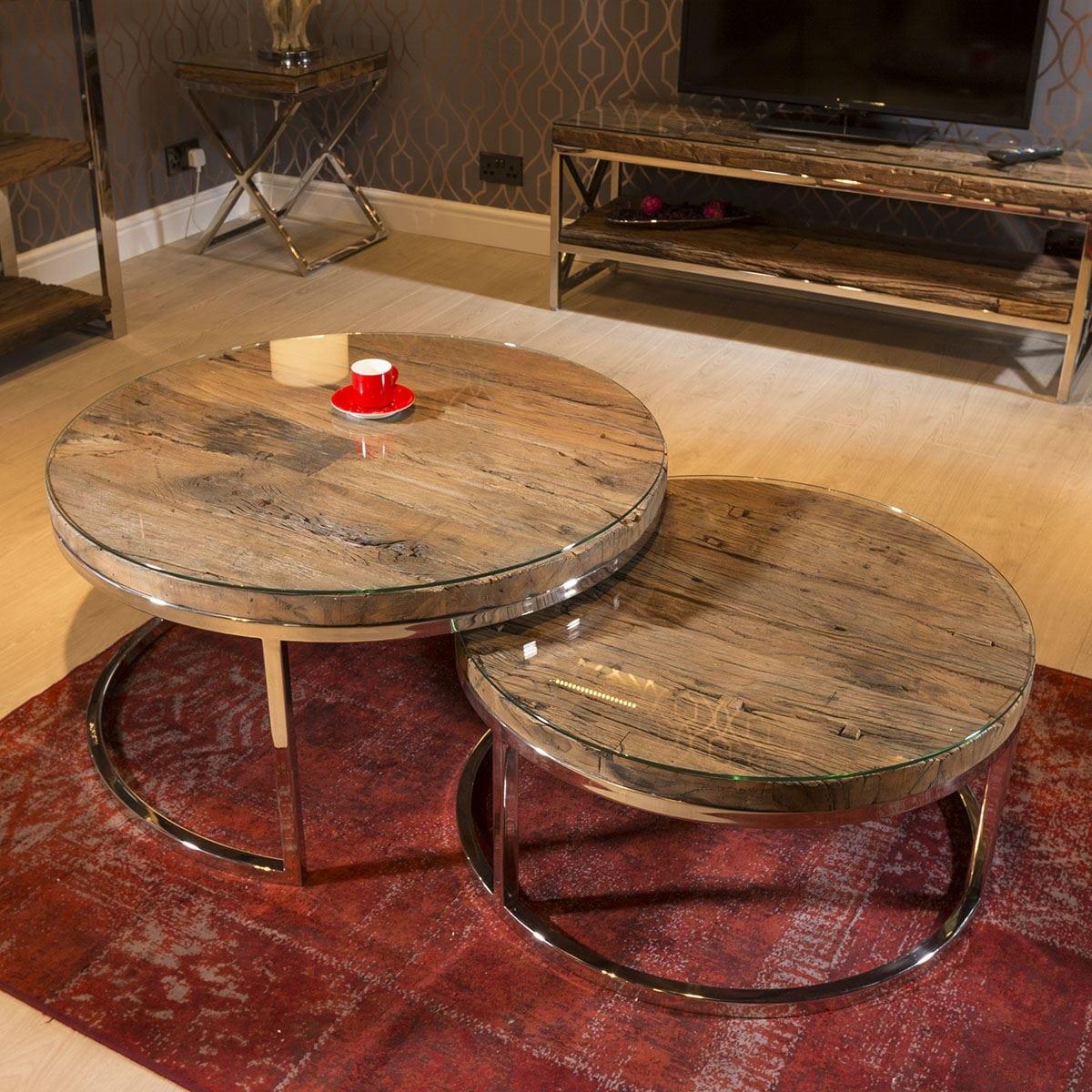 Gorgeous Glass Topped Large Recycled Hardwood Double Round Coffee Tables. Stunning mix of 80+ year old wooden pre-used Sal wood planks, bright mirror finish stainless steel legs and clear glass top. The 100% upcycled wood is between 80 and 100 years old and retrieved from used railway sleepers in the Indian sub-continent. All planks are carefully cleaned, treated and selected for strength, longevity and character. Of course the orginal materials will be sympathetically reworked and made into a heavy duty table ready for the next 100 year adventure. This authentic history give each table a beautifully unique character and charm. Expect to see clear signs of its former life with colour variations, cracks, wear etc W92cm D92cm H46cm Reclaimed Wood Top With Glass Polished Metal Base