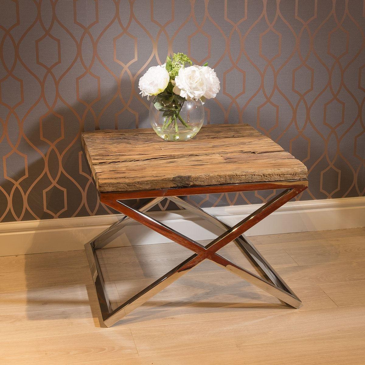 Beautiful Recycled Hardwood Side Table. Stunning mix of 80+ year old wooden pre-used Sal wood planks & bright mirror finish stainless steel legs. The 100% upcycled wood is between 80 and 100 years old and retrieved from used railway sleepers in the Indian sub-continent. All planks are carefully cleaned, treated and selected for strength, longevity and character. Of course the orginal materials will be sympathetically reworked and made into a heavy duty table ready for the next 100 year adventure. This authentic history give each table a beautifully unique character and charm. Expect to see clear signs of its former life with colour variations, cracks, wear etc W60cm D60cm H45cm Reclaimed Wood Top Polished Metal Base