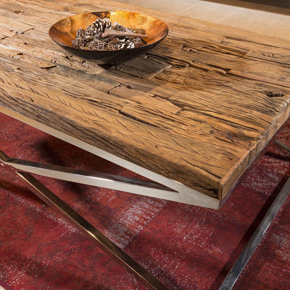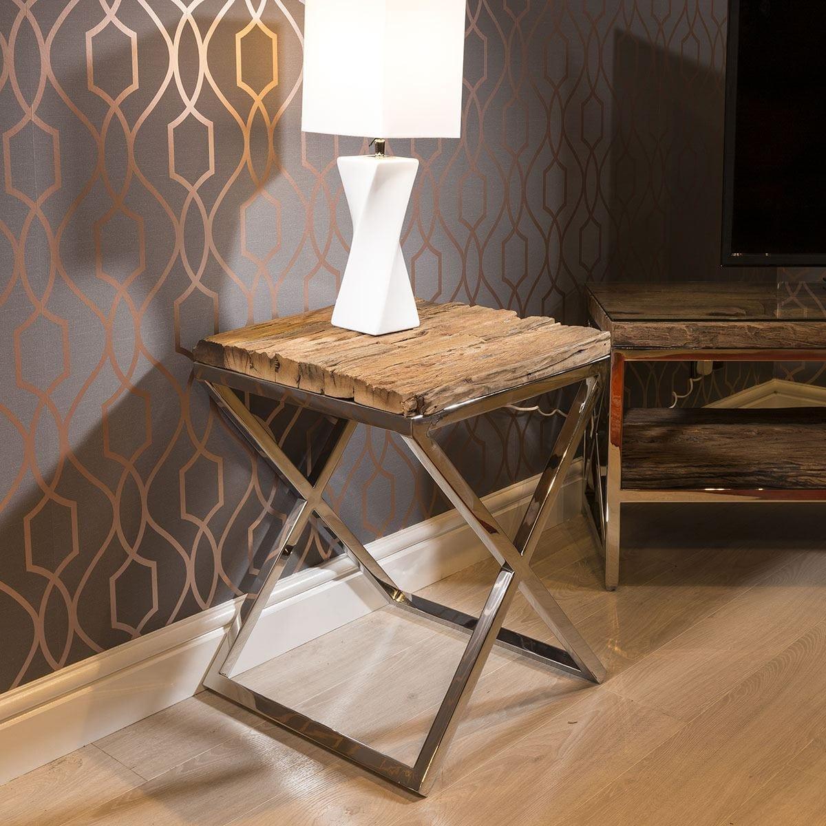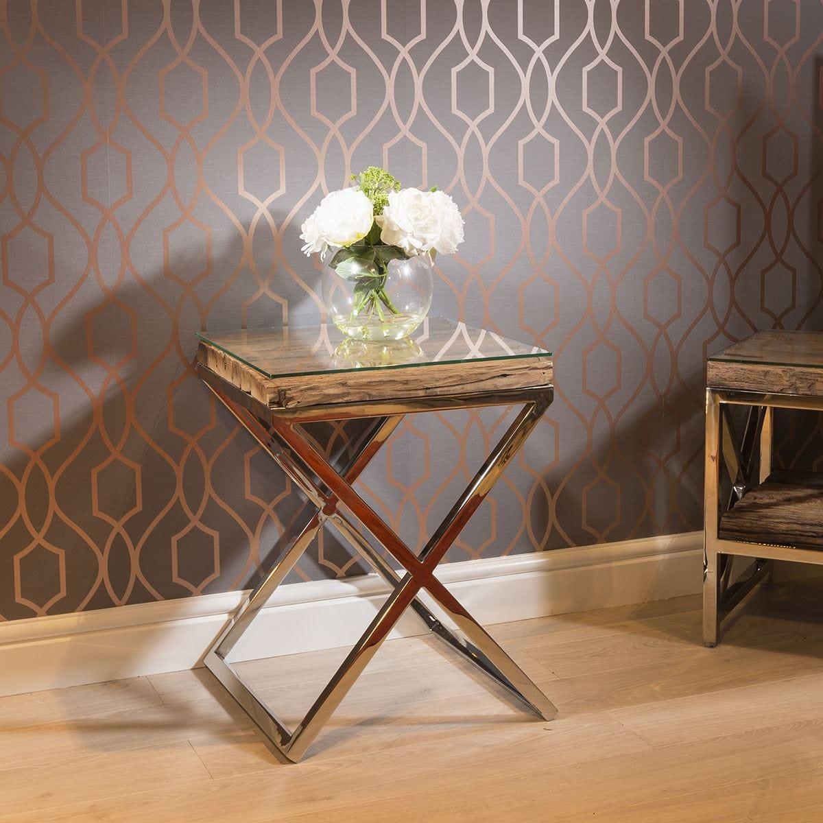 Amazing Glass Topped, Recycled Hardwood Side Table. Stunning mix of 80+ year old wooden pre-used Sal wood planks, bright mirror finish stainless steel legs and clear glass top. The 100% upcycled wood is between 80 and 100 years old and retrieved from used railway sleepers in the Indian sub-continent. All planks are carefully cleaned, treated and selected for strength, longevity and character. Of course the orginal materials will be sympathetically reworked and made into a heavy duty table ready for the next 100 year adventure. This authentic history give each table a beautifully unique character and charm. Expect to see clear signs of its former life with colour variations, cracks, wear etc W45cm D45cm H58cm Reclaimed Wood Top With Glass Polished Metal Base