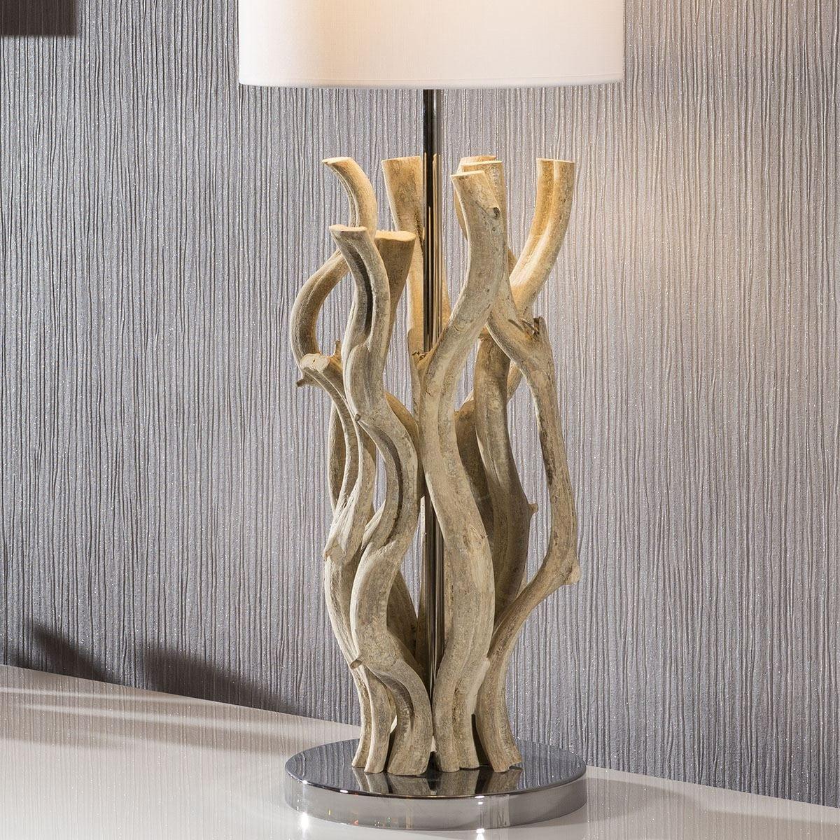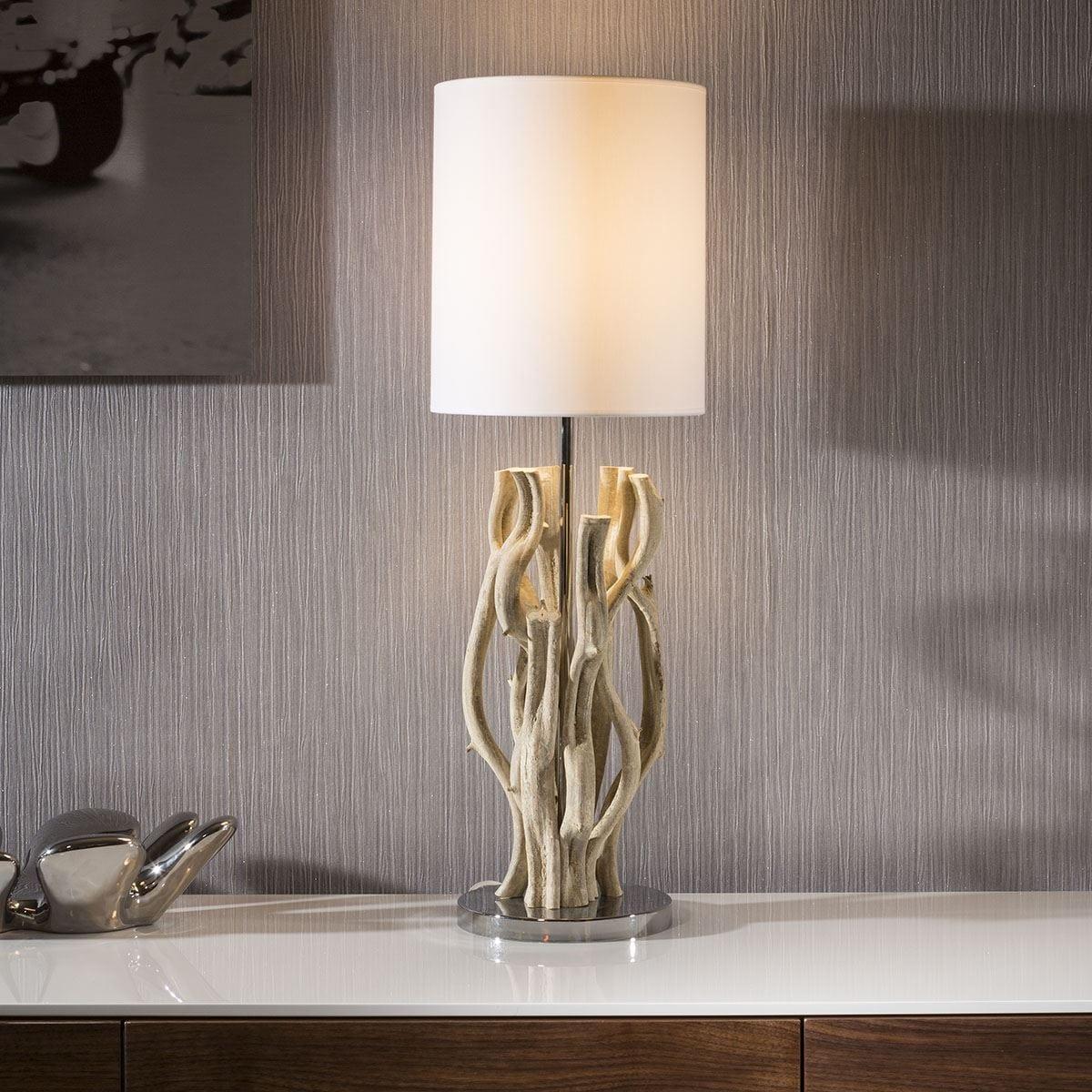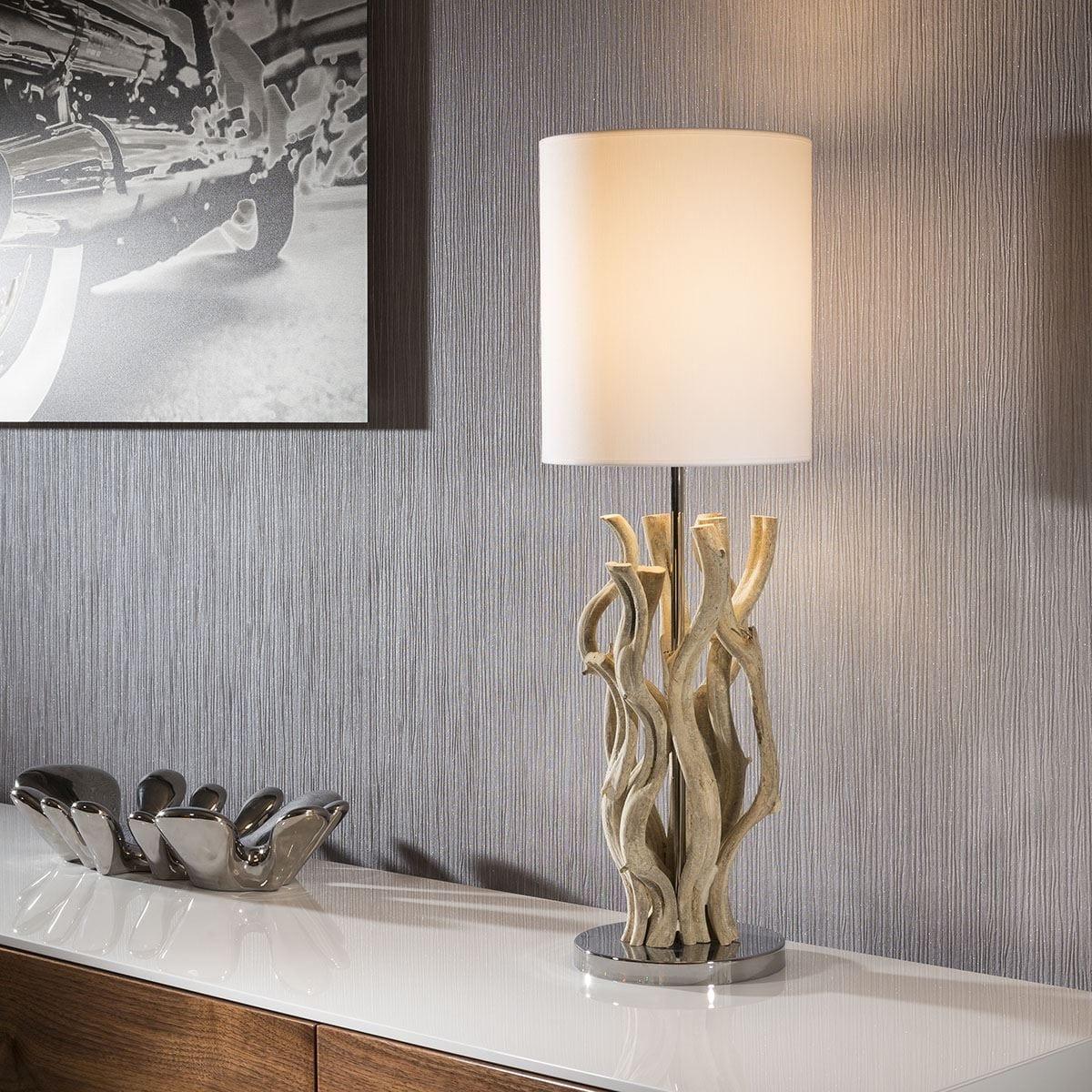 Unique Modern Driftwood Table Lamp. A Truly Stunning & Unique Driftwood Design with Elegant white cotton shade. All mounted on a polished steel base base. Made by Europe's top lighting manufacturer, please do not confuse with cheap Asian copies. Please note this is a handmade unique driftwood product, each one will be different. This lamp requires 1 x bulb (not supplied). W25cm D25cm H75cm Quatropi premium lighting Modern design