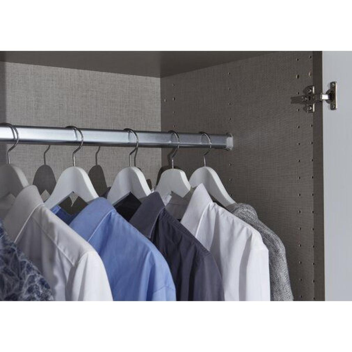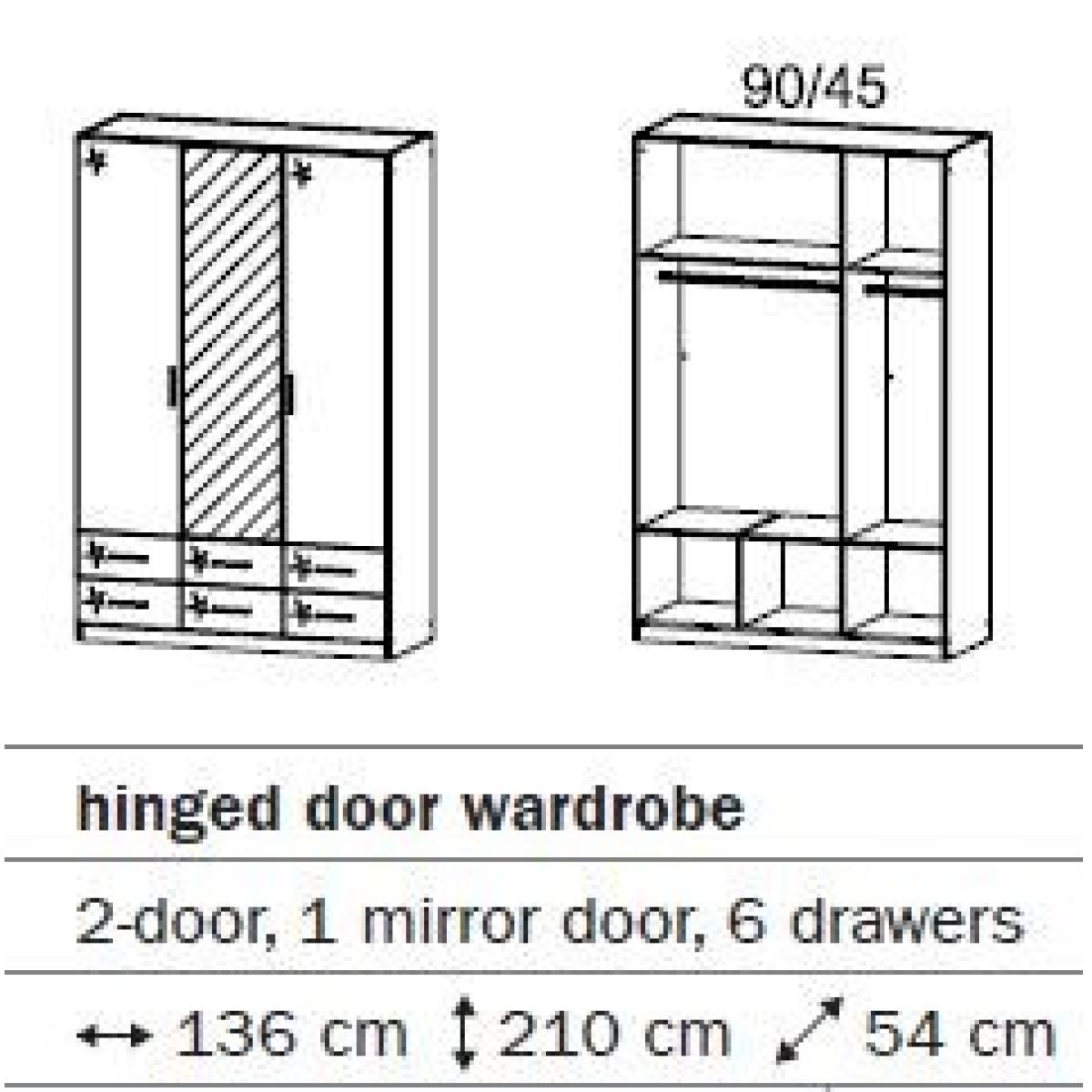This Stuttgart hinged door wardrobe offers a chic stylish design. The wardrobe is available in either a 2 door, 3 door or 4 door design with a combination of storage drawers, mirrored and plain fronts. The Stuttgart range is available in a range of finishes including two high polish colours. Combining high quality craftsmanship with understated elegance this wardrobe oozes with style. Sleek, clean lines make up the stunning wardrobe that offers plenty of hanging space to neatly store away clothes. This wardrobe is the tallest size in the range boasting even further space to store away items without taking up any further floor space. The mirrored fronts will project the light beautifully and offer a practical reflective area to get ready in. The aluminium coloured handles add to the contemporary feel. Finished to a very high standard this wardrobe will last for many years. Soft Grey Polished fronts with 1 mirrored door 6 drawers Alpine White Carcase Assembly Required Dimensions: 136cm W x 54cm D x 210cm H Hanging Space: 124cm. Top shelf can be removed for 160cm.