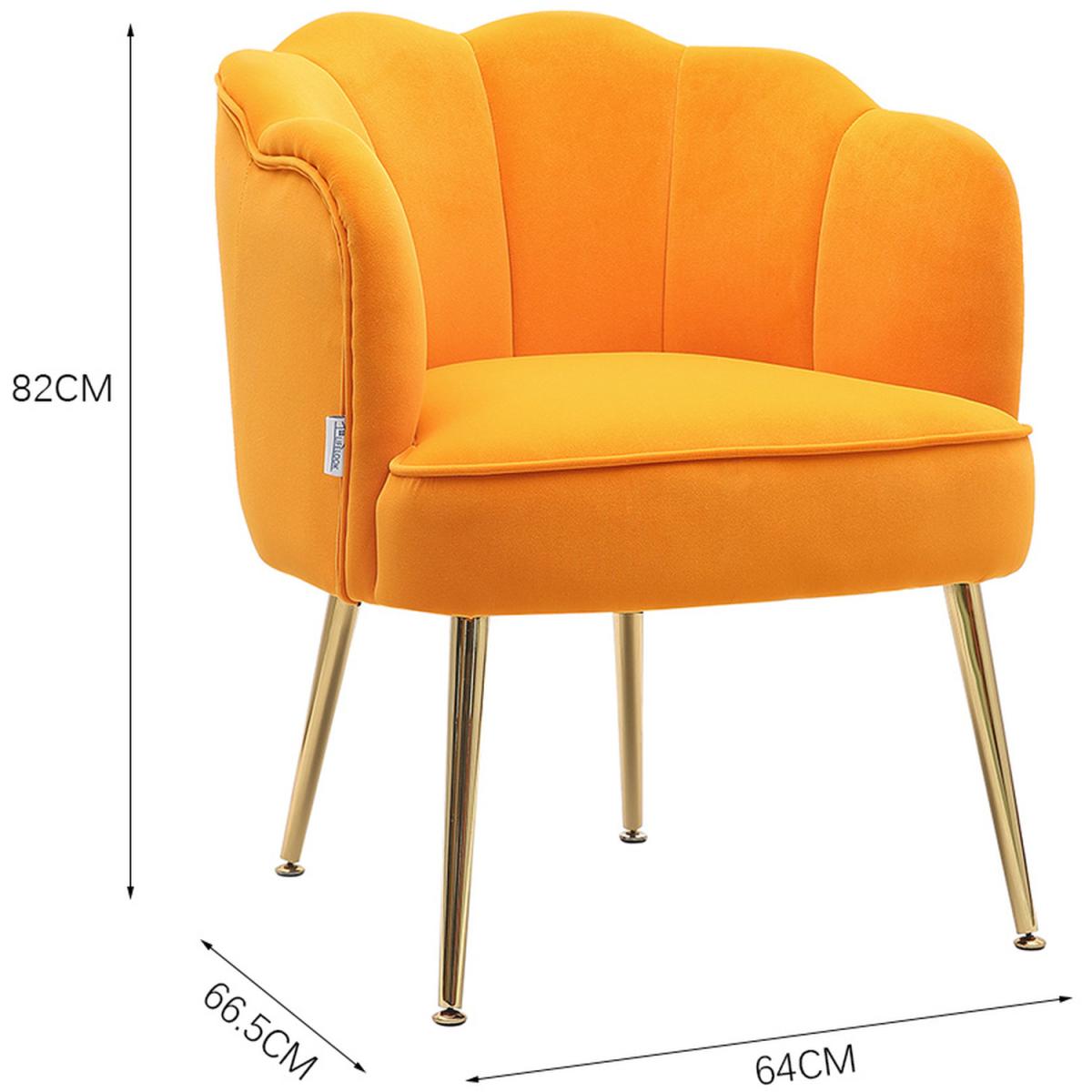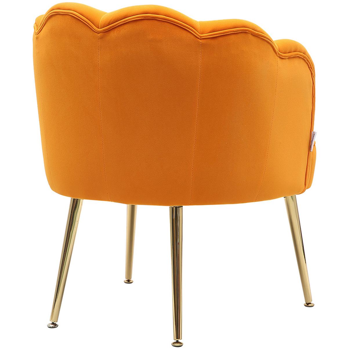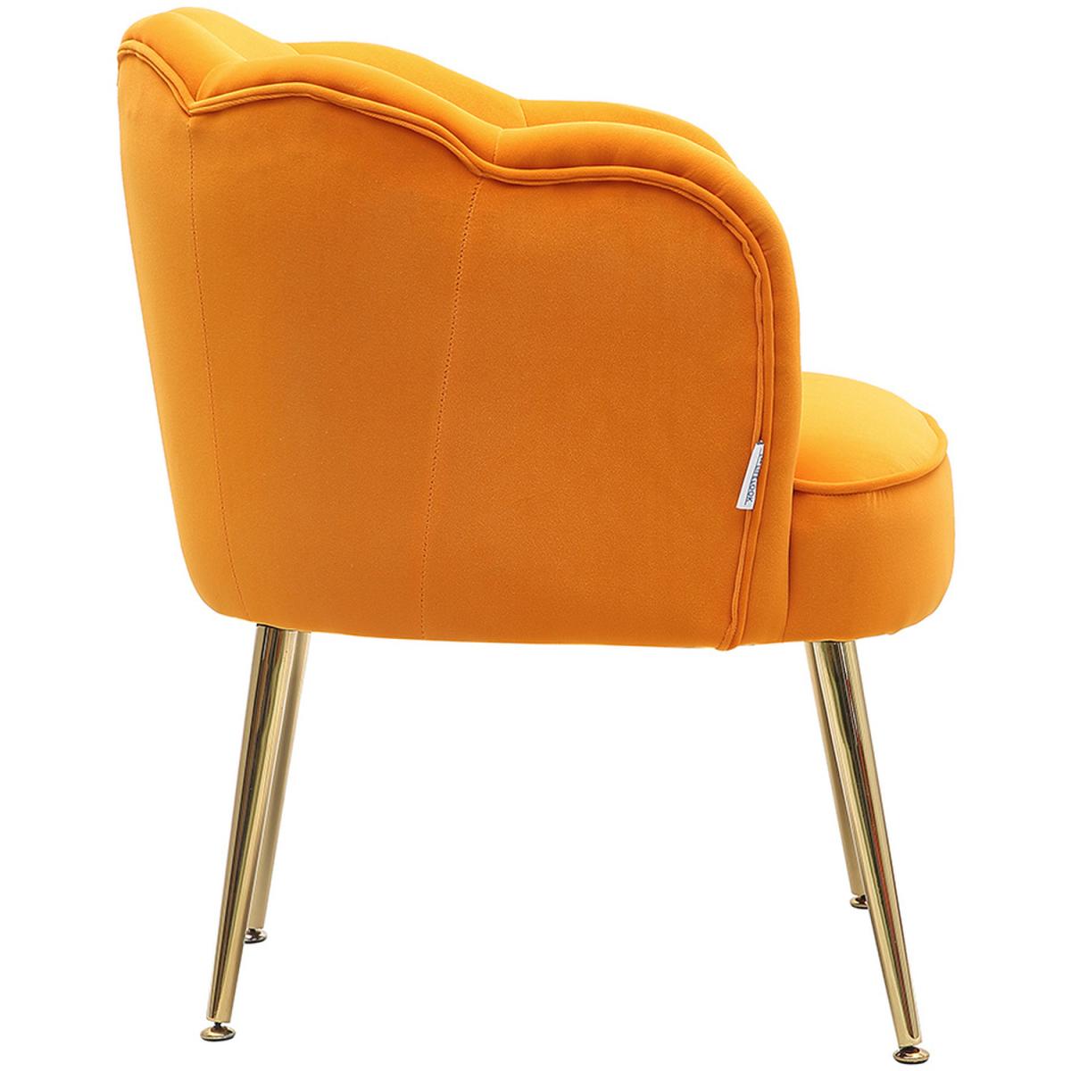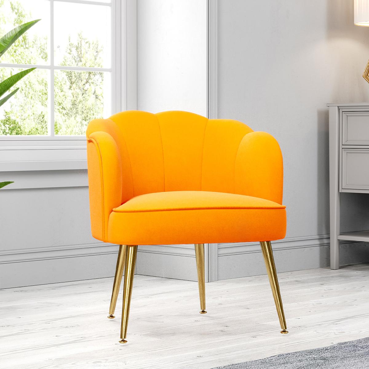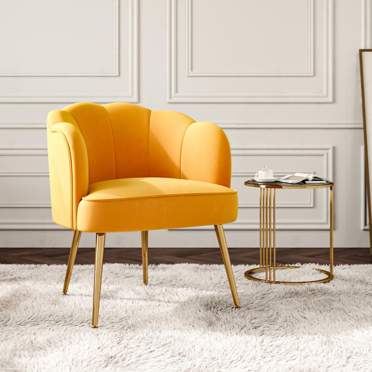 Introduce glam deco appeal with a tufted curved chair. It's made from high-quality velvet and filled with a dense sponge. as your rest your arms, you can feel the softness on your fingertips. Gently arc shell shape with deep pulled lines on its back, combined with metal legs in gold finish bring a modern feel. The chair legs have an adjustable leveller floor protector to stay balanced and prevent scratches and reduce sharp noise.