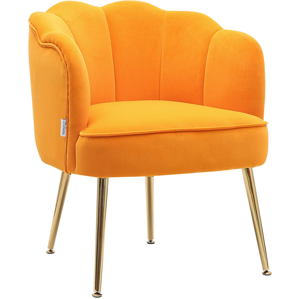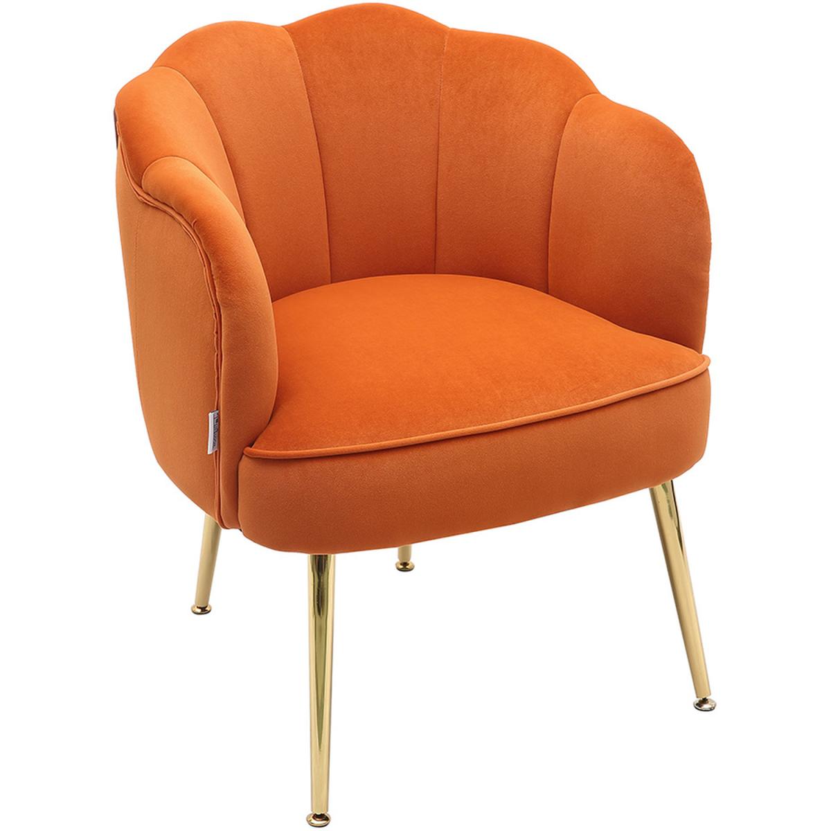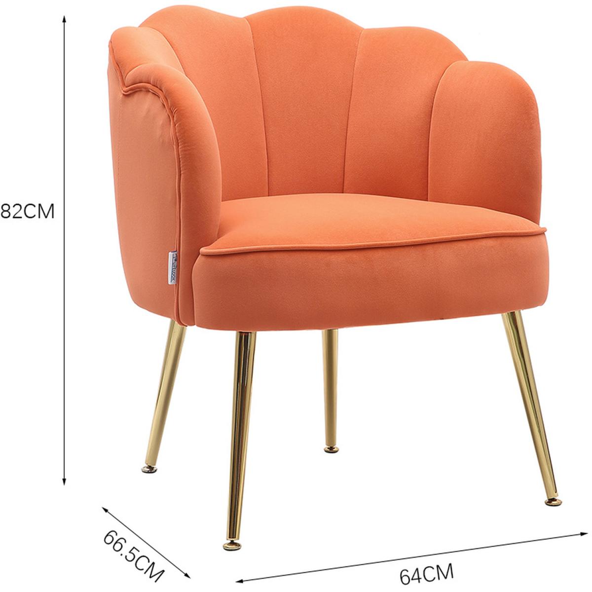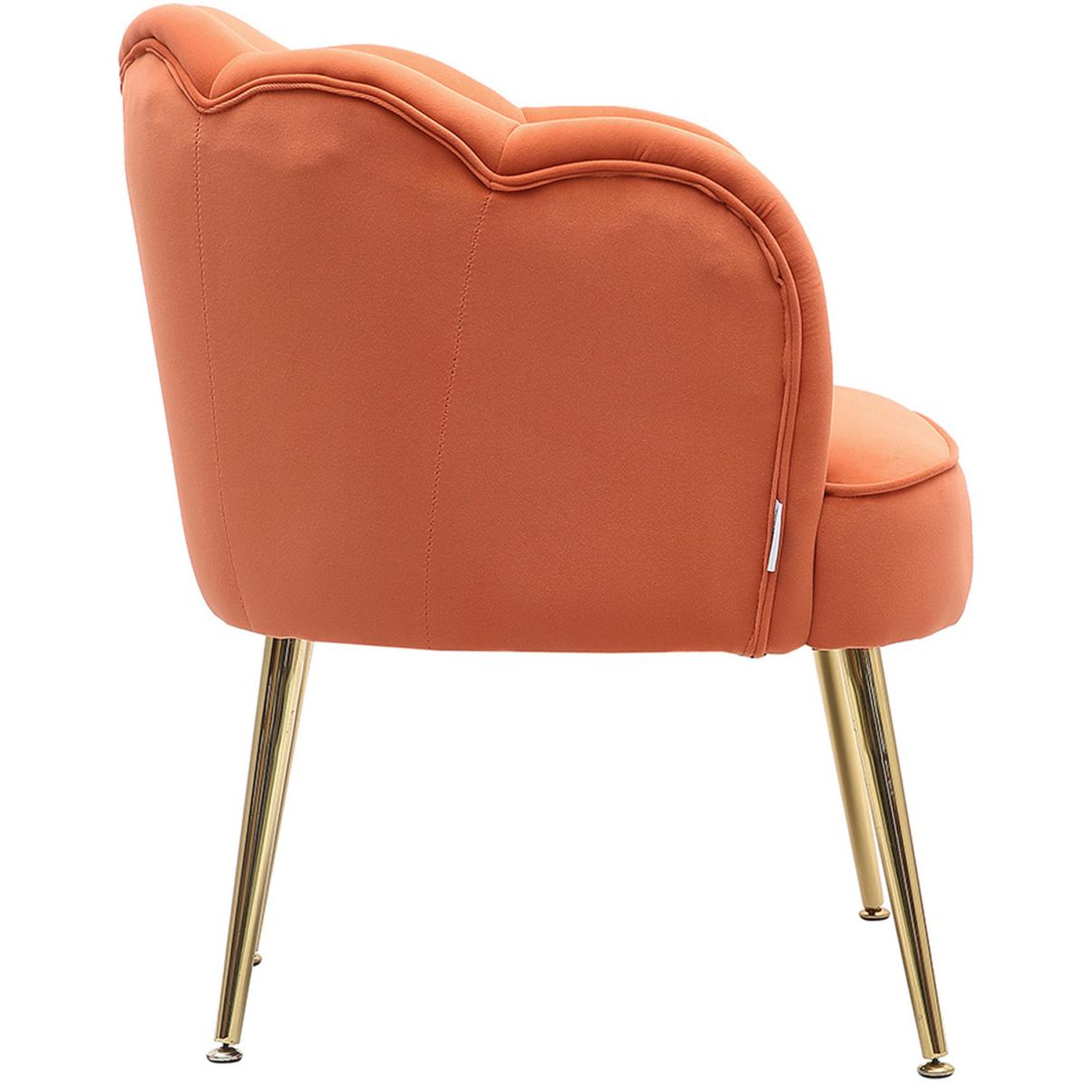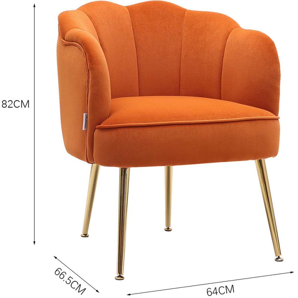Introduce glam deco appeal with a tufted curved chair. It's made from high-quality velvet and filled with a dense sponge. as your rest your arms, you can feel the softness on your fingertips. Gently arc shell shape with deep pulled lines on its back, combined with metal legs in gold finish bring a modern feel. The chair legs have an adjustable leveller floor protector to stay balanced and prevent scratches and reduce sharp noise.