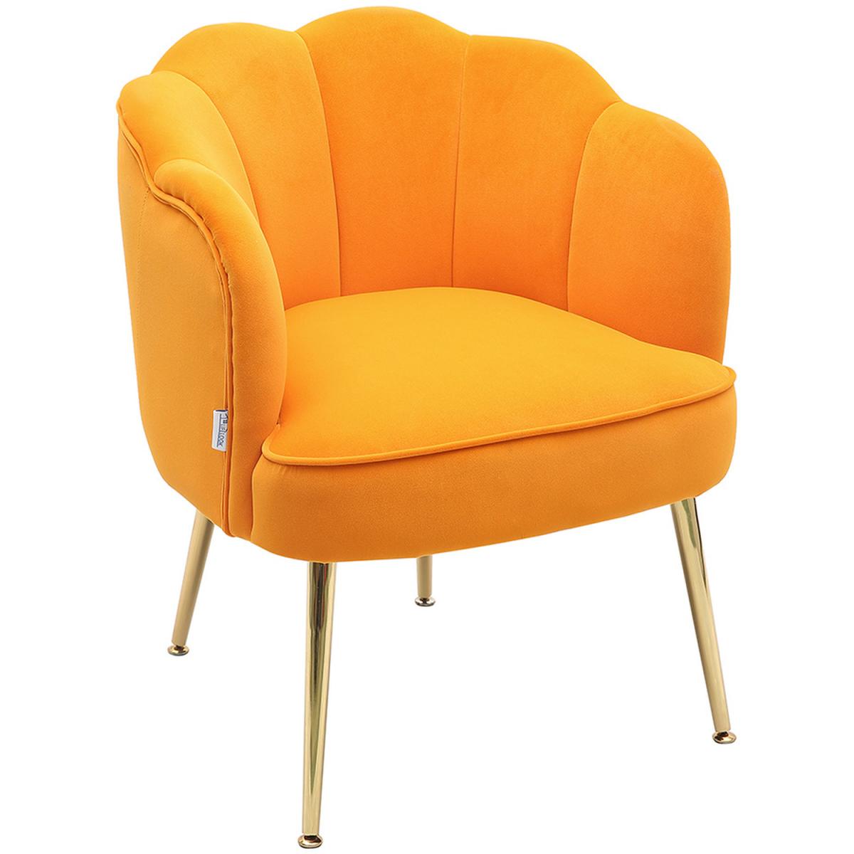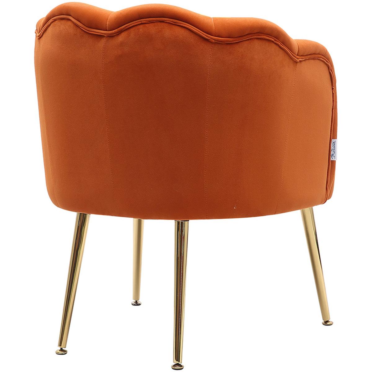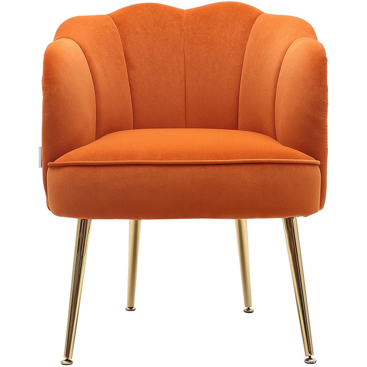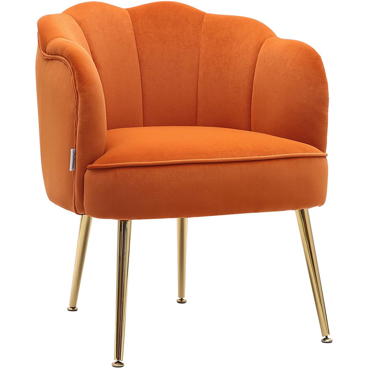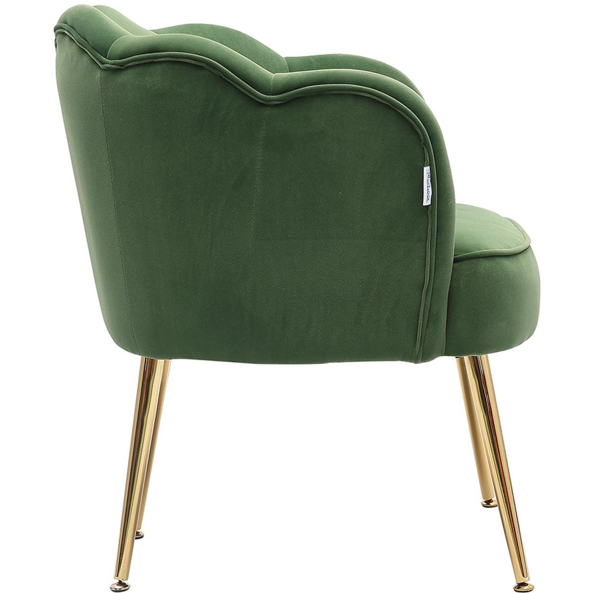 Introduce glam deco appeal with a tufted curved chair. It's made from high-quality velvet and filled with a dense sponge. as your rest your arms, you can feel the softness on your fingertips. Gently arc shell shape with deep pulled lines on its back, combined with metal legs in gold finish bring a modern feel. The chair legs have an adjustable leveller floor protector to stay balanced and prevent scratches and reduce sharp noise.