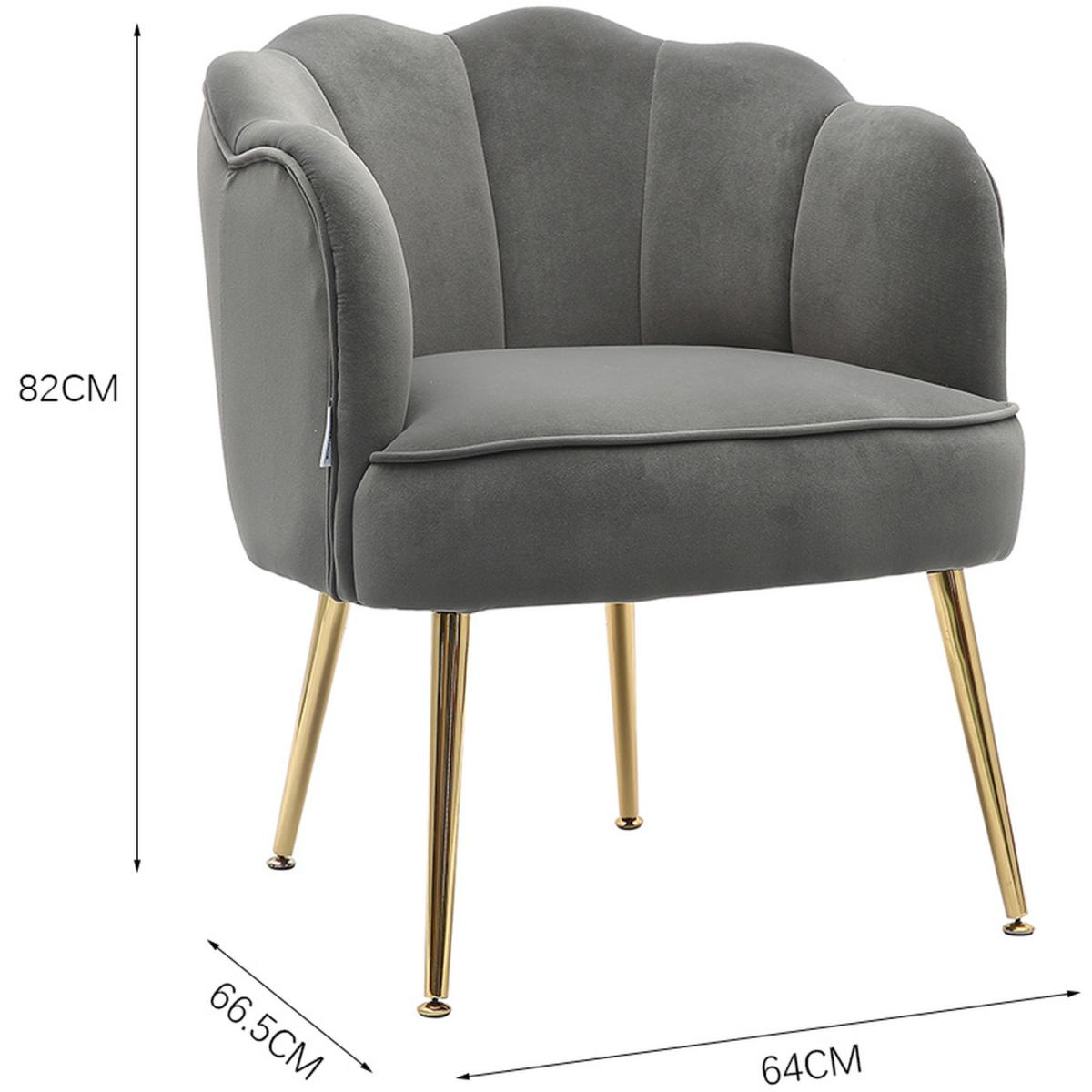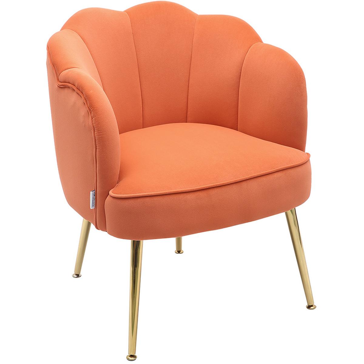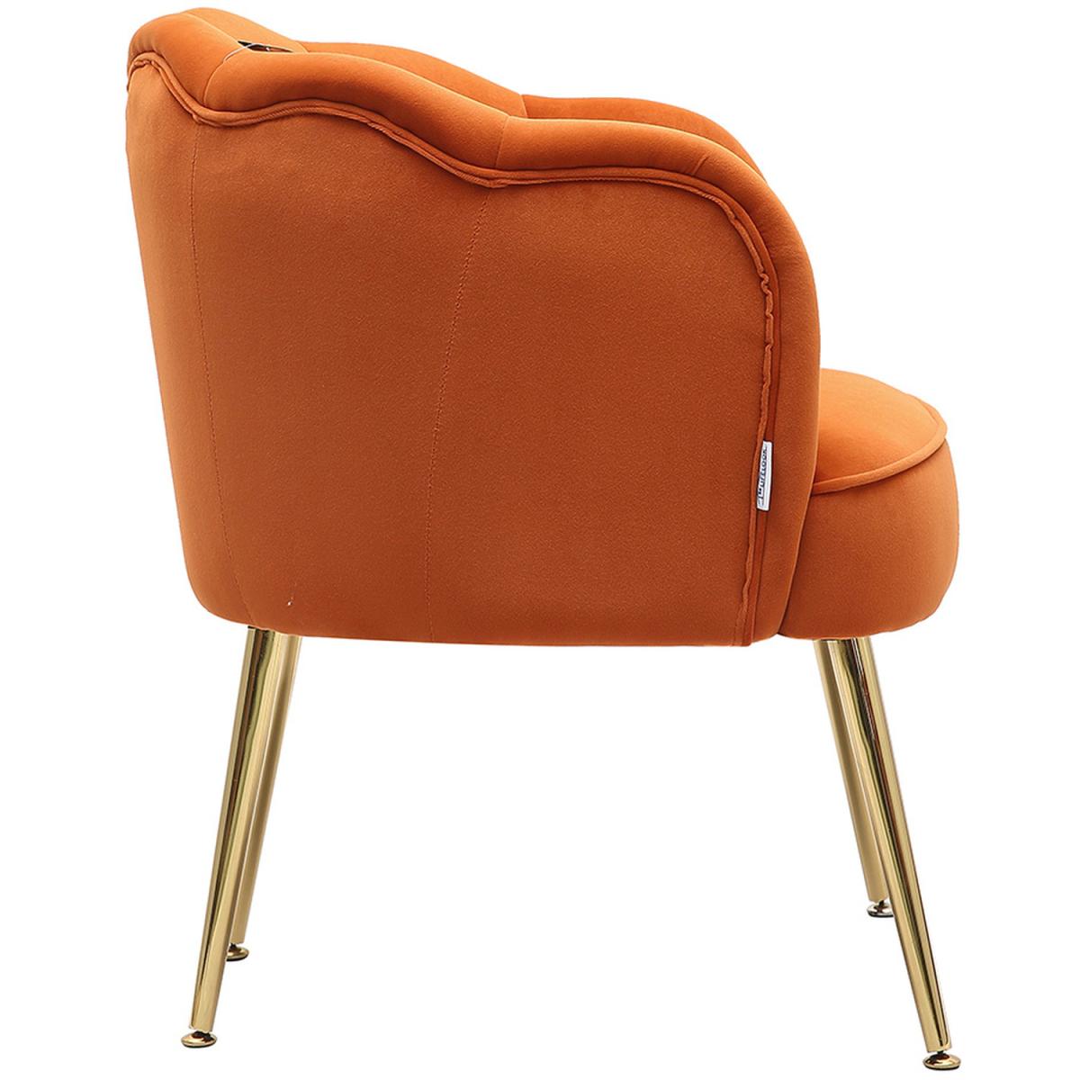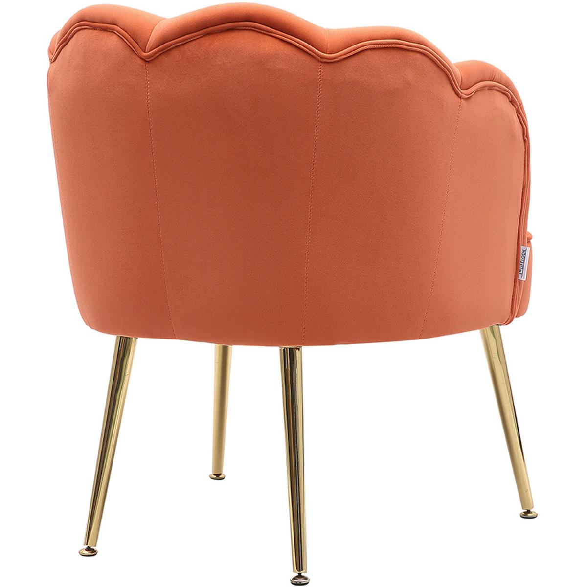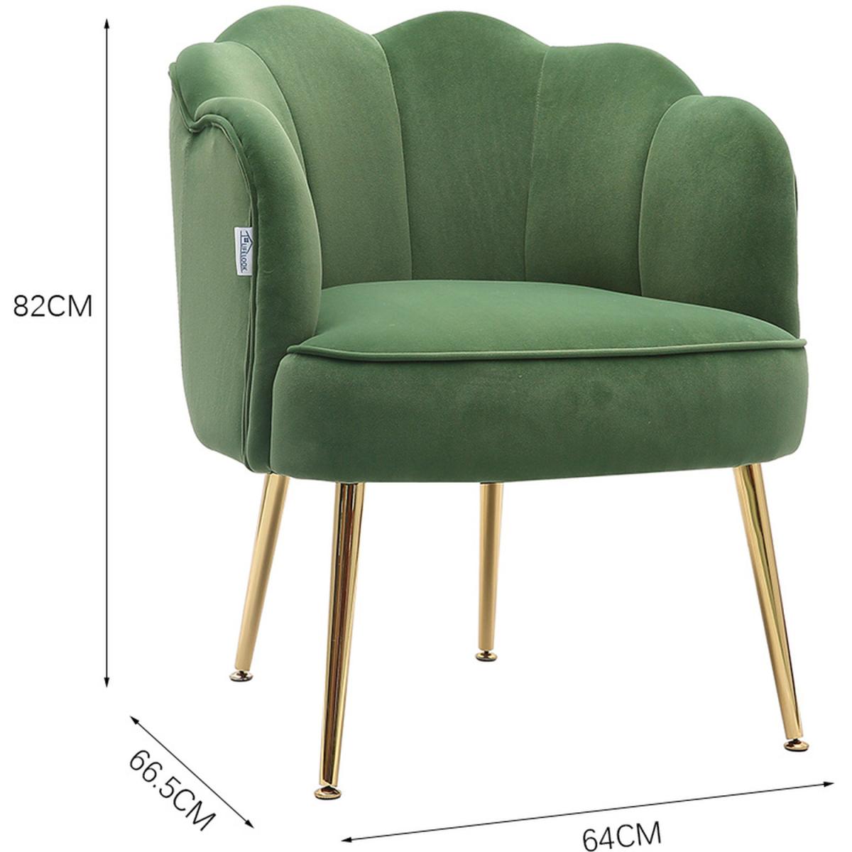 Introduce glam deco appeal with a tufted curved chair. It's made from high-quality velvet and filled with a dense sponge. as your rest your arms, you can feel the softness on your fingertips. Gently arc shell shape with deep pulled lines on its back, combined with metal legs in gold finish bring a modern feel. The chair legs have an adjustable leveller floor protector to stay balanced and prevent scratches and reduce sharp noise.