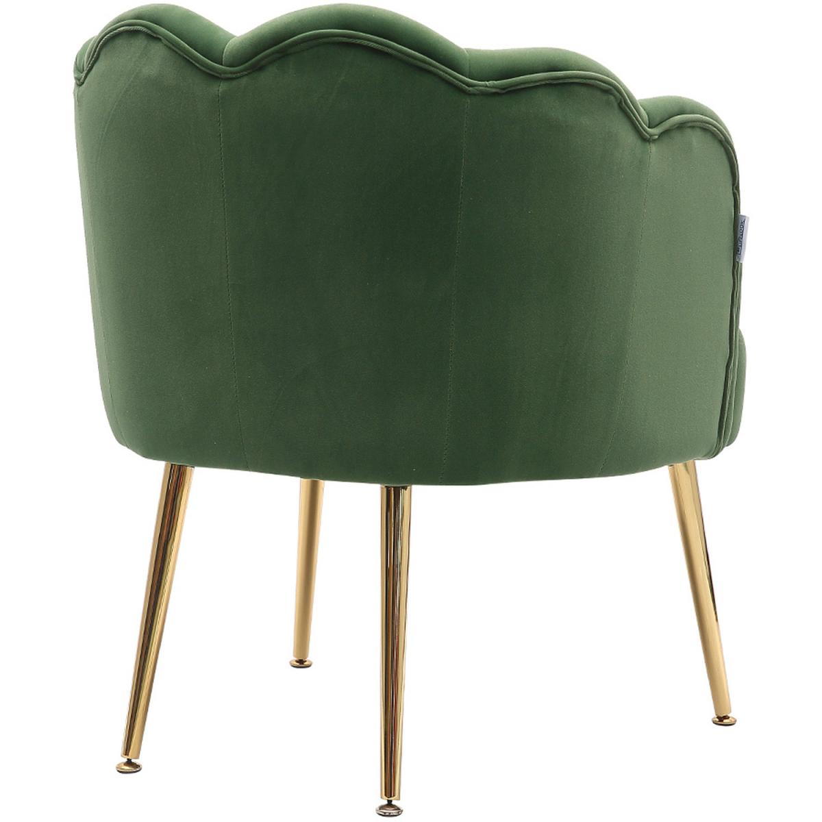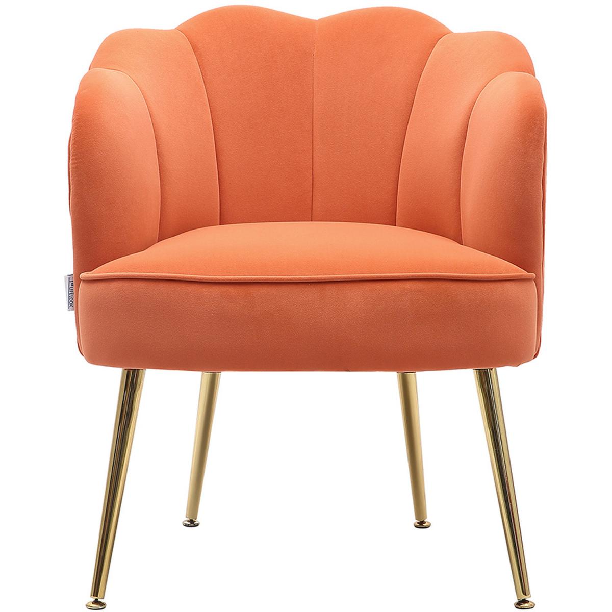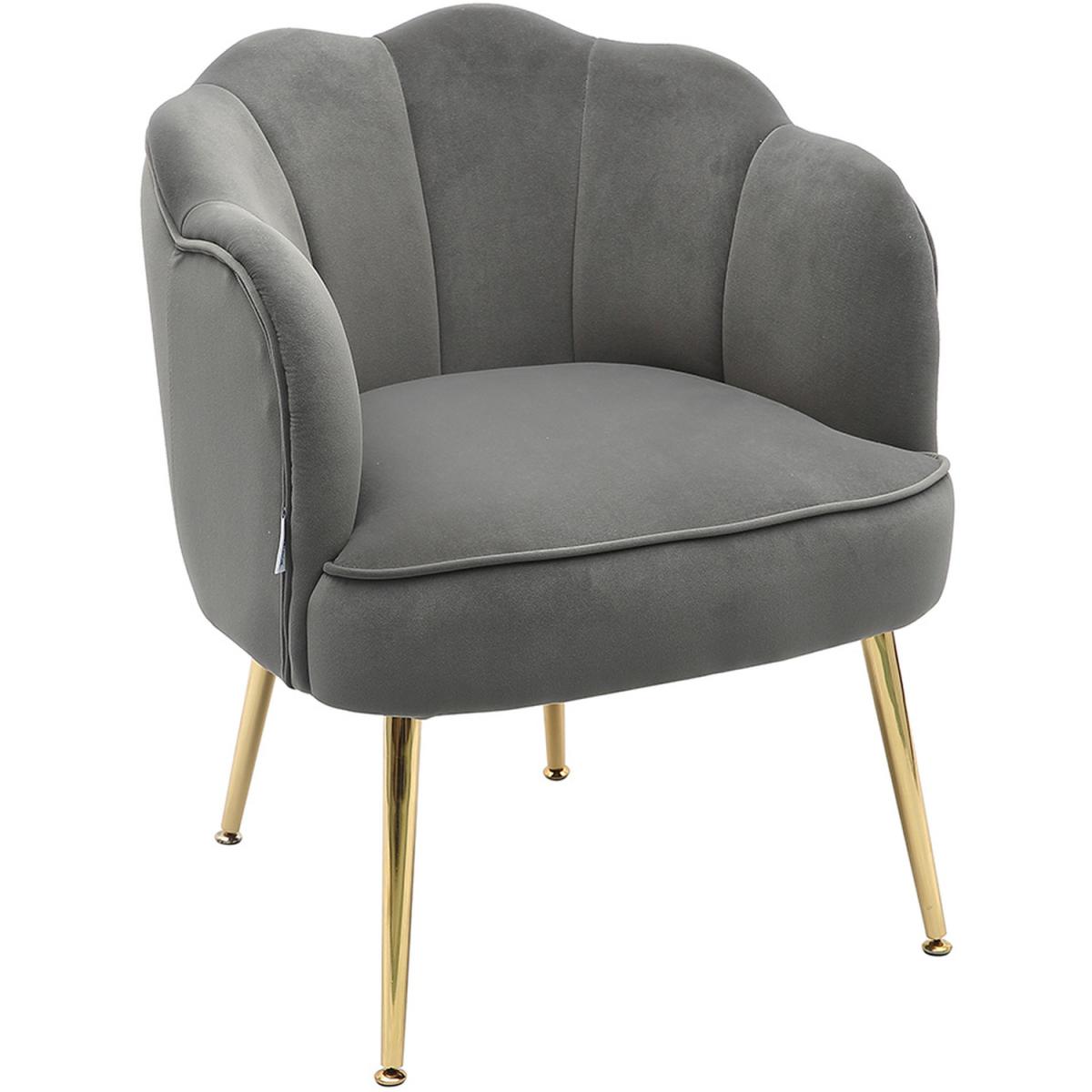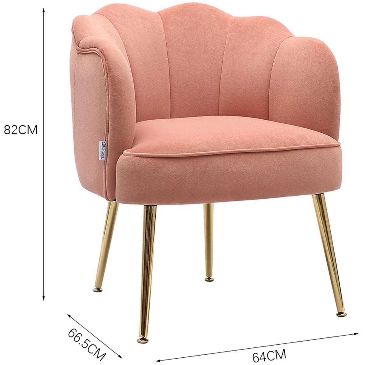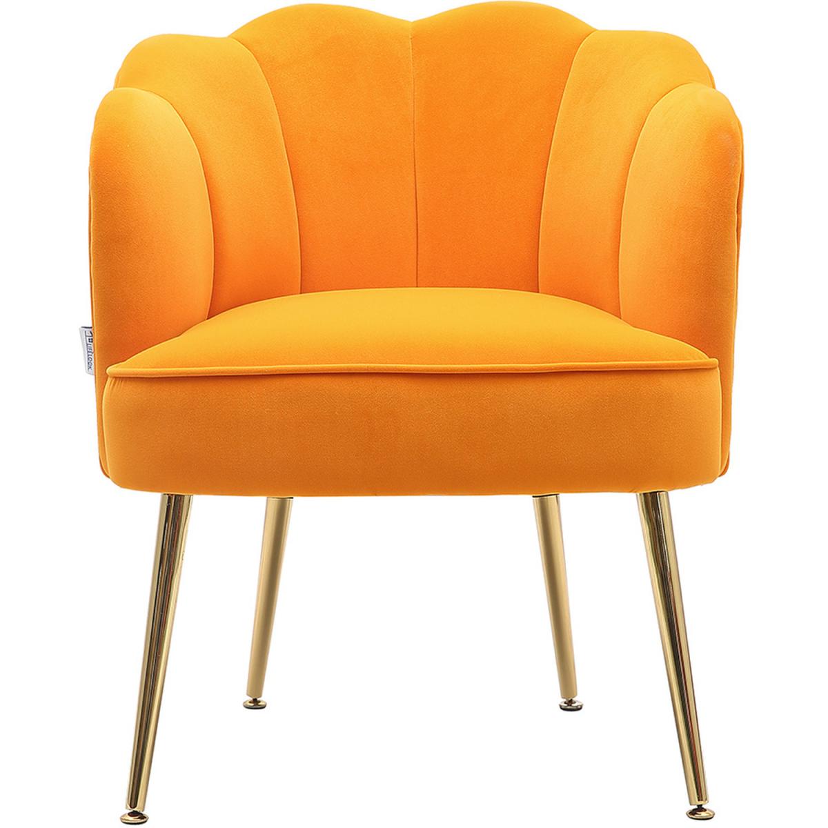Introduce glam deco appeal with a tufted curved chair. It's made from high-quality velvet and filled with a dense sponge. as your rest your arms, you can feel the softness on your fingertips. Gently arc shell shape with deep pulled lines on its back, combined with metal legs in gold finish bring a modern feel. The chair legs have an adjustable leveller floor protector to stay balanced and prevent scratches and reduce sharp noise.