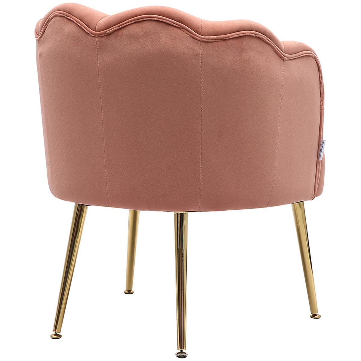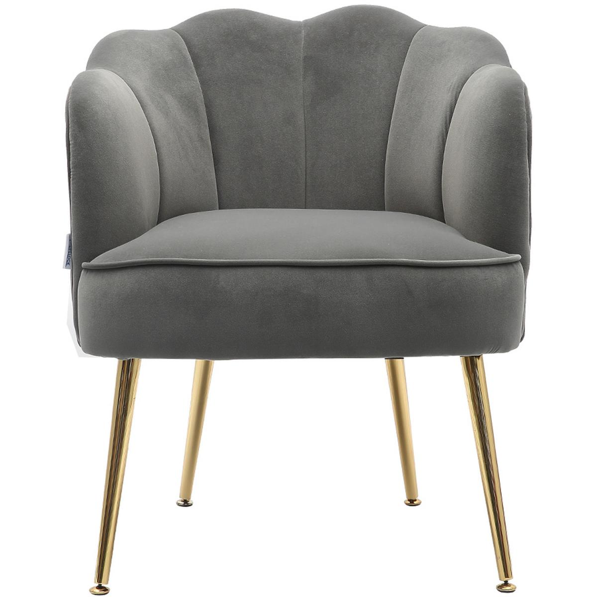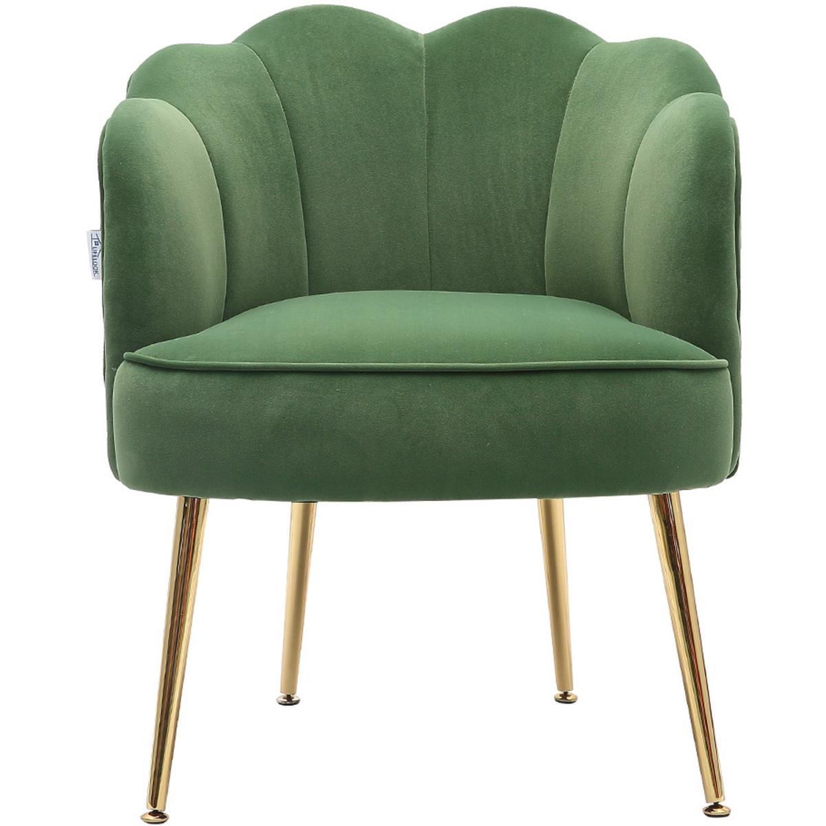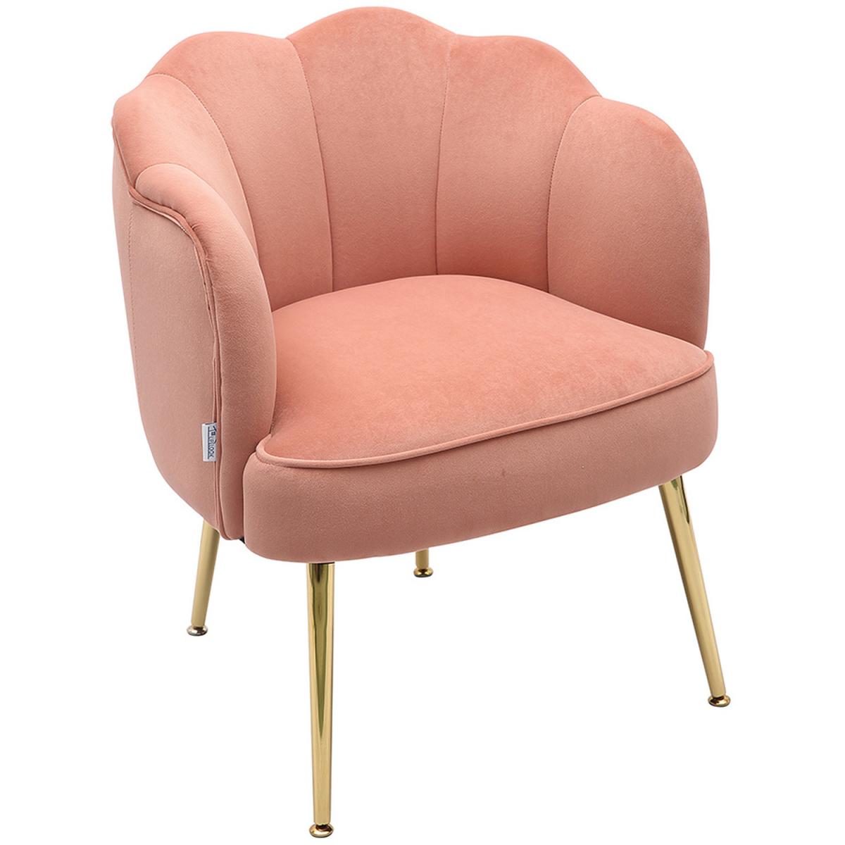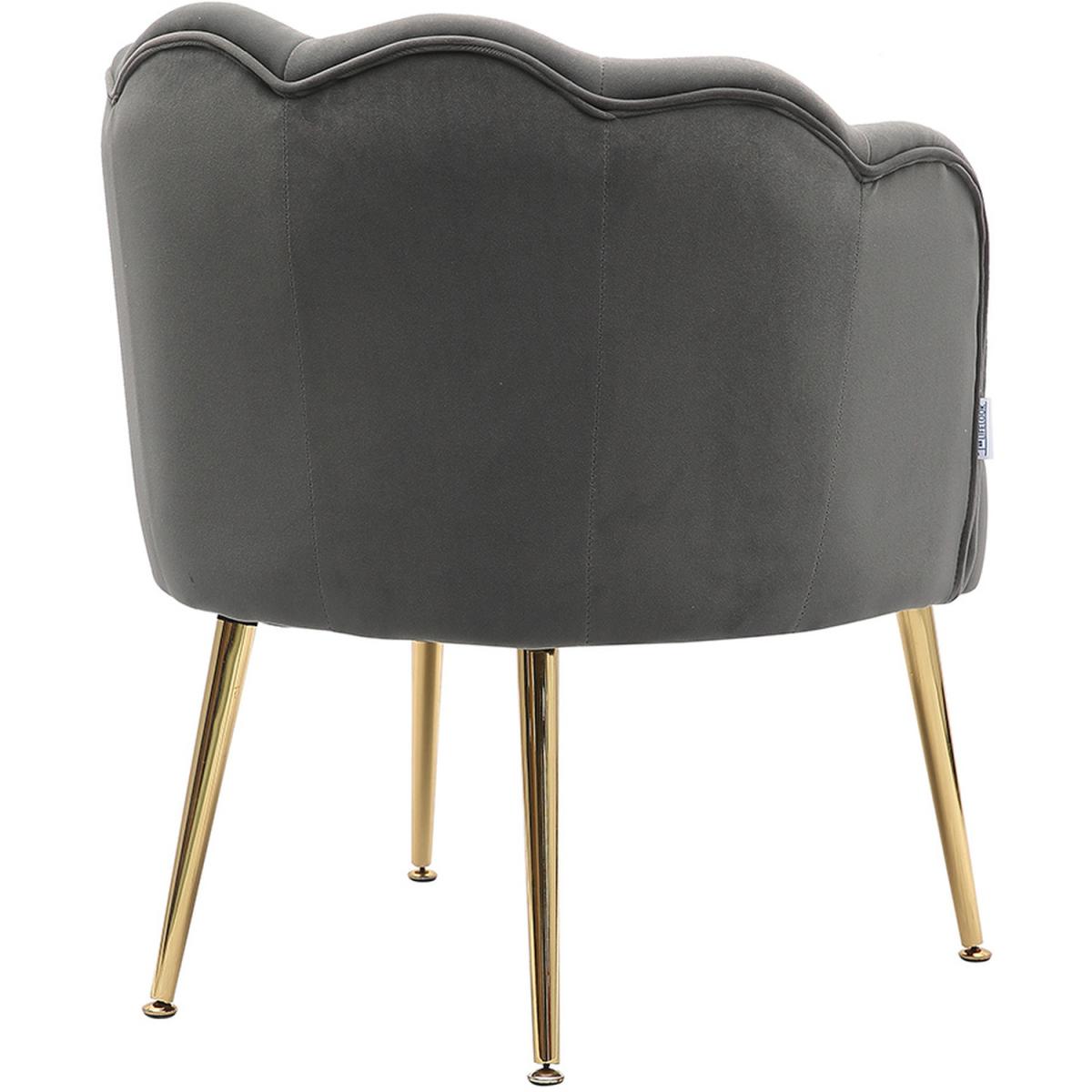 Introduce glam deco appeal with a tufted curved chair. It's made from high-quality velvet and filled with a dense sponge. as your rest your arms, you can feel the softness on your fingertips. Gently arc shell shape with deep pulled lines on its back, combined with metal legs in gold finish bring a modern feel. The chair legs have an adjustable leveller floor protector to stay balanced and prevent scratches and reduce sharp noise.