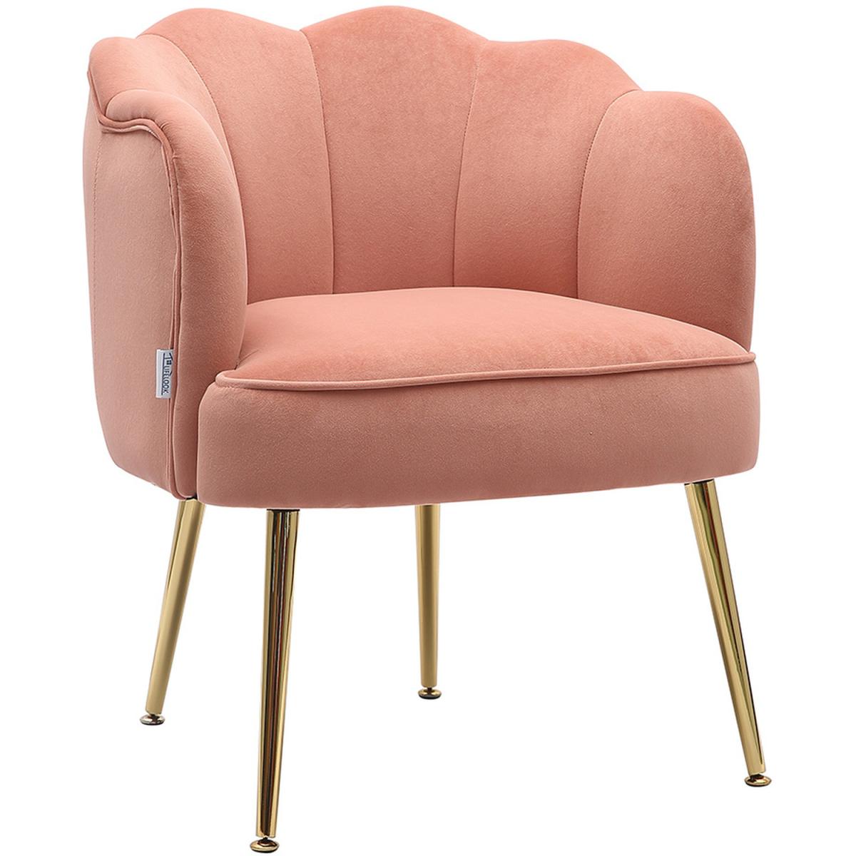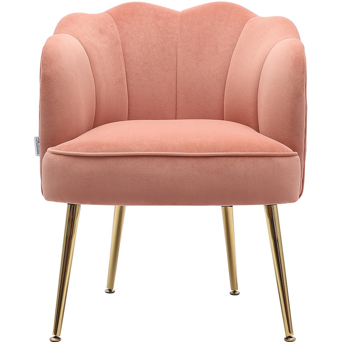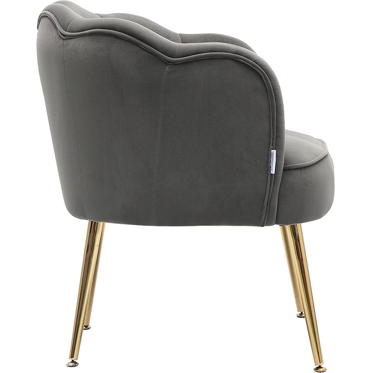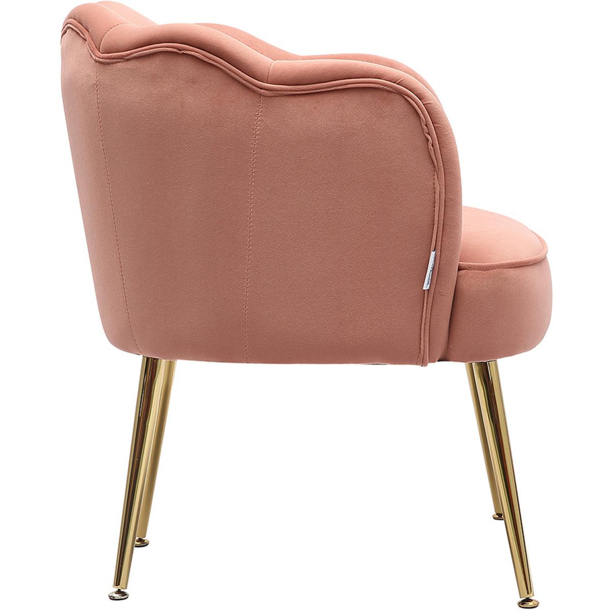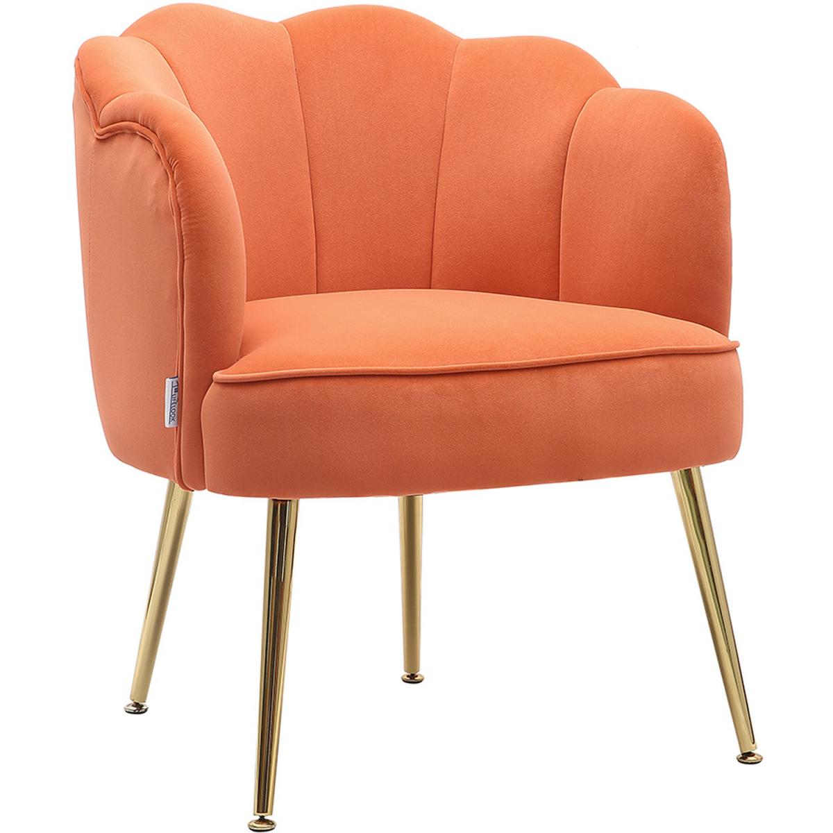 Introduce glam deco appeal with a tufted curved chair. It's made from high-quality velvet and filled with a dense sponge. as your rest your arms, you can feel the softness on your fingertips. Gently arc shell shape with deep pulled lines on its back, combined with metal legs in gold finish bring a modern feel. The chair legs have an adjustable leveller floor protector to stay balanced and prevent scratches and reduce sharp noise.
