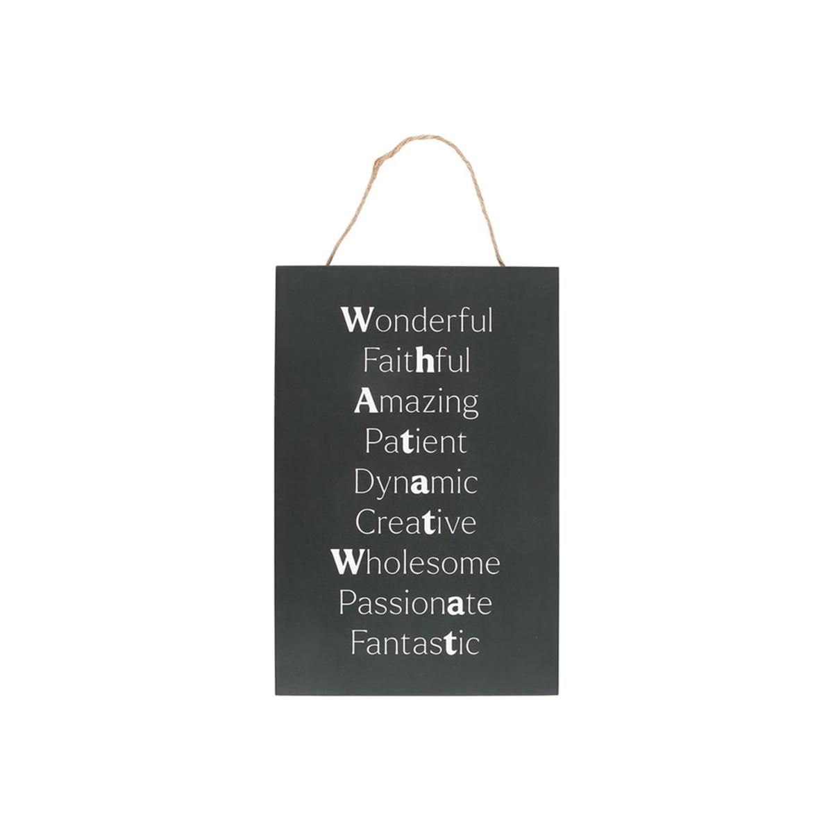 Get the message across with this subtly offensive hanging sign. Features "Wonderful, Faithful, Amazing, Patient, Dynamic, Creative, Wholesome, Passionate, Fantastic" text with strategically bolded letters that spell out a special phrase for those with a keen eye. Please note This is a novelty gift intended for adults only.