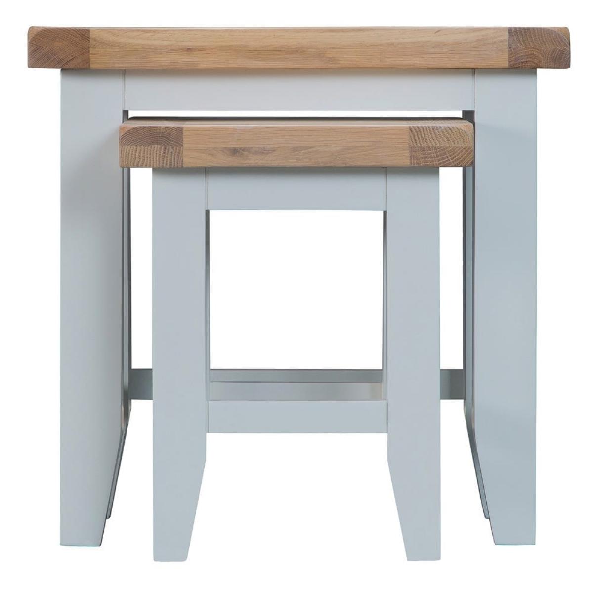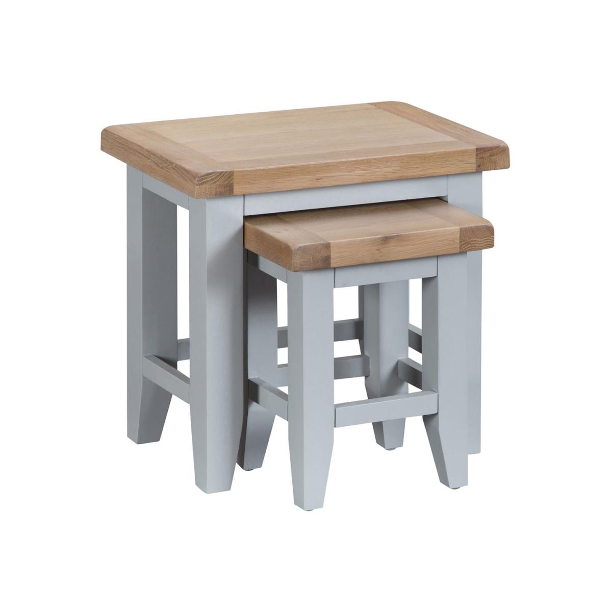 Two’s company with this Suffolk grey painted oak nest of 2 tables. You can use them as occasional tables when you’re hosting guests to keep hot drinks and glasses of wine easily to hand. They nest neatly back together if floor space is a precious commodity. This petite pair is finished in our elegant pale grey to bring a modern colour palette to any room in your home. The natural oak tops add an artisan feel, and the smooth finish means coasters are strictly optional. You can also use this duo as separate display stands or lamp tables anywhere in your home.
