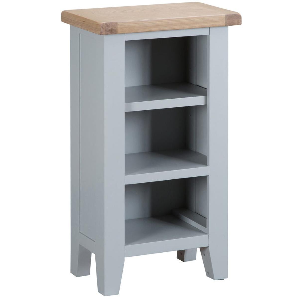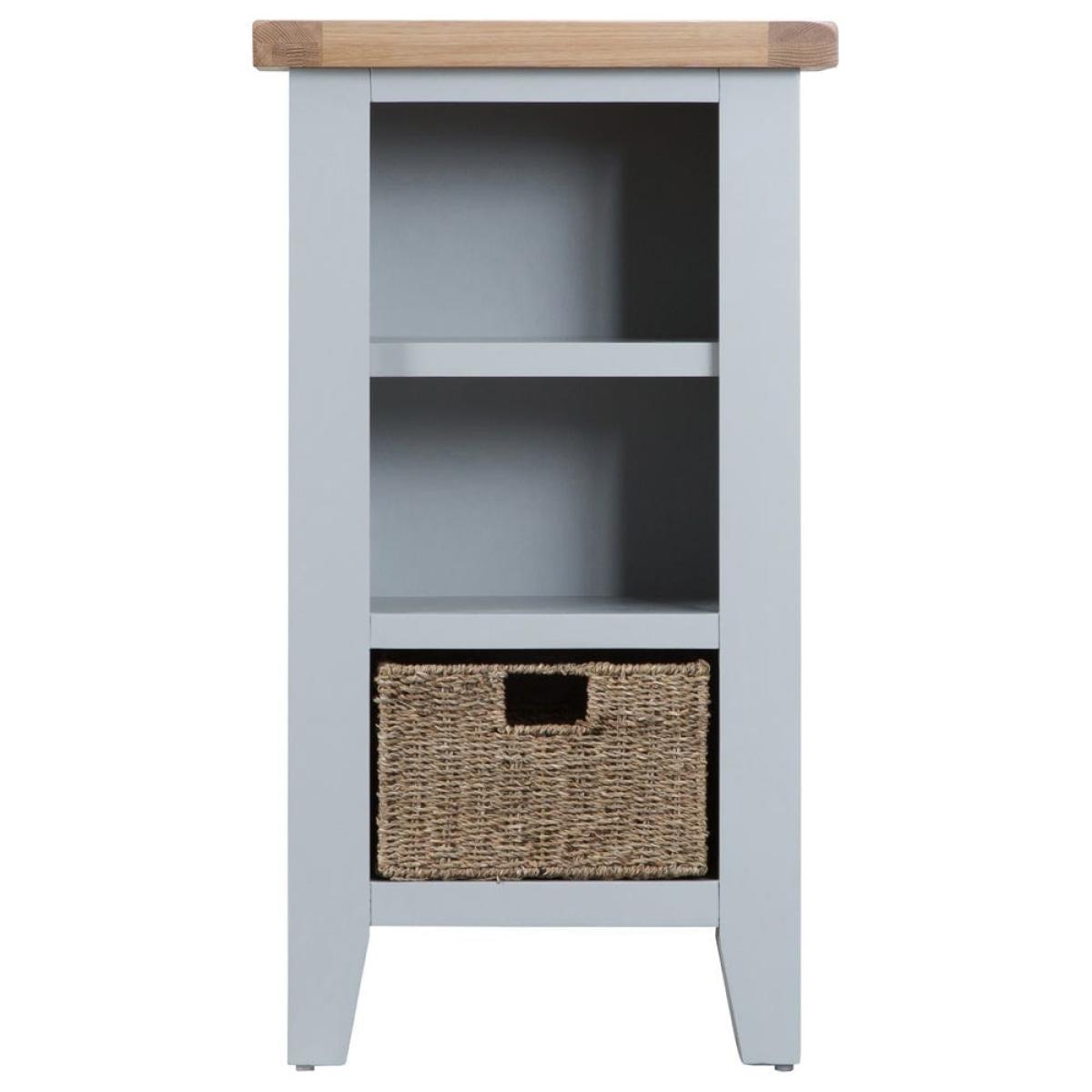 Suffolk Grey Painted Oak Small Narrow Bookcase with Wicker Basket