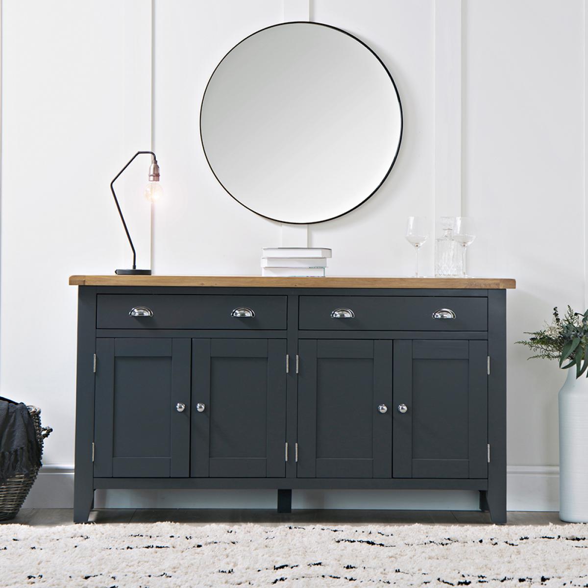 I love the Suffolk Midnight Grey painted oak sideboard for its sleek, contemporary look combined with a touch of warmth from the oak top. It works particularly well in modern or Scandinavian-inspired interiors, where its bold colour adds depth and character. Practical styling tips include pairing it with minimalist accessories and subtle metallic accents to highlight its modern edge, or adding textured greenery for a touch of contrast. Its large size makes it perfect for storage without overwhelming the space, making it ideal for open-plan living rooms or dining areas where both style and functionality are key.