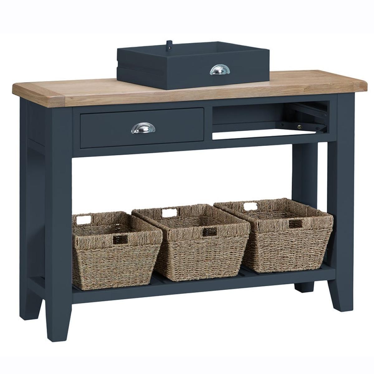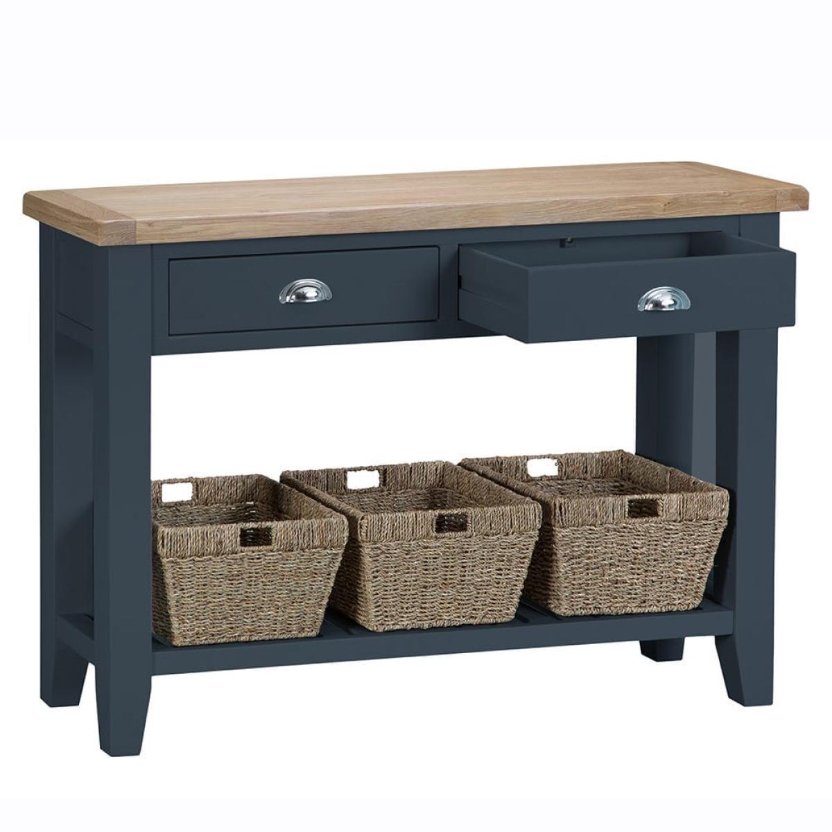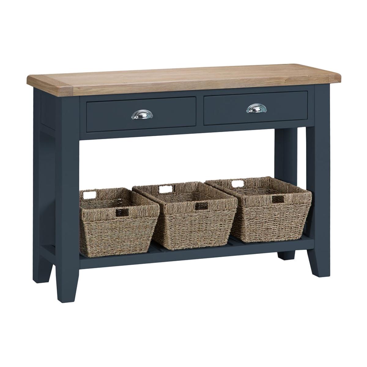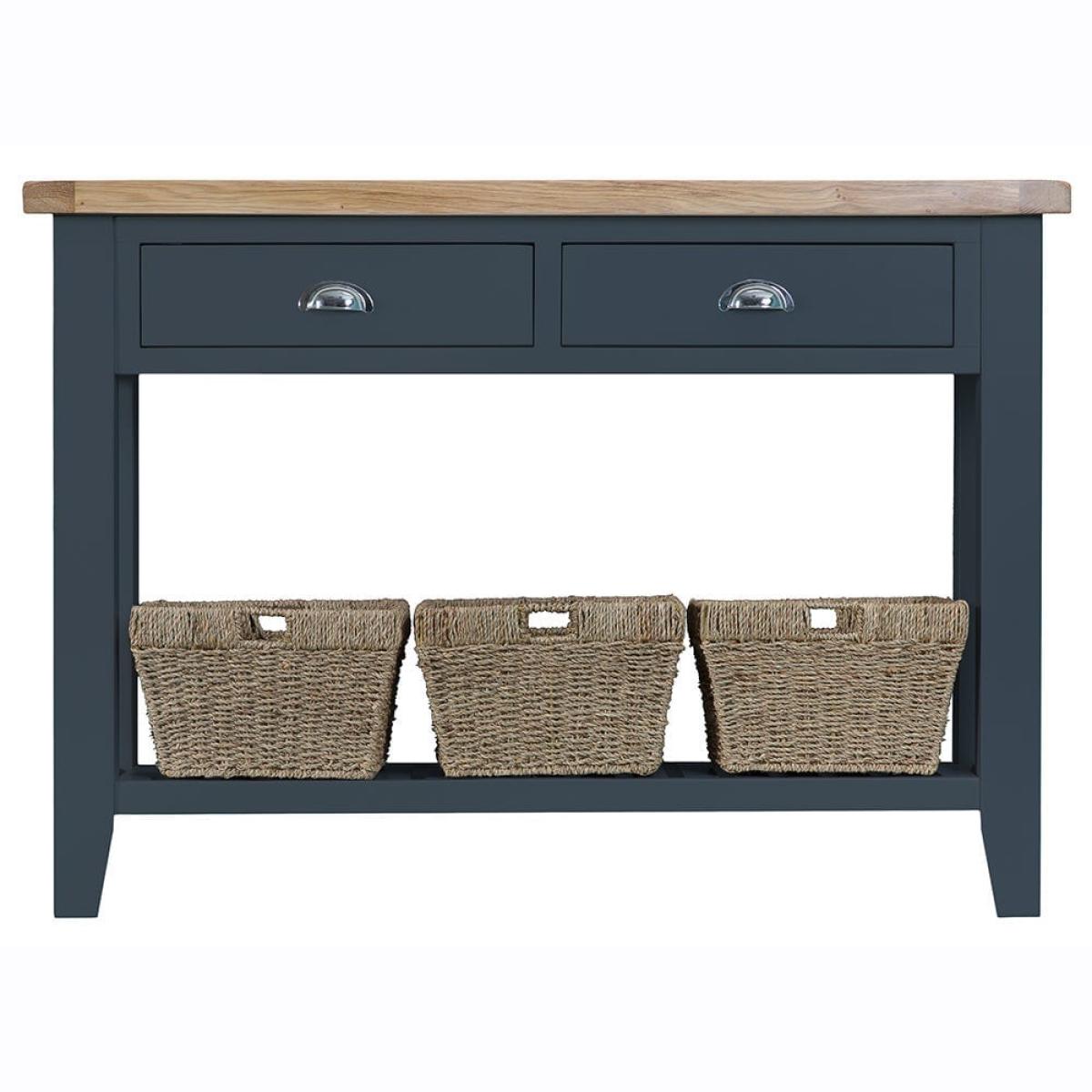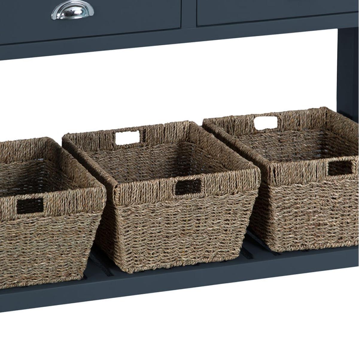 I'm sure you've seen Farmhouse-style furniture in the past that combines stunning oak tops with smooth painted bases, but have you seen one quite as gorgeous as this? The incredible Suffolk Midnight Grey Painted Oak Collection is one of the finest examples we've seen of a classic/contemporary blend that's just perfect if you're looking to lighten up your home. The tops of this furniture are chunky, a lot thicker than many similar alternatives and the smooth chrome cup handles add the contemporary twist that really makes this range stand out from the rest. Within the Suffolk Midnight Grey Painted Oak Collection you'll find an extensive range of Bedroom, Living and Dining Room furniture including X-Leg Dining Tables and accompanying benches. It would be remiss of us not to mention the one truly unique feature of this collection, namely the wicker baskets on selected items. These create an awesome contrast against the painted frames and allow for an alternative way of storing your belongings.