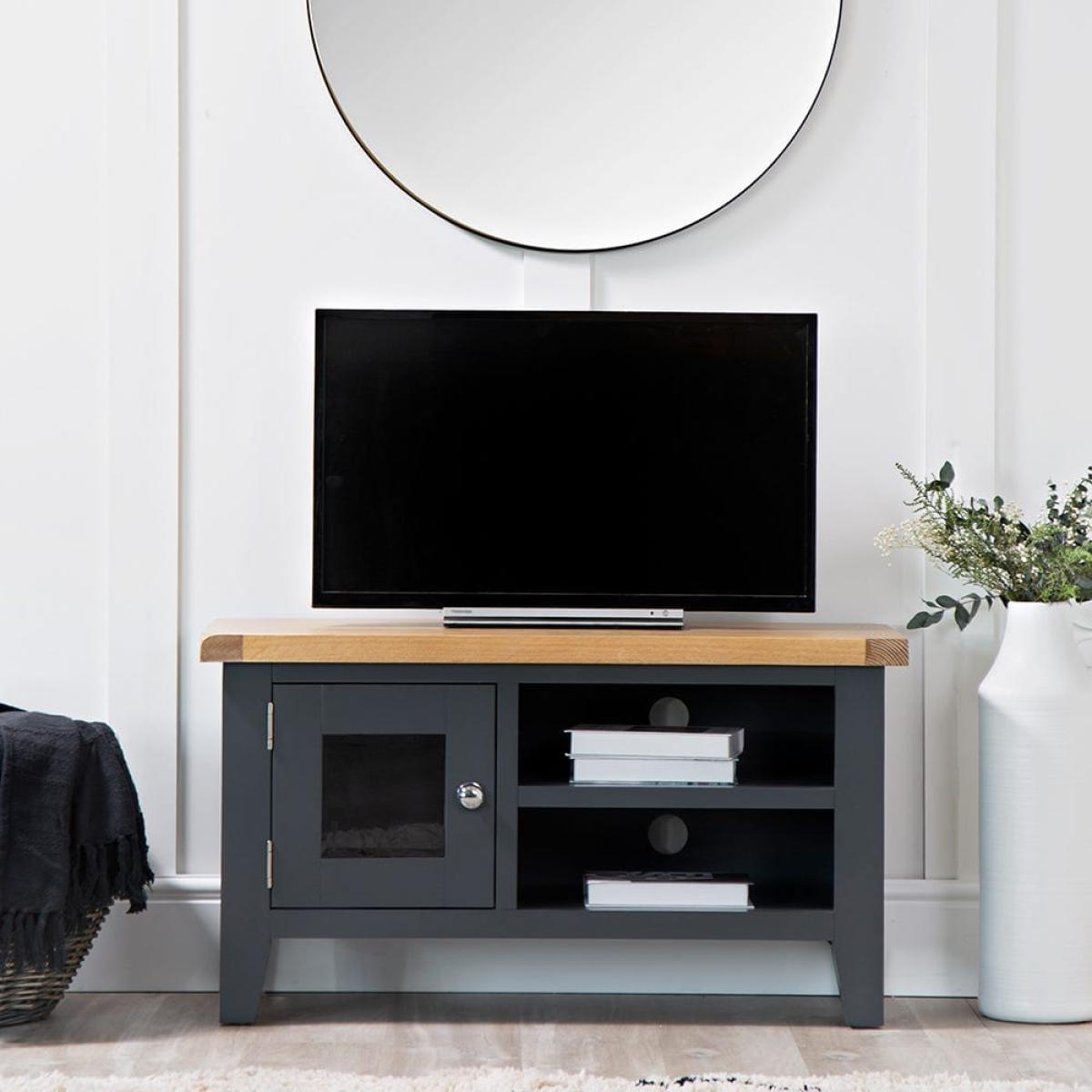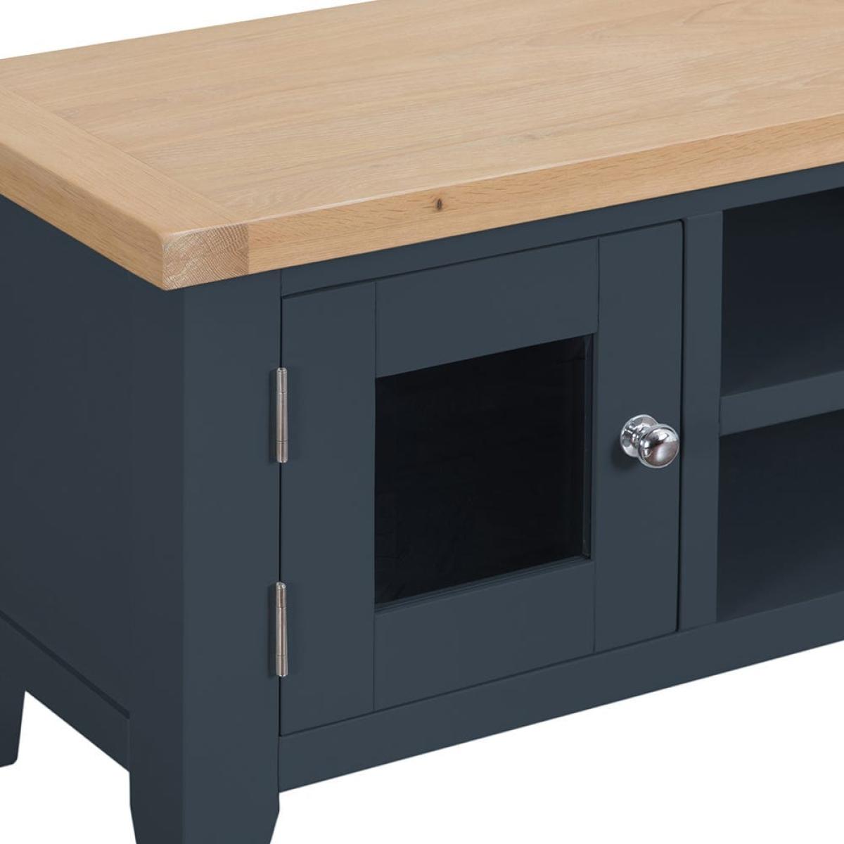 I love this piece because it offers a sleek, modern look with its midnight grey paint and oak top, making it a versatile addition to various interiors. It works particularly well in contemporary and Scandinavian-inspired spaces, where its muted tone can complement both bold colour schemes and minimalist palettes. Practical styling tips include keeping the top clear with minimal decorative items, such as a small vase or tray, to highlight the oak surface, while utilising the open shelves for media devices or organised storage. The glazed cupboard is ideal for hiding away clutter, maintaining a tidy aesthetic. Overall, this TV unit provides a stylish yet functional focal point that can seamlessly blend into different settings.