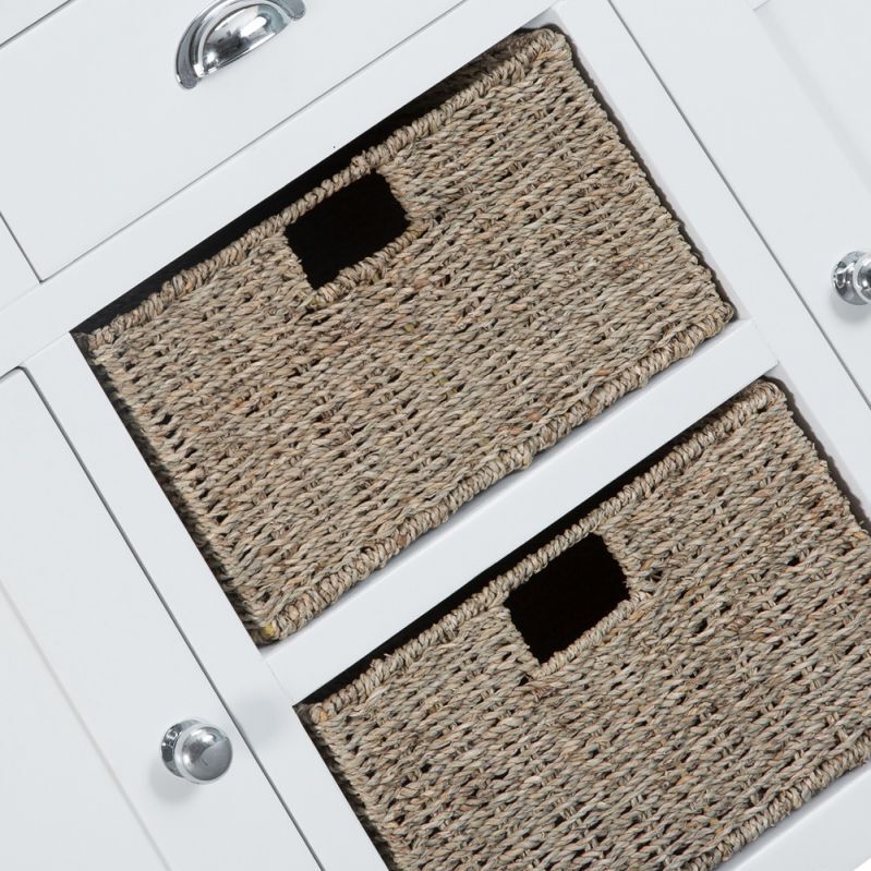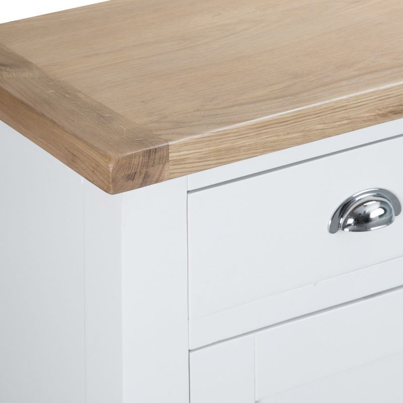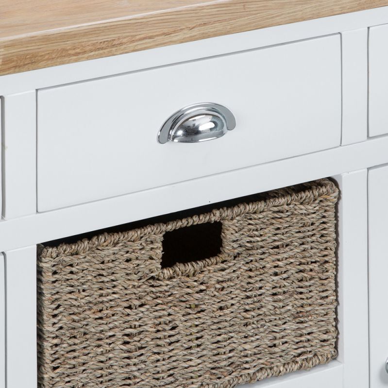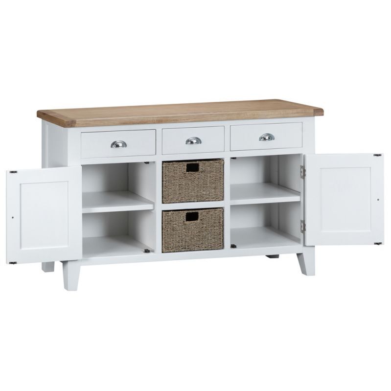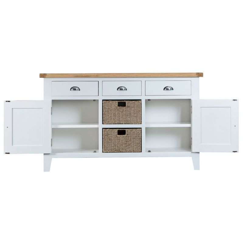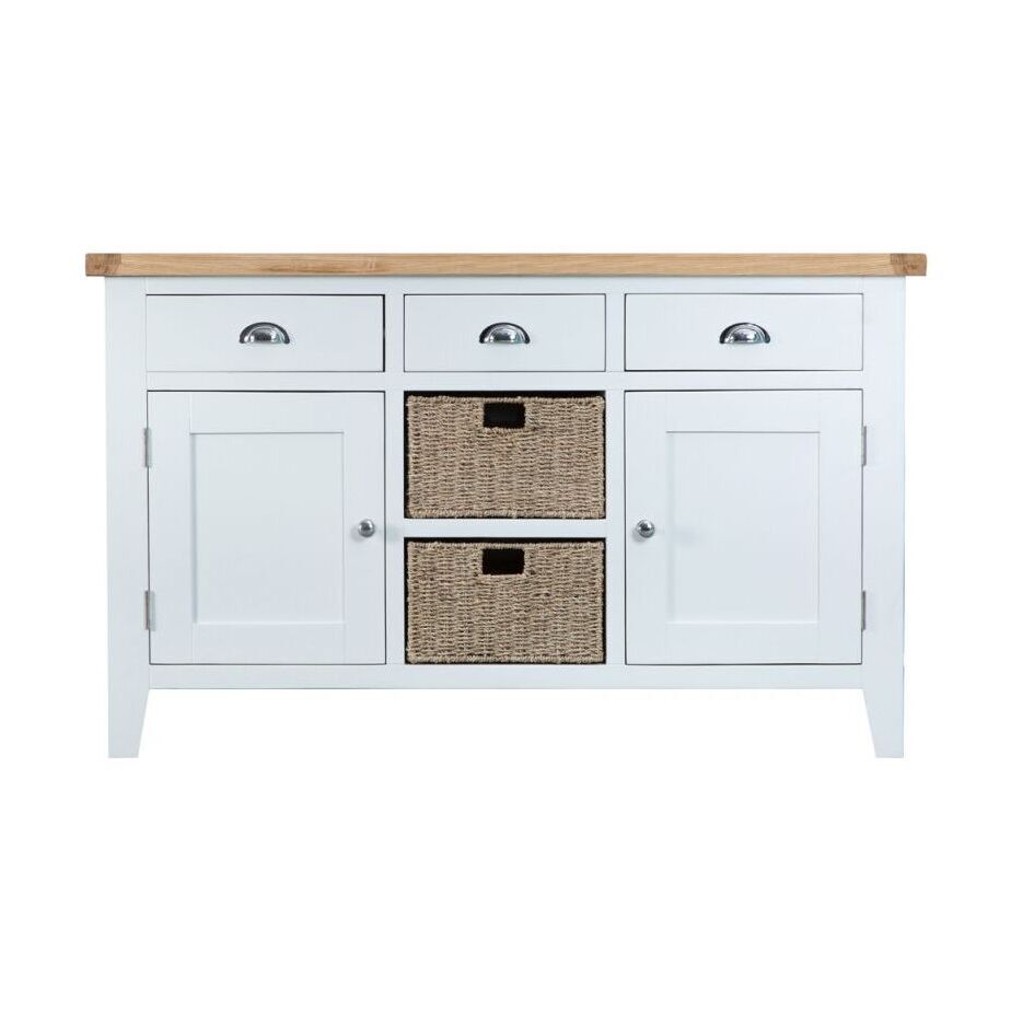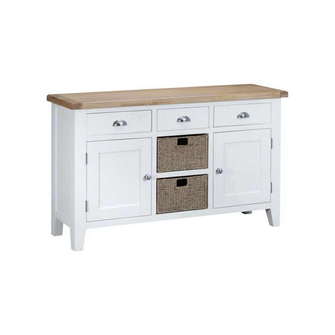 Looking for the perfect piece to finish your dining room look? Well, the Suffolk White Painted Oak 2 Door Large Sideboard is perfect for you, an item hand chosen by us here at Chiltern Oak Furniture due to its immense build quality and stunning design. Featuring an elegant white painted solid pine frame and a gorgeous chunky oak and real oak veneer top, which is a mainstay of this beautiful range and makes it so popular. As well as this there is three really handy drawers, which are perfect for storing anything you can imagine, two separate extremely spacious one drawer cupboards and two stunning rustic wicker baskets. The look is rounded off with exquisite rounded chrome handles and door knobs, which add a further degree of sophistication to an already beautiful Sideboard. But wait there’s more, this item arrives fully assembled so as soon as it’s delivered you’re good to go. Feel like you need something bigger? Be sure to check out the Extra Large 4-Door Sideboard in this range. Or perhaps you need something a bit smaller in which case the Small and Mini Sideboard in this range might be more appropriate. This item is also available in Grey from Chiltern Oak Furniture in our Suffolk Grey Painted Oak Collection.