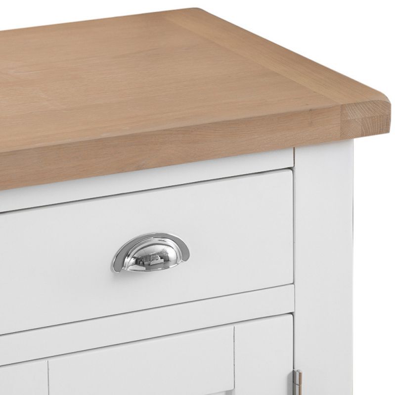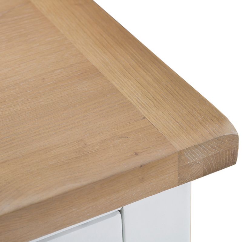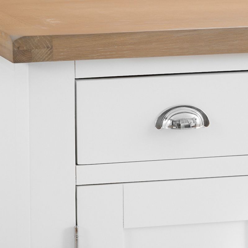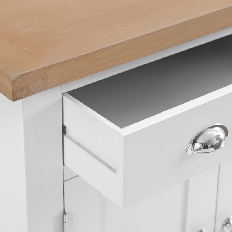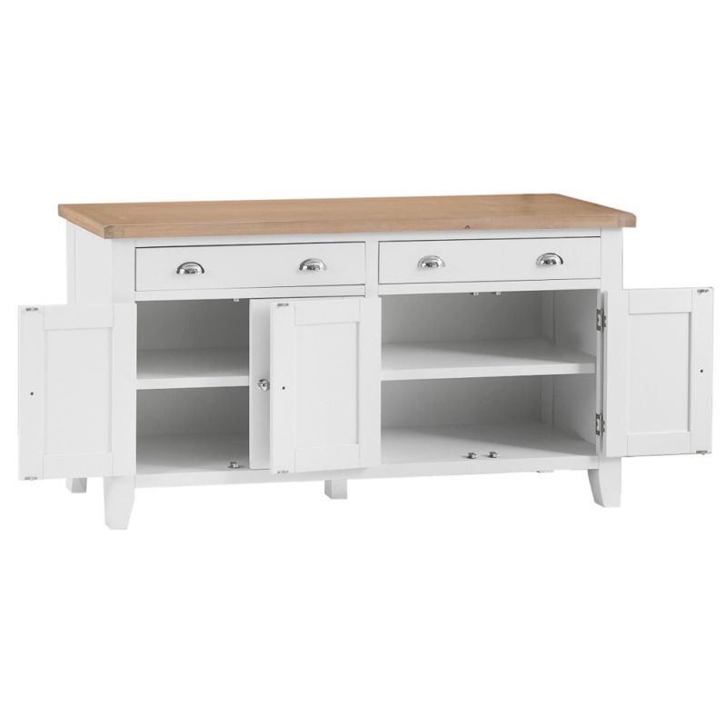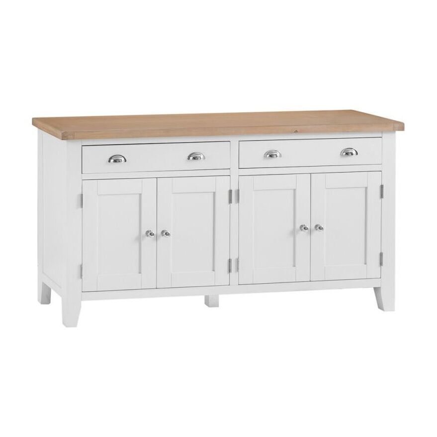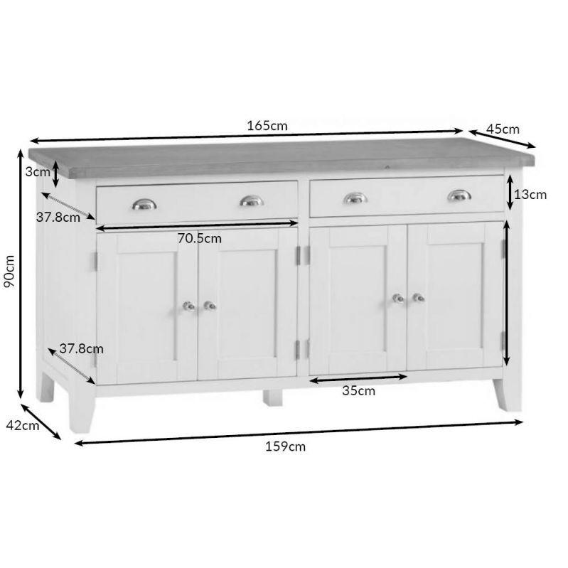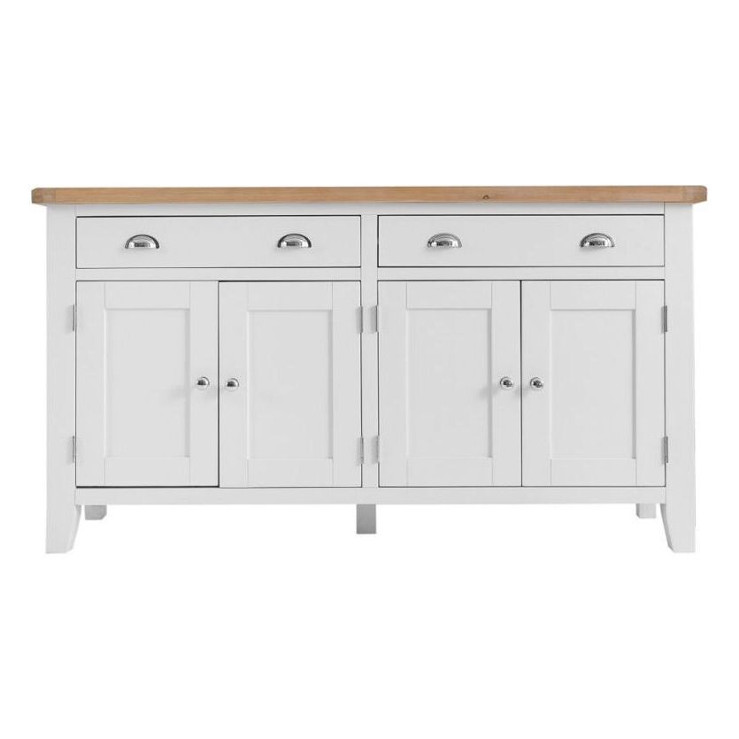 Size matters, or so I've been told. Well, there's certainly a case for this with the Suffolk White Painted Oak 4 Door Extra Large Sideboard, at 165cm wide this is a sizeable piece and is therefore guaranteed to suit your every possible need. Featuring a stunning mix between classic and contemporary furniture styles with a gorgeous white painted solid pine frame and a striking chunky oak and real oak veneer top, which makes this product so immensely popular. Far from just aesthetically pleasing this piece is also extremely practical, featuring two separate 2-Door Cupboards, which provide plenty of storage space and two large drawers, which are perfect for storing everything from magazines to table mats. The look is completed by rounded chrome handles and door knobs, which just ooze sophistication and add yet more class to this Sideboard. The best bit? This item arrives fully assembled so as soon as it's delivered you're good to go. Feel like you need something smaller? Be sure to check out the Large, Small and Mini 2-Door Sideboards in this range. This item is also available in Grey from Chiltern Oak Furniture in our Suffolk Grey Painted Oak Collection.