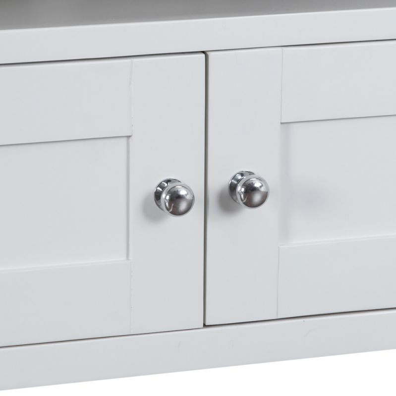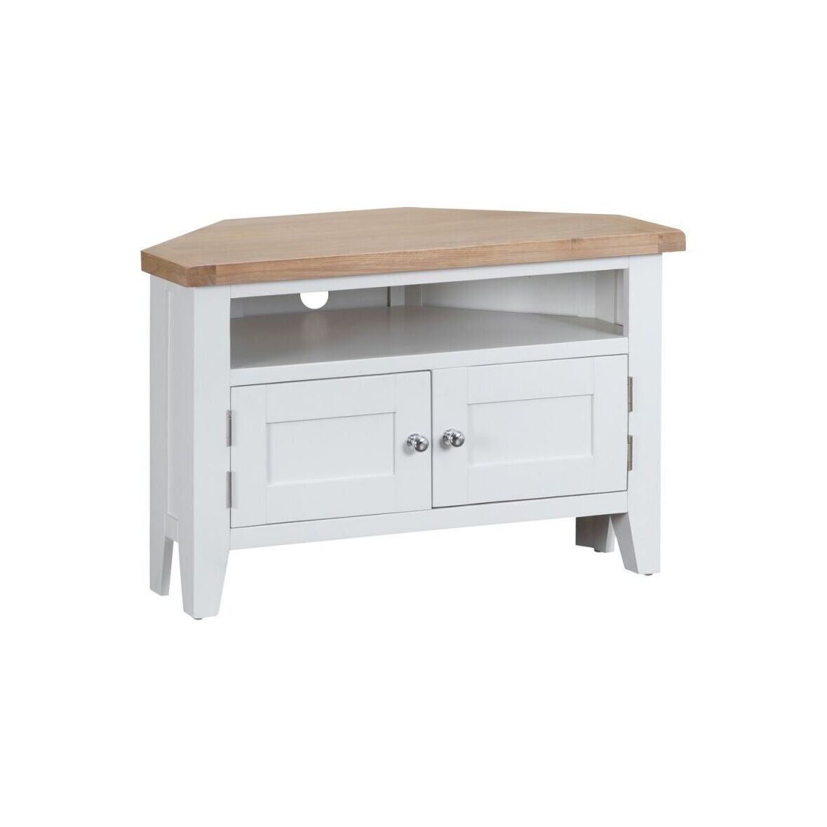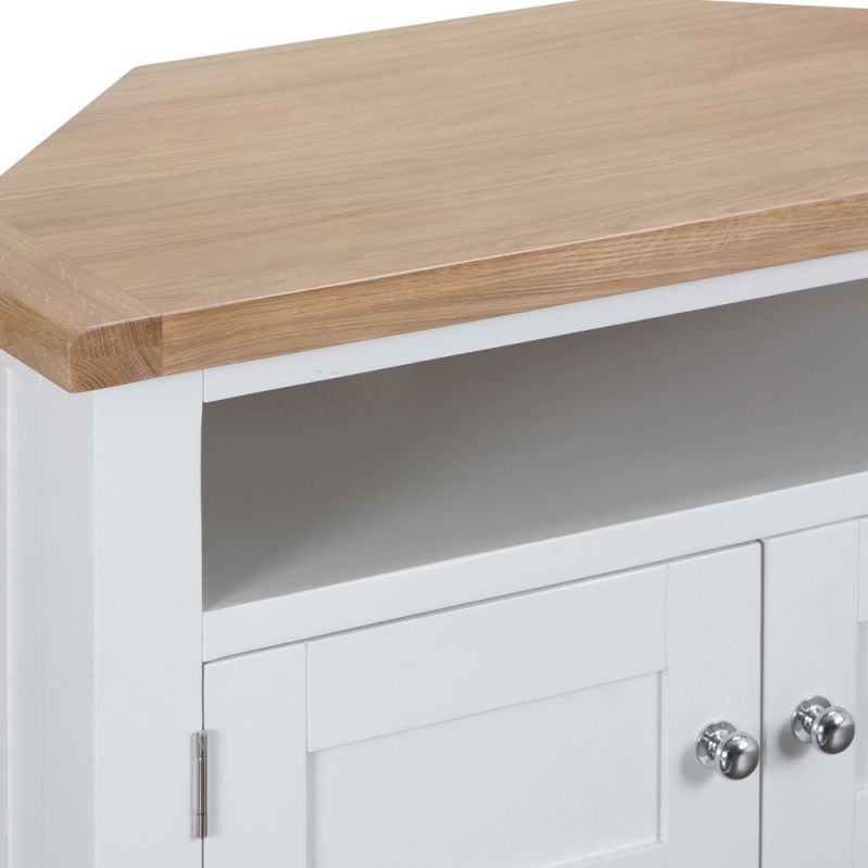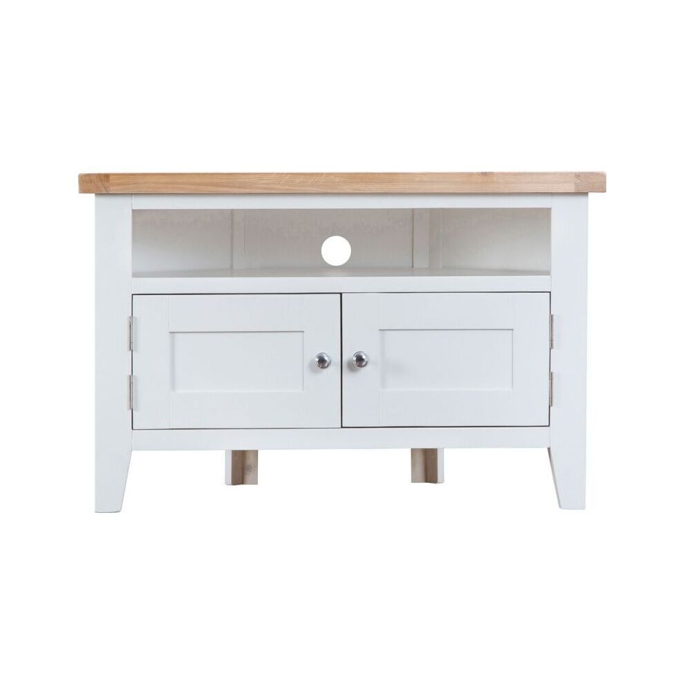 If space is at a premium, or you just need something to brighten up that corner of your living room then the Suffolk White Painted Oak Corner TV Unit is perfect for you. This TV Unit beautifully combines classic and contemporary furniture styles, with a sophisticated white painted solid pine frame and an outstanding chunky oak and real oak veneer top, which is far thicker than most on sale today, this TV Cabinet is a gorgeous piece sure to be on everyone's wish-list. A large 2 Door Cupboard and a large open shelf, as well as a generous surface area means this TV Stand is also very practical. Two chrome doorknobs add a further degree of class to this product and complete the look. The icing on the cake? This product arrives fully assembled so as soon as it's delivered you're good to go. This item is also available in Grey from Chiltern Oak Furniture in our Suffolk Grey Painted Oak Collection. Please note: This item is not pure/brilliant White. It is very slightly off white, described as 'old white'.
