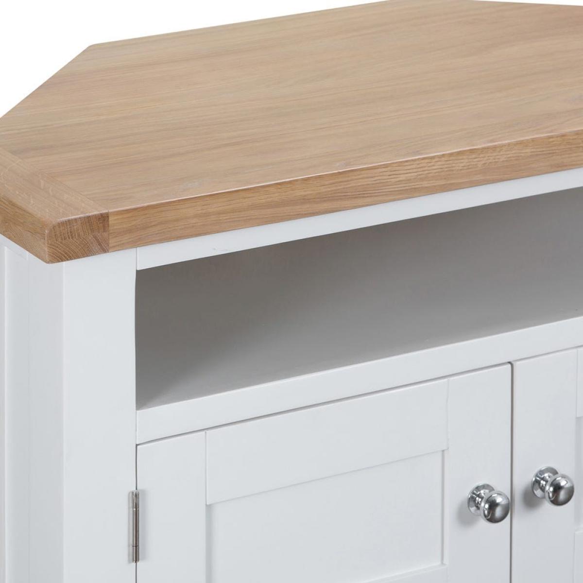 I really like this white painted oak corner TV unit for its versatile and fresh aesthetic. It works particularly well in coastal, Scandi, or cottage-style interiors where light, natural materials, and a touch of simplicity are key. The mixture of painted white and natural oak top offers a balanced look that can blend seamlessly with various colour schemes. Practical styling tips include layering with small plants, minimalist accessories, or decorative baskets to enhance its functionality without clutter. Its compact corner design is ideal for maximising space in smaller living rooms, while the neutral palette ensures it remains a timeless piece that can easily be updated with different accessories or contrasting textiles.