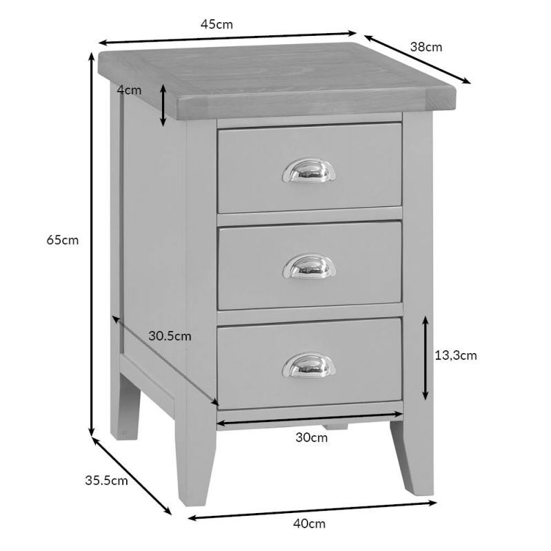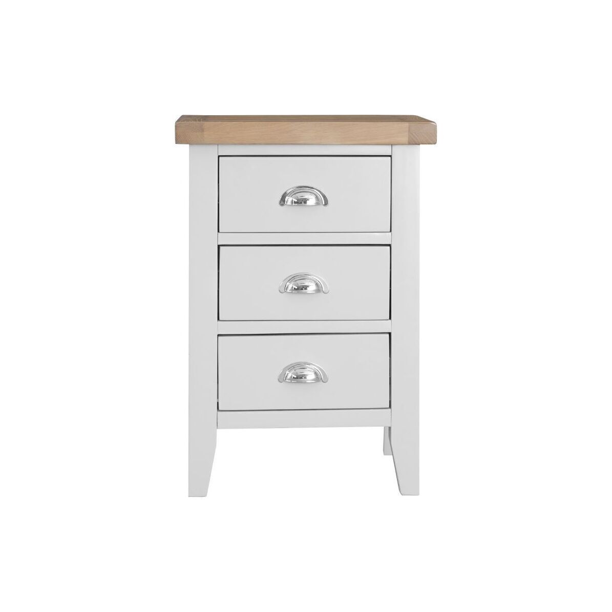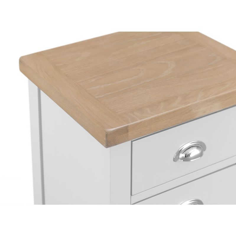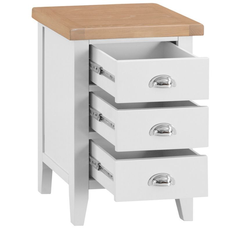 Looking for a reliable bedside table that will fit your evening knick-knacks and still have space for a lamp? The Suffolk white painted oak large bedside table has a 45cm surface to play with – good for a book, glasses and the all-important light. There are more compartments still – three 26cm drawers for pillow sprays and chargers that won’t fit on top. All contained in a solid wood, white-painted frame that echoes decor in country houses. The gleaming chrome cupped handles add a touch of modernity to the piece, proving that functionality can also be stylish. Please note: This item is not pure/brilliant White. It is an off-white, described as 'old white'.
