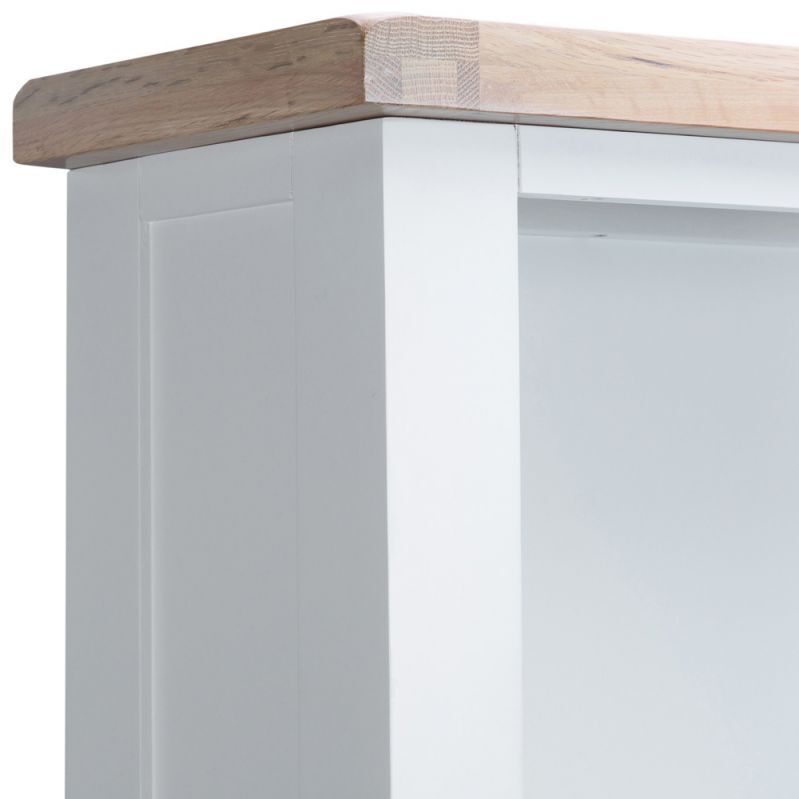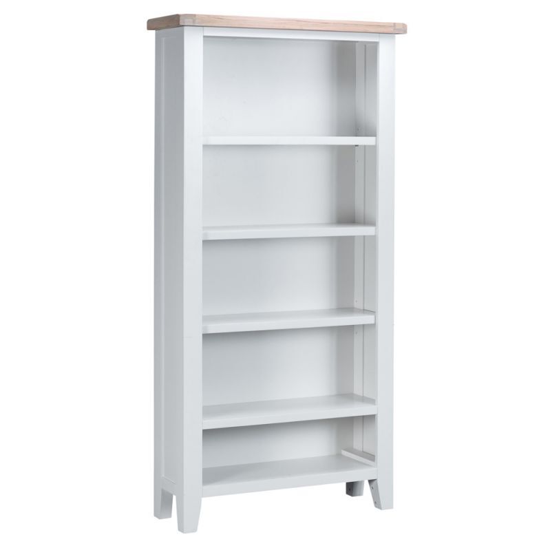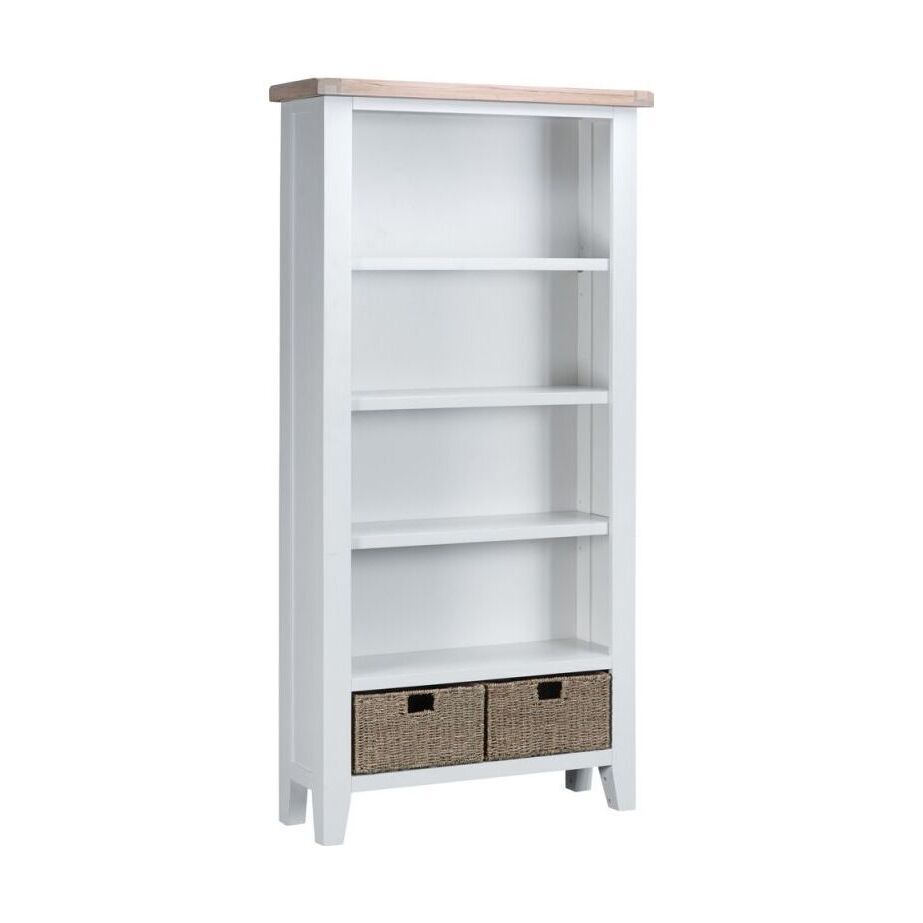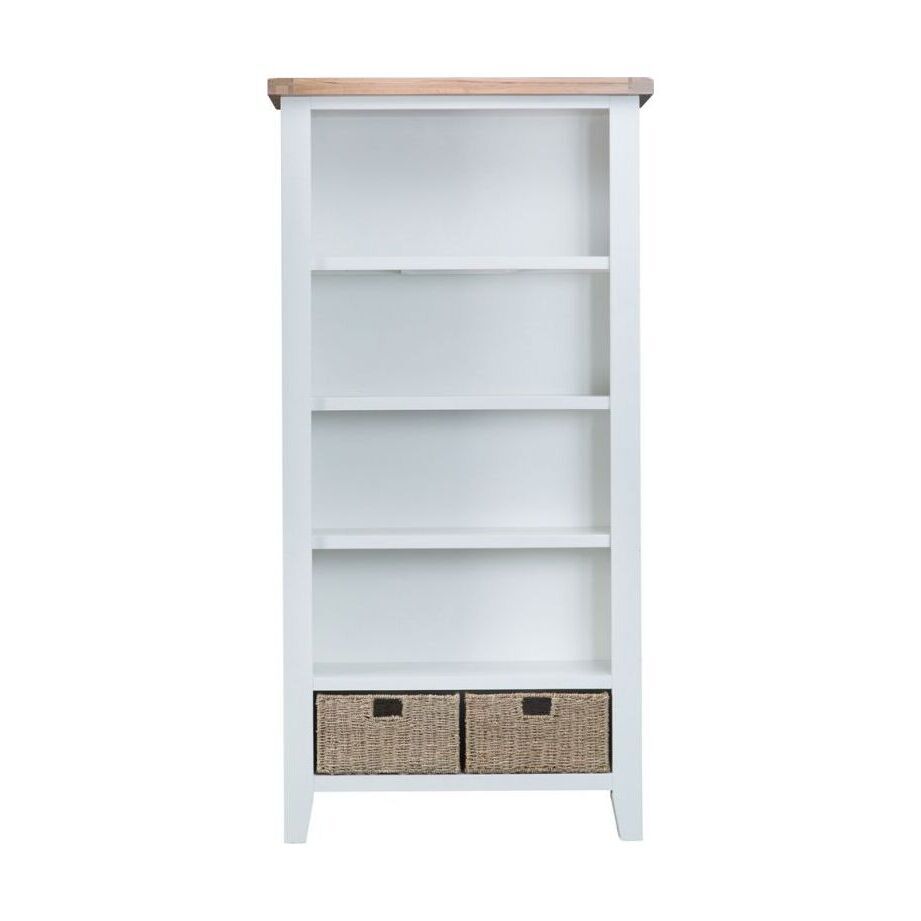 So you've got hundreds of Books, DVD's and CD's and need somewhere to store them? Well, the Suffolk White Painted Oak Large Bookcase may just be perfect for you. At 90cm wide and 180cm tall, this is a sizeable Bookcase and one that offers excellent storage facilities. Featuring plenty of shelving which is perfect for storing your Books, CDs and much more and two gorgeous rustic wicker baskets. Far from just practical, this piece is also extremely aesthetically pleasing, featuring a gorgeous white painted solid pine frame and a stunning chunky oak and real veneer top, which makes this item so immensely popular. But wait, there's more! This item arrives fully assembled so as soon as it's been delivered you're good to go. Feel like you need something a bit smaller? Be sure to check out the Small Wide Bookcase and the Small Narrow Bookcase in this range. This item is also available in Grey from Chiltern Oak Furniture in our Suffolk Grey Painted Oak Collection.
