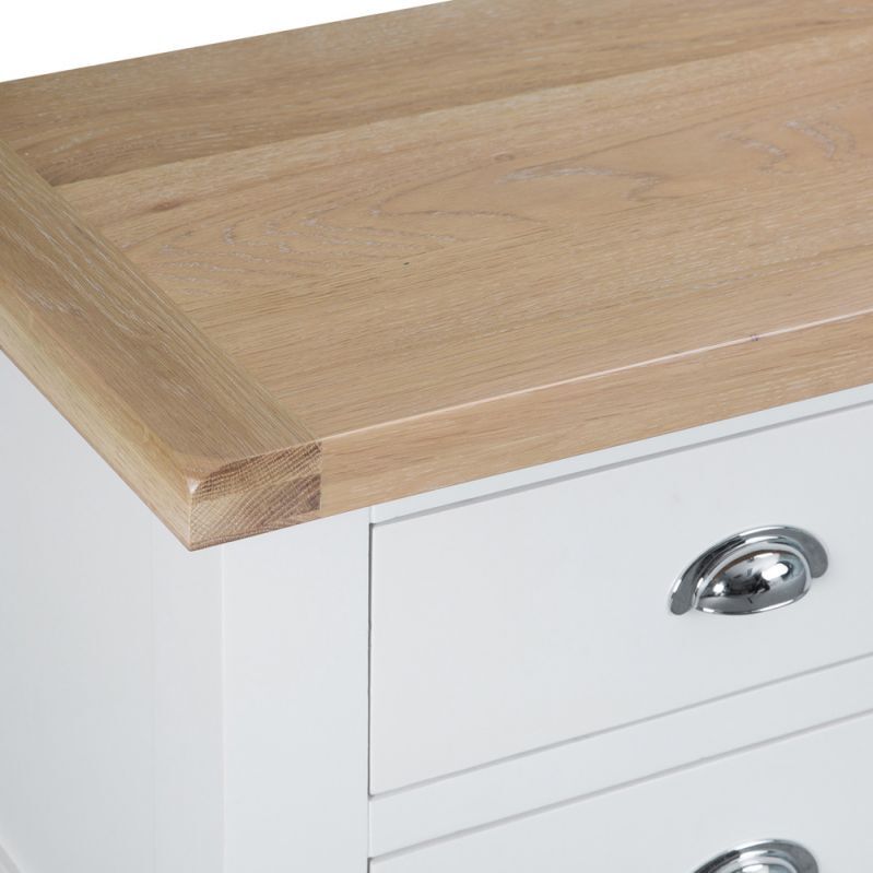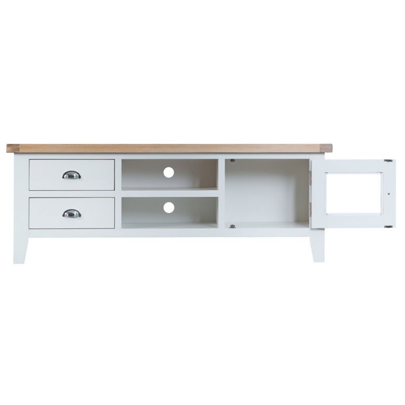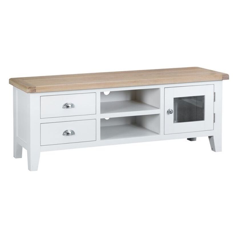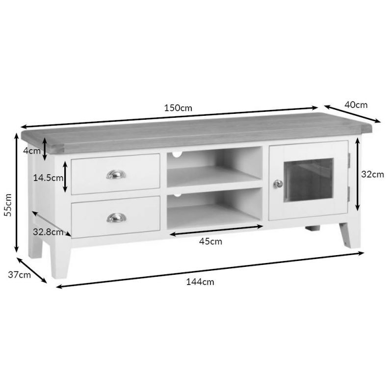 Sometimes bigger is just better, and there's certainly a case for this with the Suffolk White Painted Oak Large TV Unit. At 150cm wide, this TV Unit is a sizeable piece, but an extremely practical one, featuring two open shelves with pre-drilled holes which are perfect for storing your DVD Player and Digital TV Box. As well as this there's a 1 Door cupboard and two drawers, perfect for stashing DVD's in. Far from just being practical this TV Cabinet is also aesthetically pleasing, featuring an elegant white painted solid pine frame as well a stunning thick oak and real oak veneer top. Exquisite chrome rounded handles and doorknobs complete the look and add a further degree of sophistication to this TV Stand. The best bit? This item arrives fully assembled, so as soon as it's delivered you can get it into your living room straight away. Looking for something smaller? Be sure to check out the Standard TV Unit in this range. This item is also available in Grey from Chiltern Oak Furniture in our Suffolk Grey Painted Oak Collection.