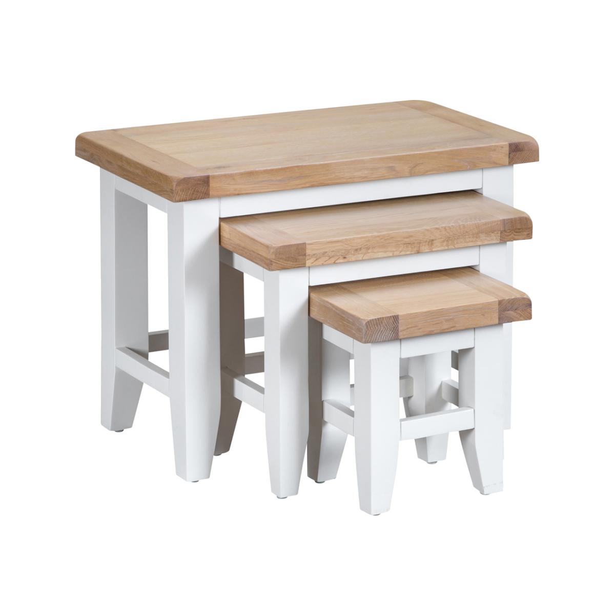 They say the best things come in threes. Well, there’s certainly a case for this with the Suffolk White Painted Oak Nest of 3 Tables, an item handpicked by us here at Chiltern Oak for its excellent build quality and exquisite style. Featuring an elegant white painted solid pine frame and outstandingly chunky oak and real oak veneer top, these nesting tables are aesthetically stunning and as such are sure to make your friends jealous. Far from just a pretty piece of furniture, this Nest of Tables is also extremely practical. With not just two, but three tables, meaning you can host a whole group of friends with ease. Each of these tables also has a generous surface area, which is the perfect place for the traditional British cup of tea. The icing on the cake? This item arrives fully assembled so as soon as it’s delivered you’re good to go. Feel like you only need the two tables? Be sure to check out the Nest of 2 Tables in the Suffolk White Collection. This item is also available in Grey from Chiltern Oak Furniture in our Suffolk Grey Painted Oak Collection.