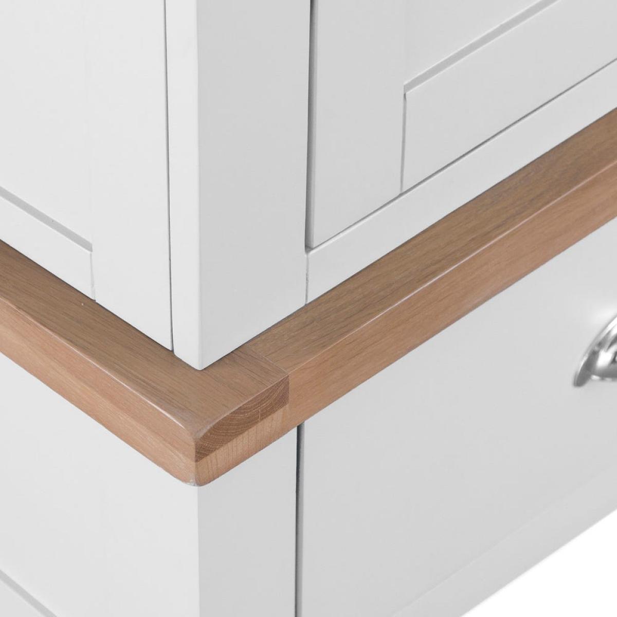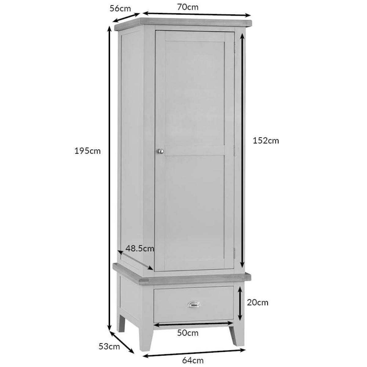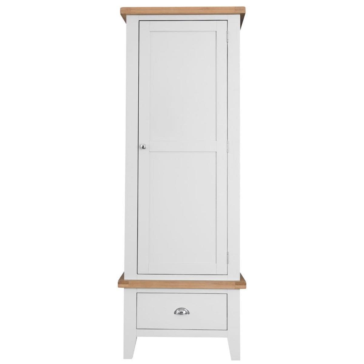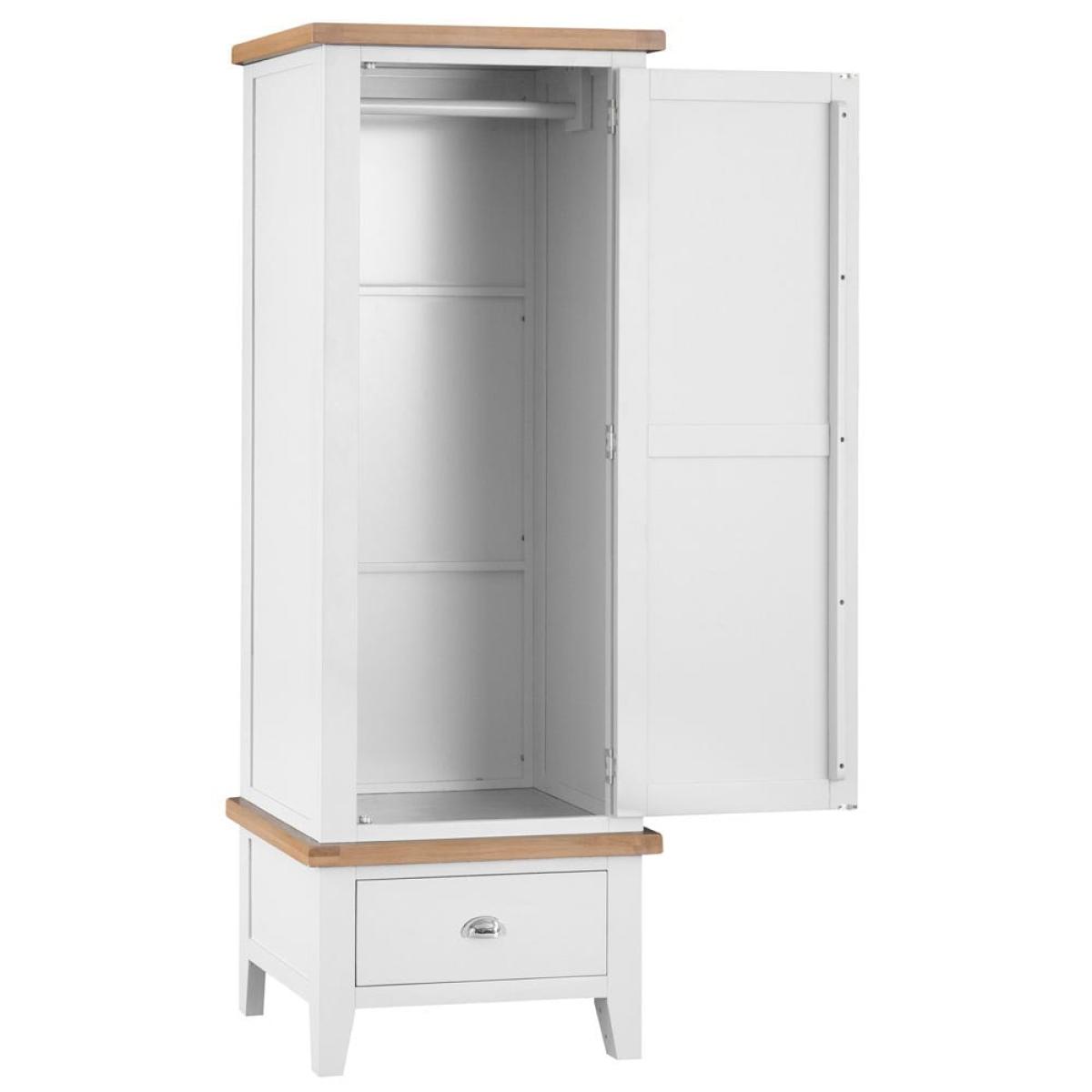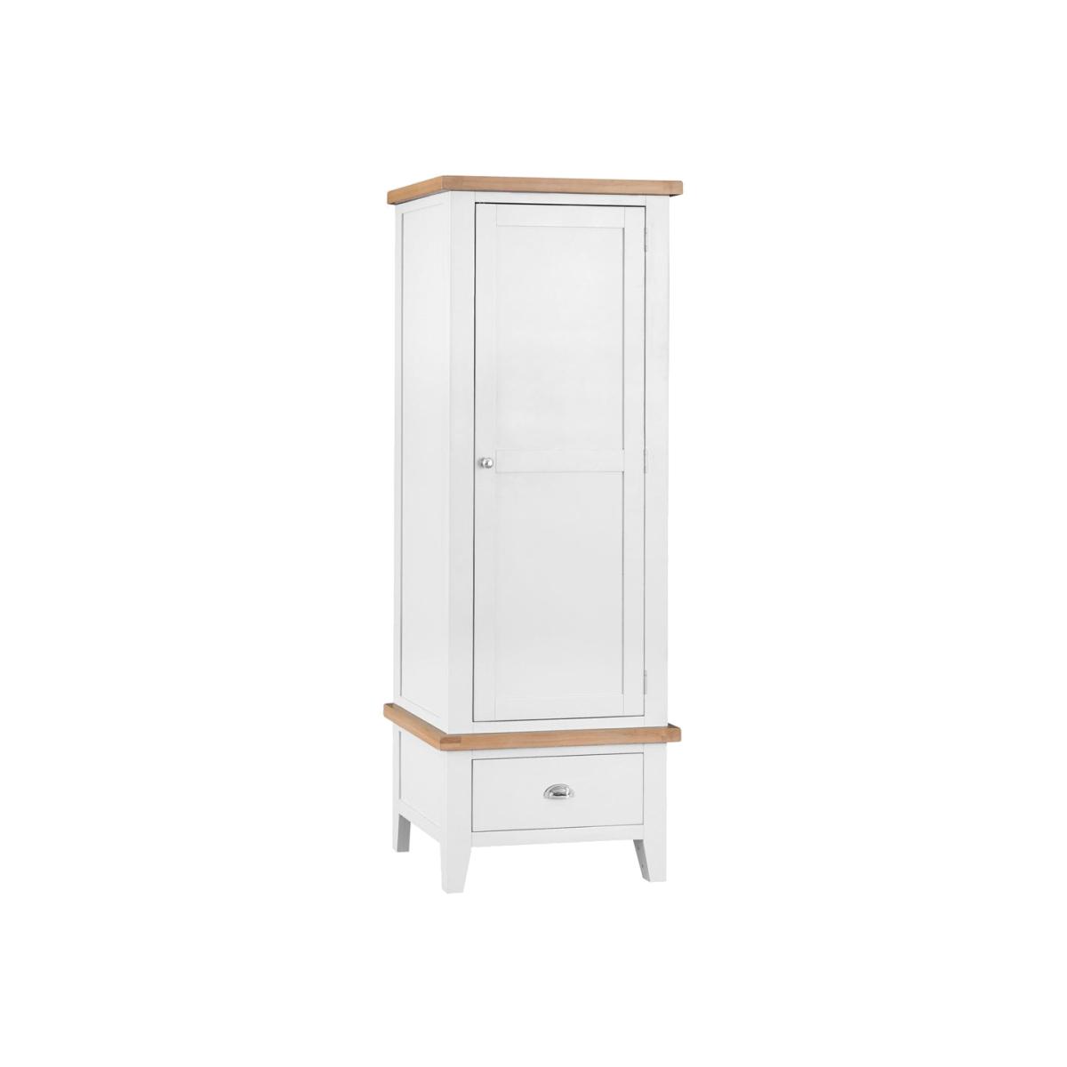 When your main closet is overflowing and you need some extra space, throw your additional jackets and jumpers into our Suffolk white painted oak single wardrobe. Its single size means it can be slipped into an unused spot in your room, and this slimline cupboard has plenty of room despite its stature. It comprises one 152cm section with a rail for hangers, and one 53cm drawer at the bottom which is the right size for shoes and slippers. As well as being functional, this piece is stylish too – its solid wood frame is hand-painted in a goes-with-anything white. Please note:This item is not pure/brilliant White. It is an off-white, described as 'old white'.