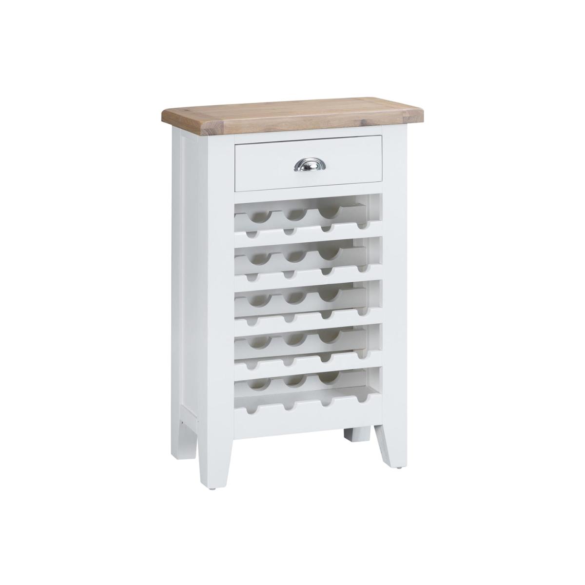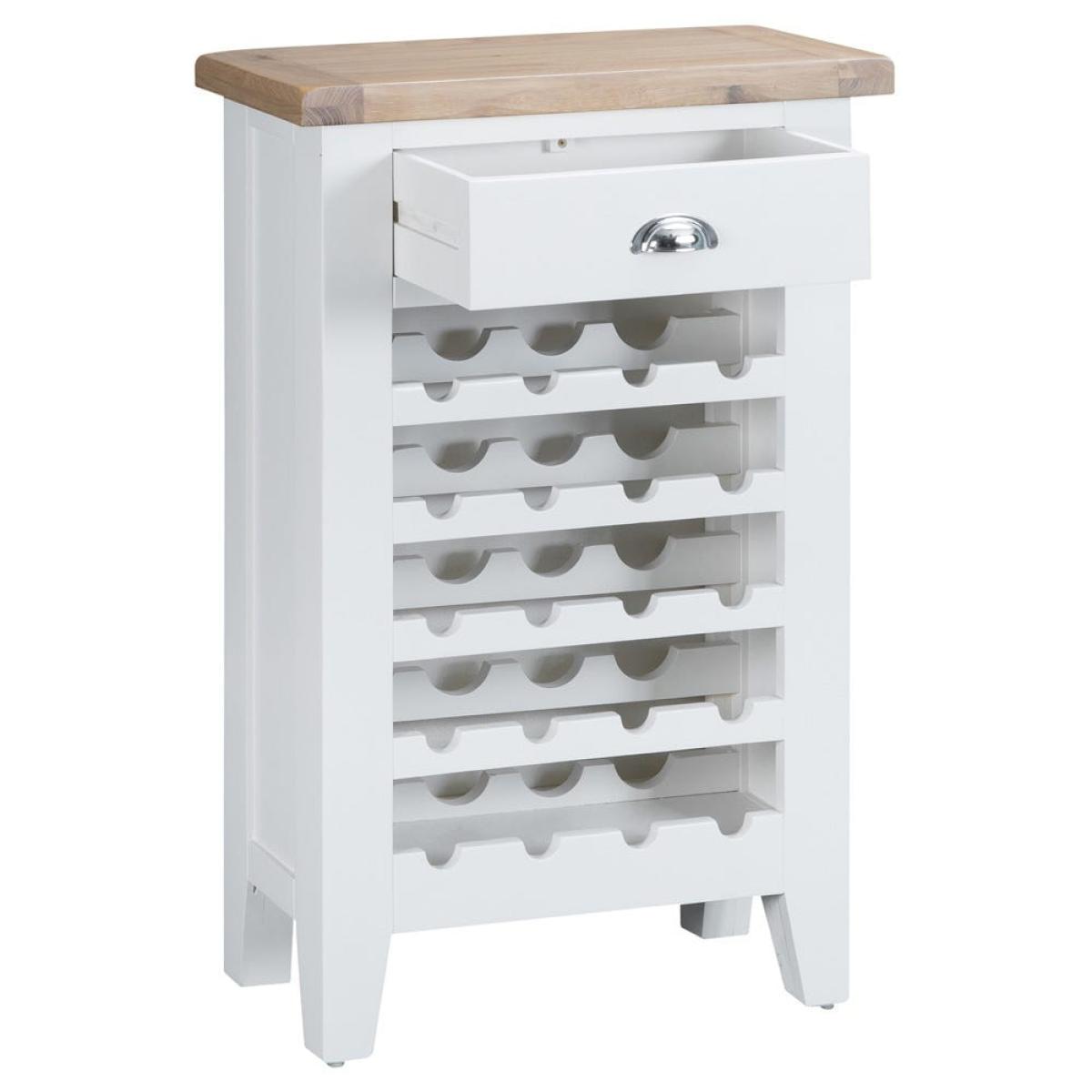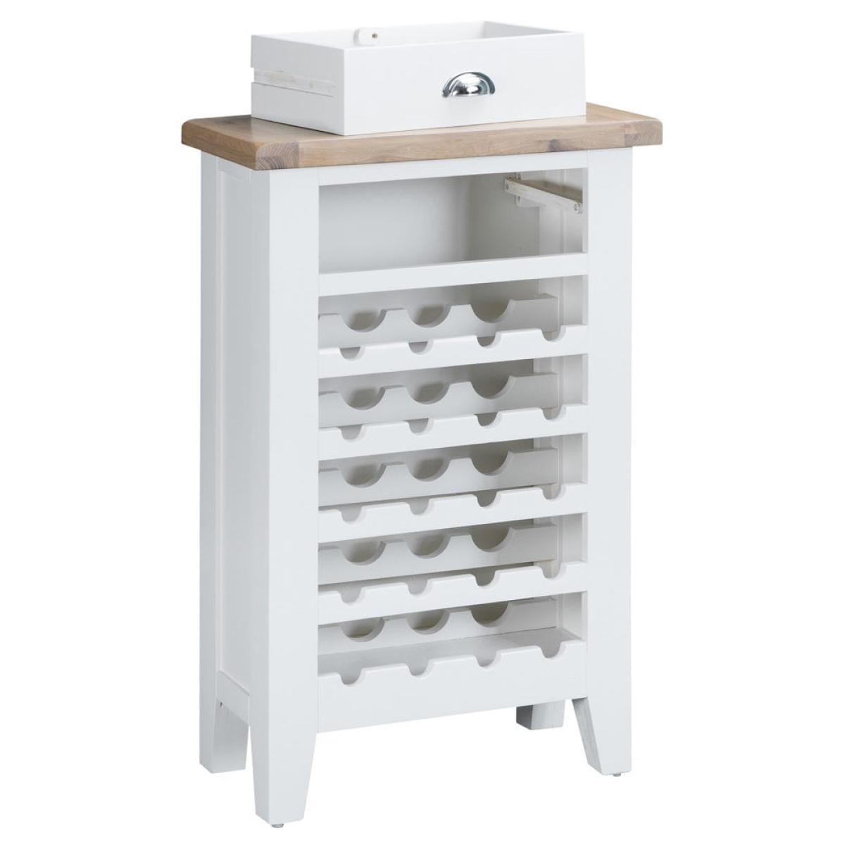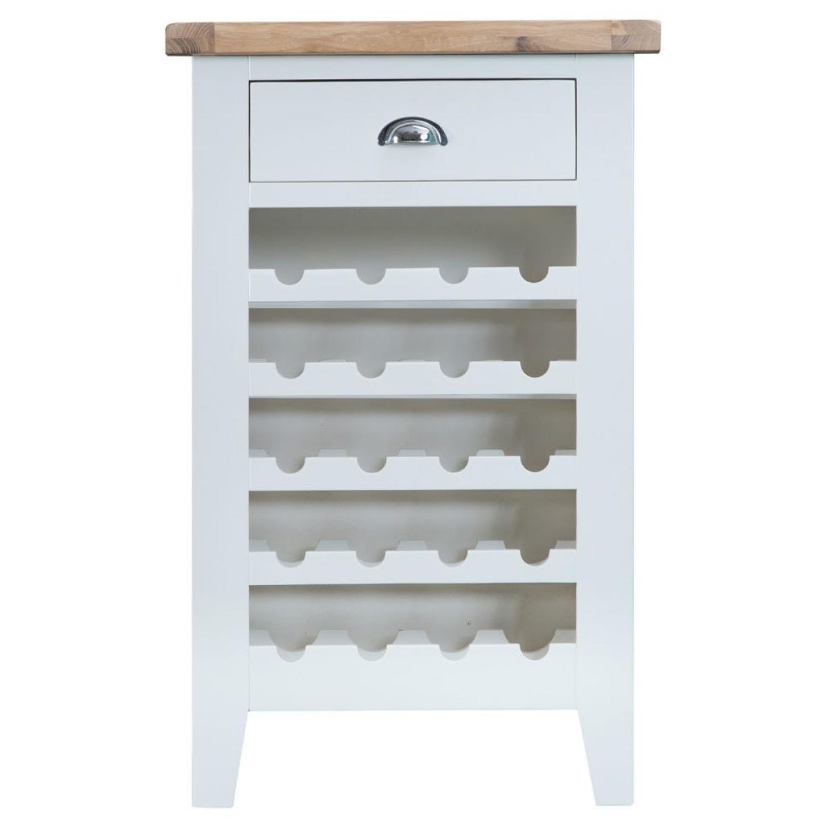 If the undrunk wine bottles are piling up – it’s easy to overstock when guests are coming – store them in our Suffolk white painted oak wine cabinet. The clean lines and traditional solid oak of this piece bring a modern-meets-traditional feel to your kitchen. There’s room for a few dinner parties’ worth of tipple, as this generous rack has 15 slots for standard 750ml bottles. Each space leaves the label visible, so it’s easy to grab your favourite in a hurry. For extra convenience, there’s a 38cm drawer at the top where you can stow bottle openers and stoppers. Please note: This item is not pure/brilliant White. It is an off-white, described as 'old white'.