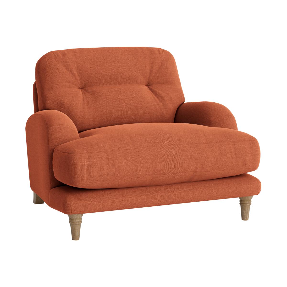 I love this armchair for its inviting, laid-back vibe and its warm terracotta hue, which adds a touch of cosy charm to any space. It works particularly well in eclectic, boho, or modern interiors, where its playful shape can bring a relaxed yet stylish feel. Practical styling tips include pairing it with textured cushions or chunky throws for extra comfort, and layering with a or patterned rug to anchor the seating zone. Its versatile colour also means it complements a range of colour schemes, from neutrals to richer jewel tones, making it a great addition to both contemporary and vintage-inspired interiors.