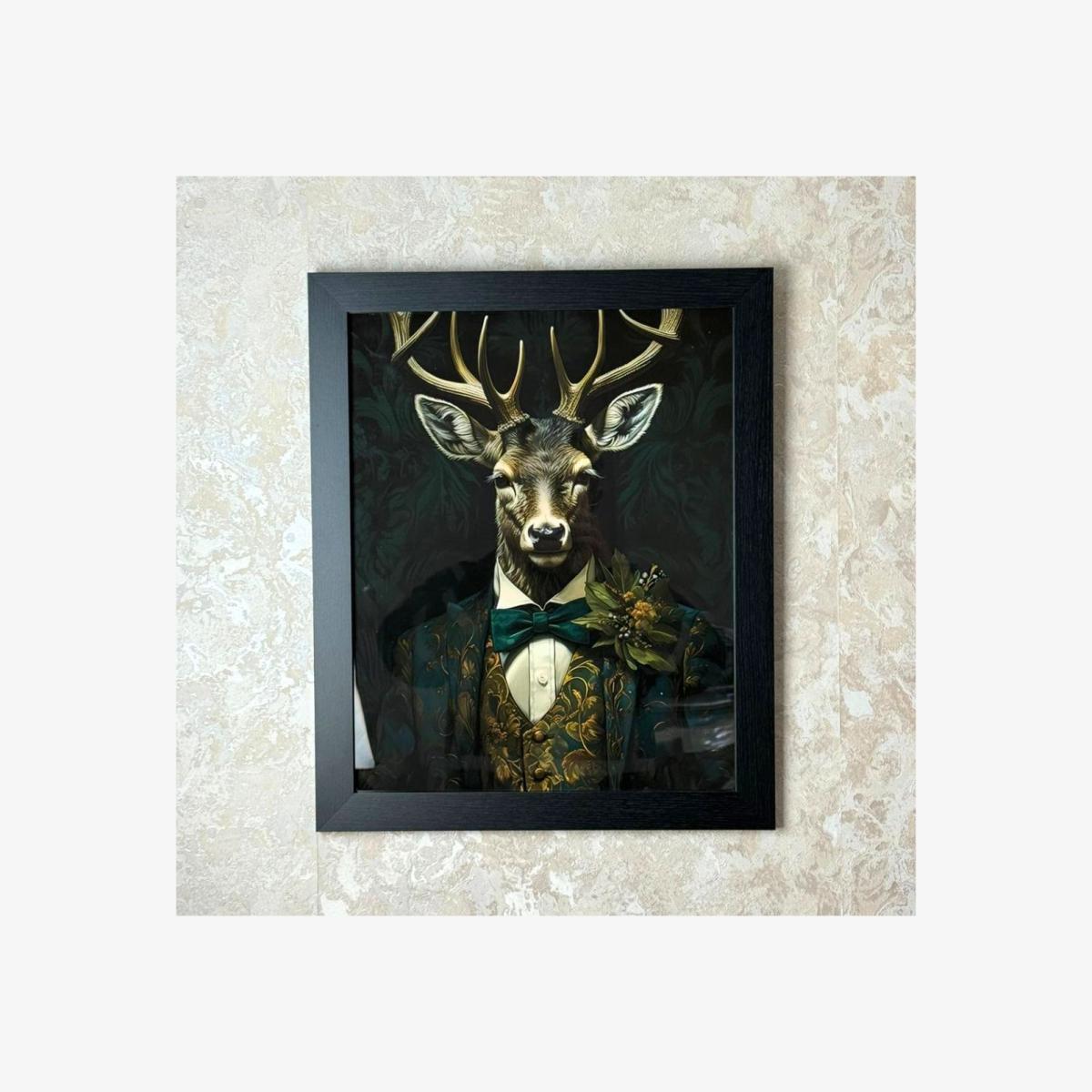 Suited Stag wall art, featuring a black wooden frame. A playful yet refined piece, the Suited Stag wall art features a well-dressed stag portrait set against a dark backdrop. The characterful design is framed in a sleek black frame, adding a modern touch to this quirky artwork. Ideal for adding personality to living rooms, studies or hallways.