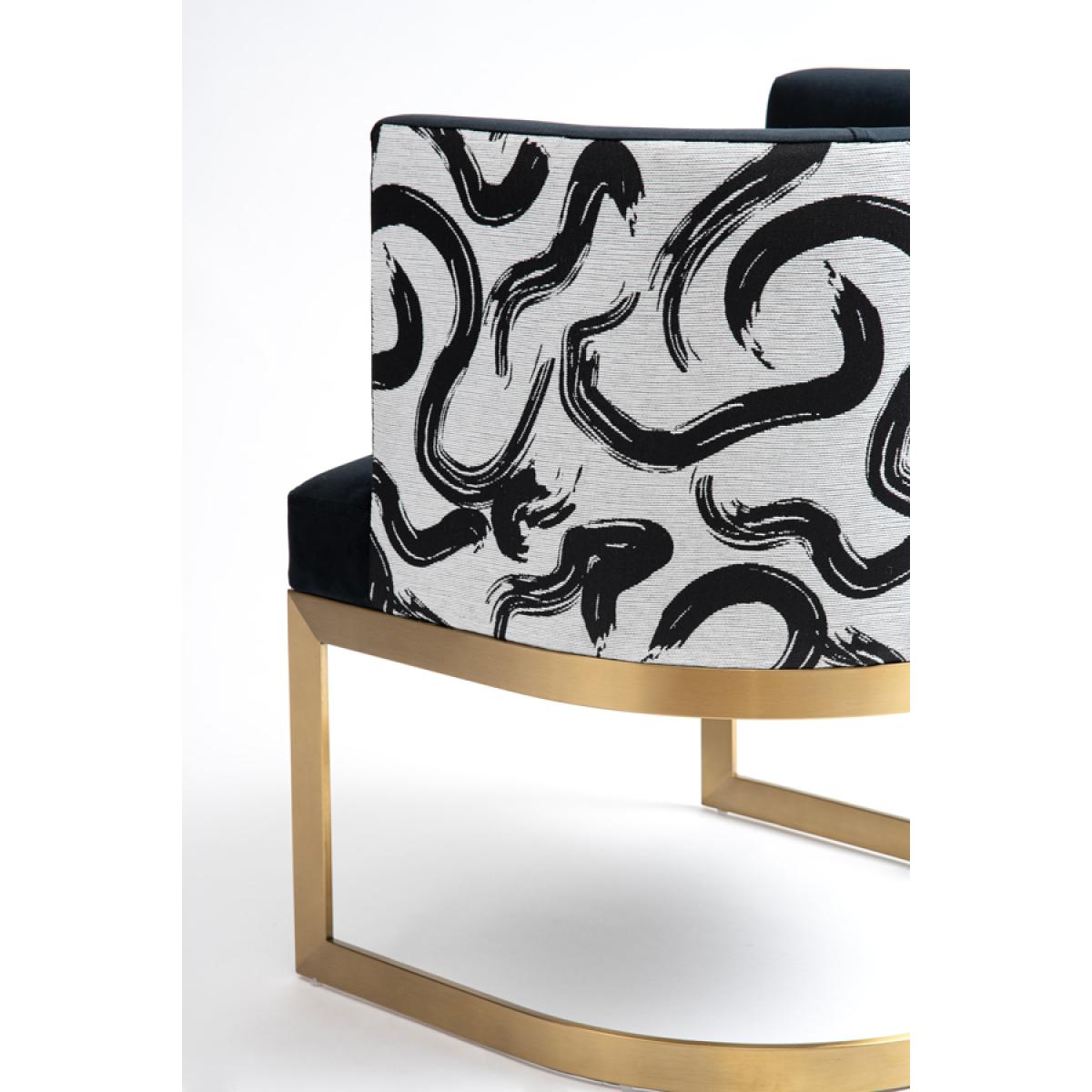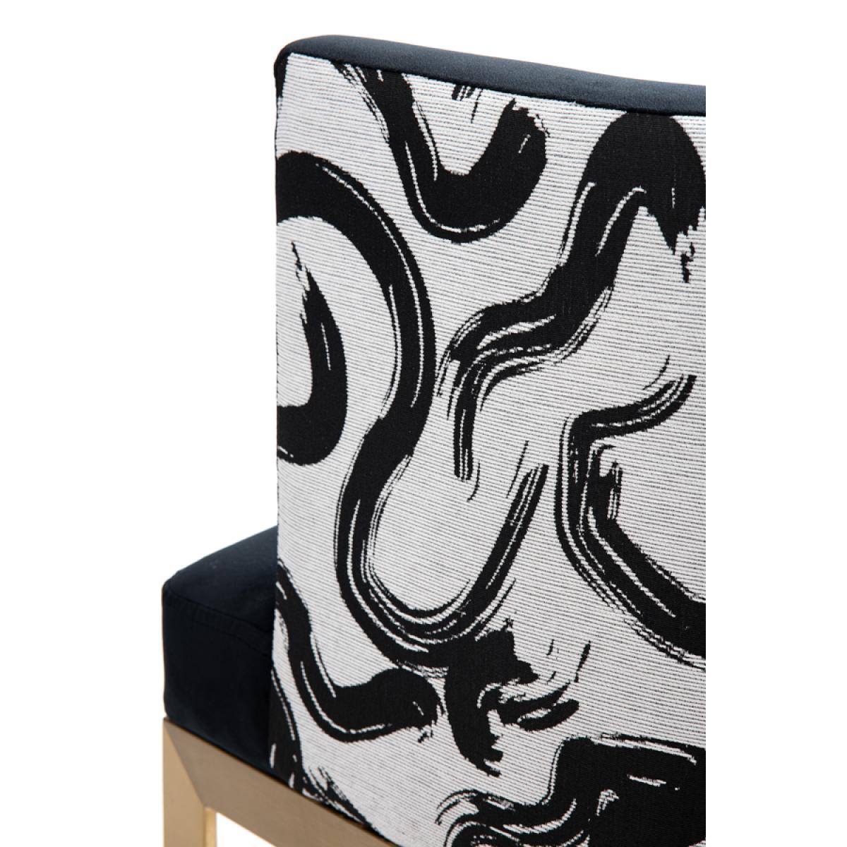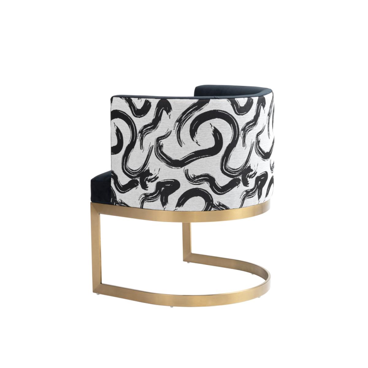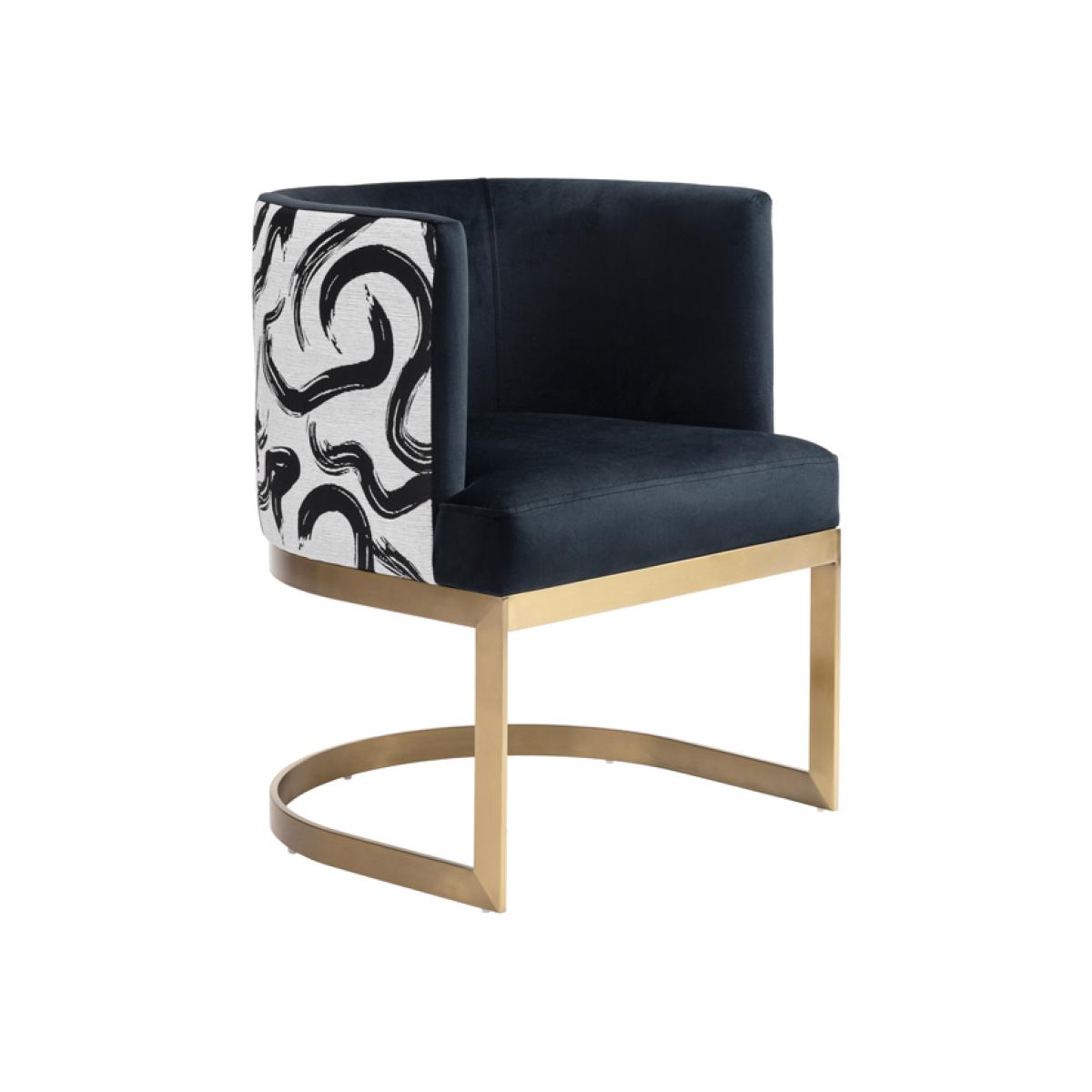 A contemporary dining chair inspired by highly collectible American mid-century furnishings with a playful twist. Brushed Brass Base. Velvet upholstery seat fabric. Jacquard woven patterned fabric to back.