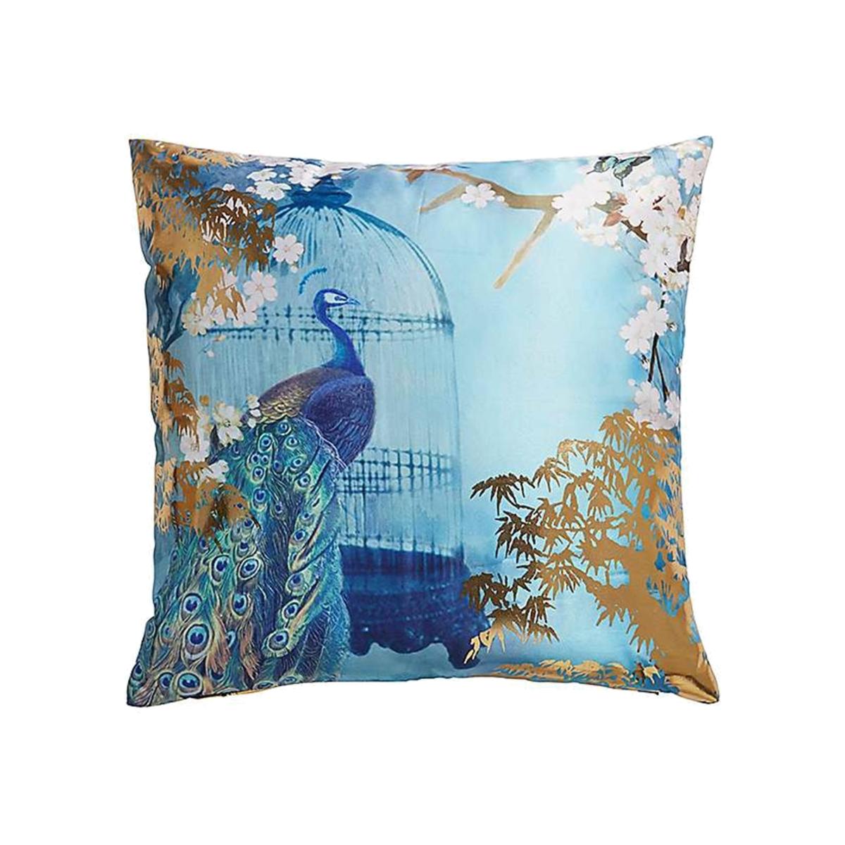 Arthouse Suki Teal Foil Peacock Bird Printed Reversible Filled Pillow Padded Cushion Cover Size 45 x 45cm. An elegant square cushion, which co ordinates with the other Suki items in this collection. A different image on each side, with gold foil detail. Peacock and bird of paradise framed by cherry blossom and leaves. his double sided cushion features a gorgeous peacock in jewelled colour ways on a teal background and gold foil detail. Approximate dimensions are 45cm x 45cm, Filling: Polyester, Cover:Zip removable, Full matching collection of wallpapers and accessories. From the Arthouse design house.