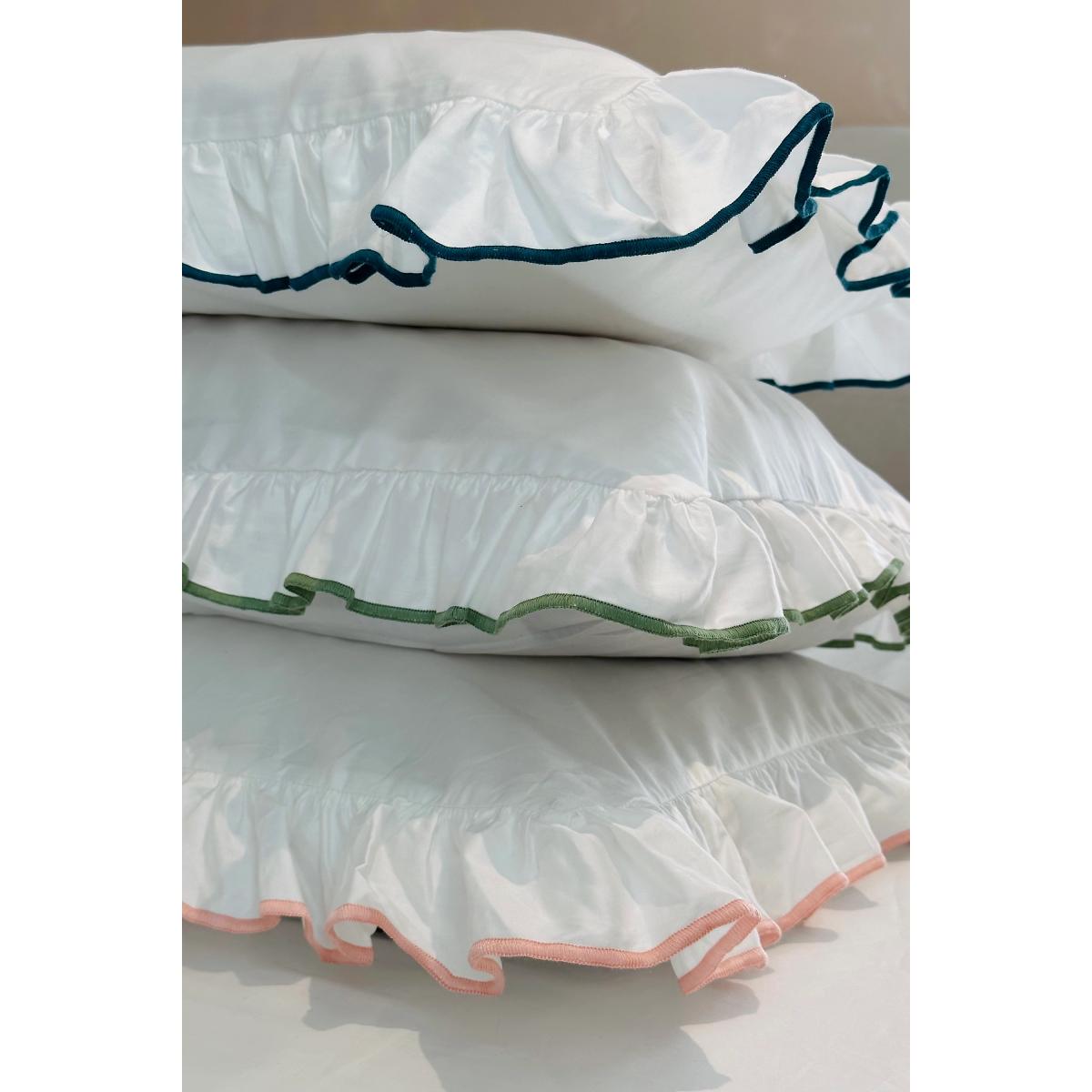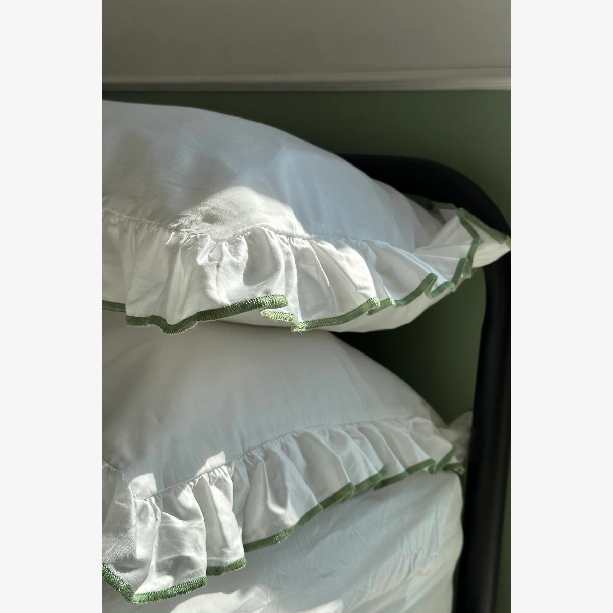 The Sukun Provence-inspired pillowcase features an elegant frill and an olive green trim - where dreams meet French elegance. Immerse yourself in a wold of whimsical charm and romantic allure as you indulge in these rich, buttery soft cotton sateen pillowcases * By Sukun * Set of two * 100% Cotton Sateen * 400 thread count * Central envelope closure * Oeko-Tex 100 certified to be safe against delicate skin * Bedding is contained in plastic free, reusable cotton cases that can be used to store and protect them from dust * Machine wash * Air dry or tumble dry low * Imported
