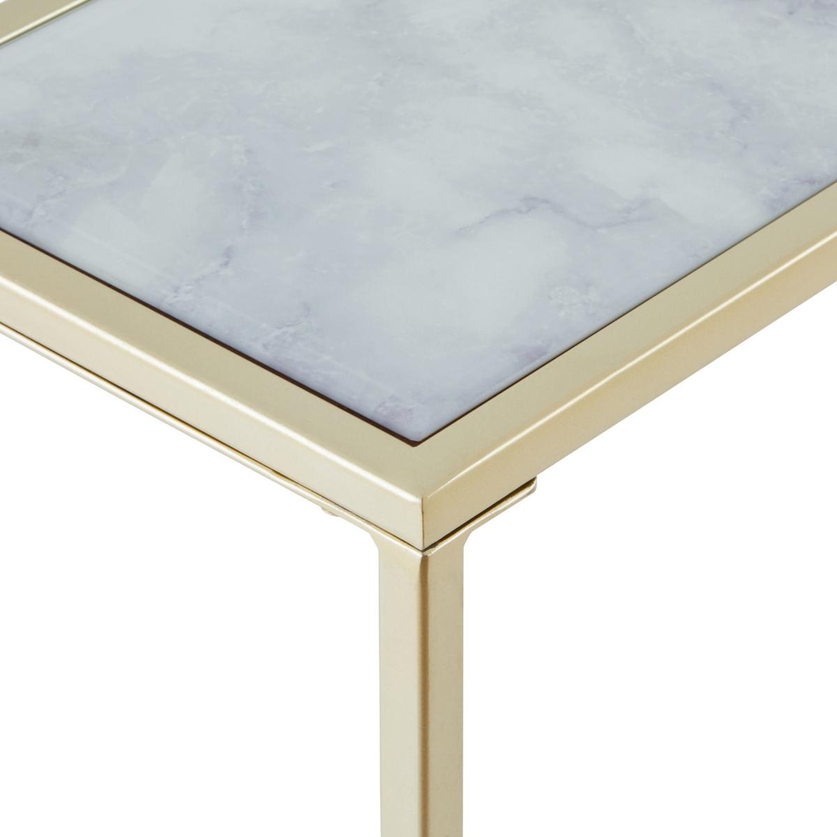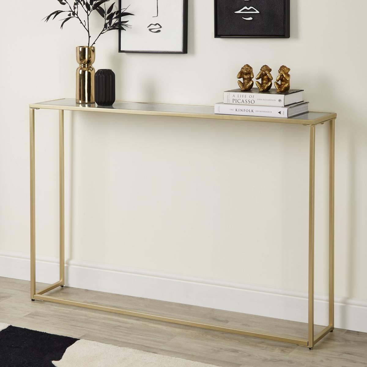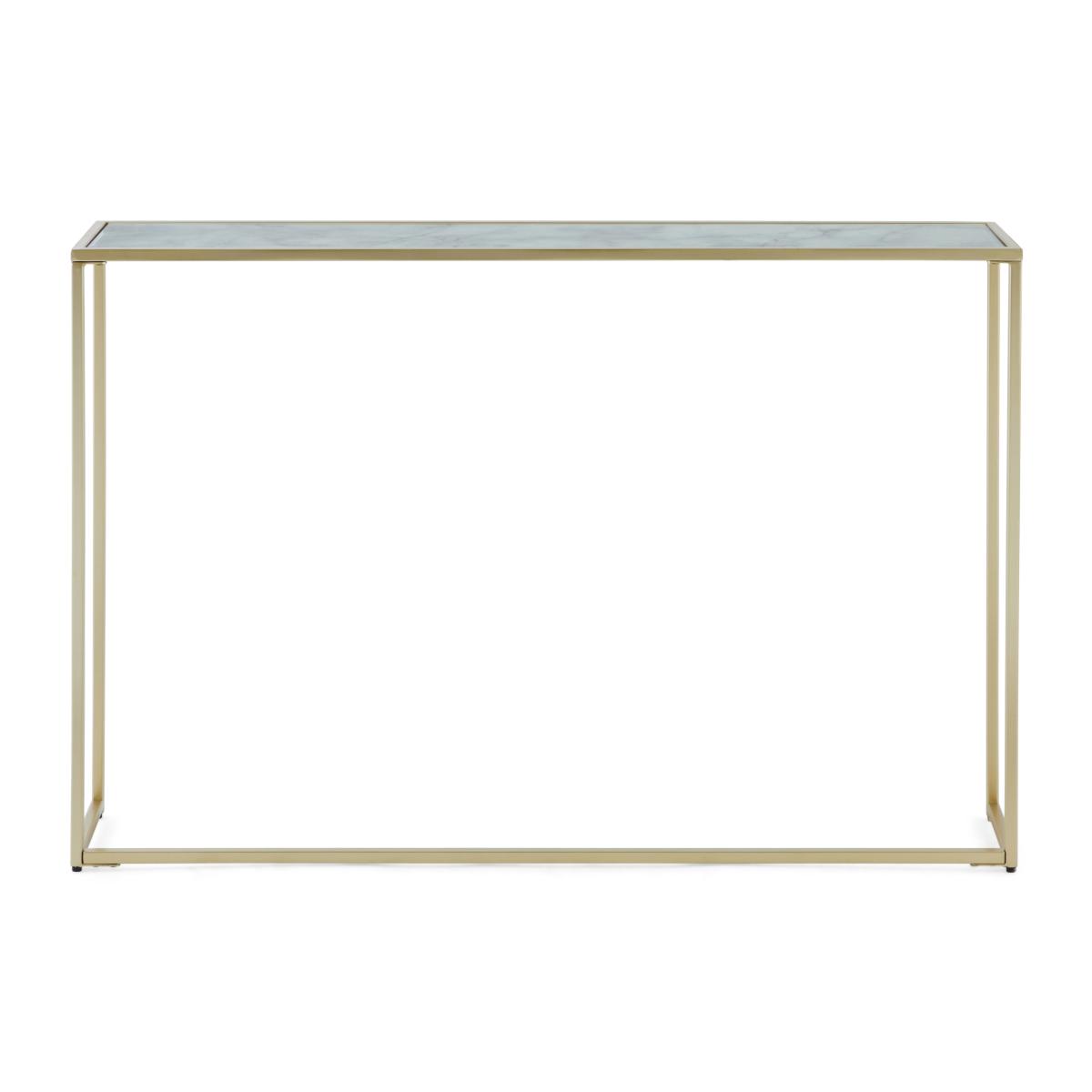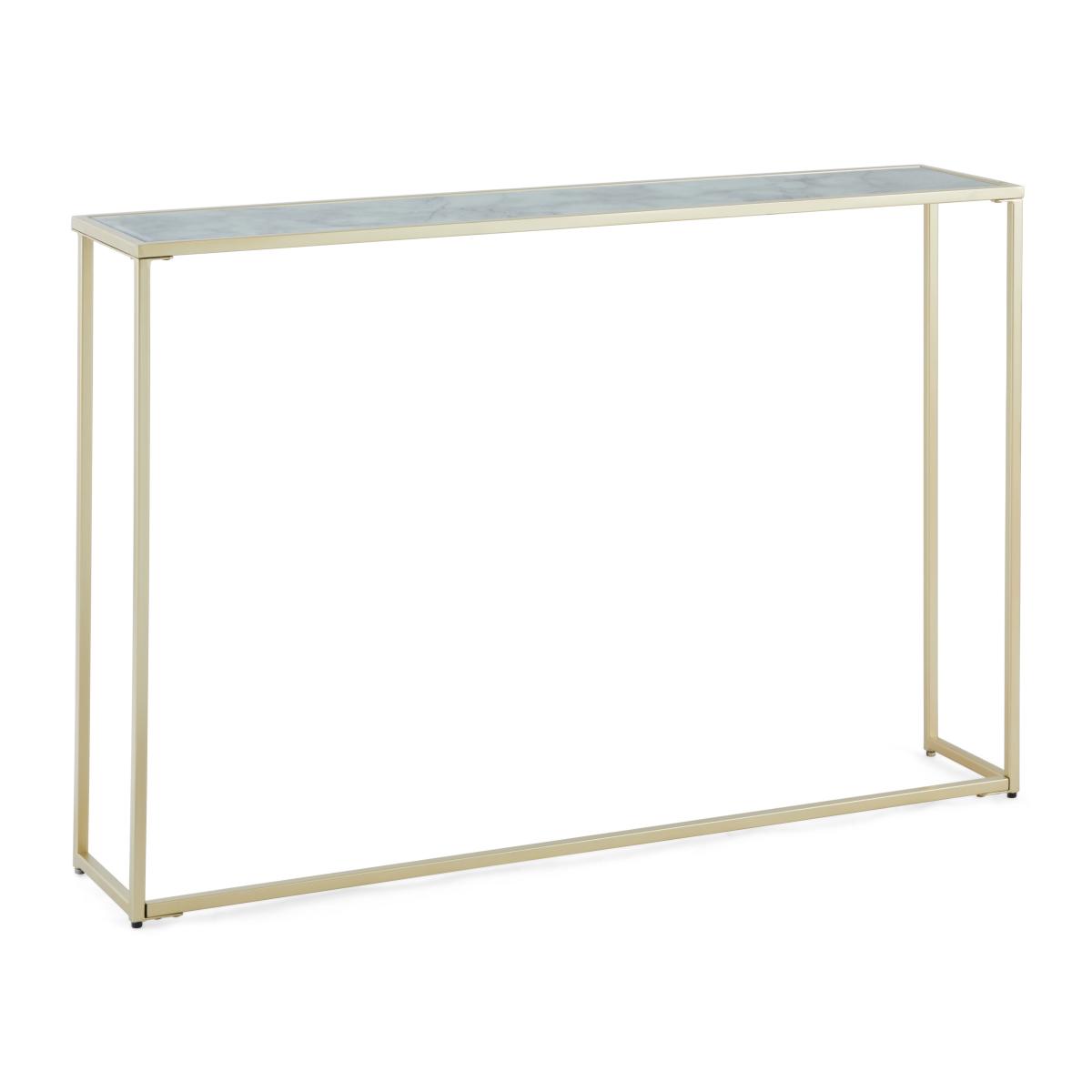 The Sullivan Gold Marble Effect Wide Slim Console Table is modern, luxurious, and simple. The stunning gold-effect metal combined with the luxe marble effect tops creates a console table with style and practicality in one. Perfect for smaller spaces such as hallways and entryways, or spaces that require extra counter or storage space such as offices. This sleek console table can also be used over a radiator to make use of unused space and is a great way to add some extra décor. Please be aware if this console is used above a radiator the table may become hot.