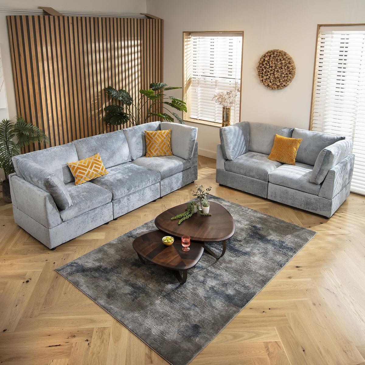 Versatile and comfortable, this 3 seater and 2 seater sofa set will transform your living room into a cosy haven. This is a Modular 2 Sofa Suite in a blue textured chenille fabric offering comfort and flexibility. With a modular design and secure clips, you can rearrange the sofa modules to suit your room layout. Expandable and adaptable, this sofa set allows you to add additional modules for even more seating space. Each module measures around 80cm, providing you with the freedom to customise the size and shape of your sofa according to your preferences. Whether you have a large living room or a compact space, this sofa is the perfect fit. The Sully sofa has a modern silhouette with clean lines. Our carefully designed cushions allow you to envelop yourself in comfort with our super soft premium fabric, offering total relaxation and support with a seat height of 46cm. This sofa is even more adaptable with low-profile black feet that blend with any interior decor. Each sofa section measures around 80cm x 80cm and requires the backrest and feet to be attached. The backrest is separated from the base so that the sections can be taken through slim doors and passageways at least 47cm wide. Upgrade your living room and elevate your lounging experience with our super-comfortable Sully modular sofa set. 3 Seater Size W240cm D80cm H85cm 2 Seater Size W160cm D80cm H85cm Fully modular design: this set includes 4 corner sections, 1 middle section