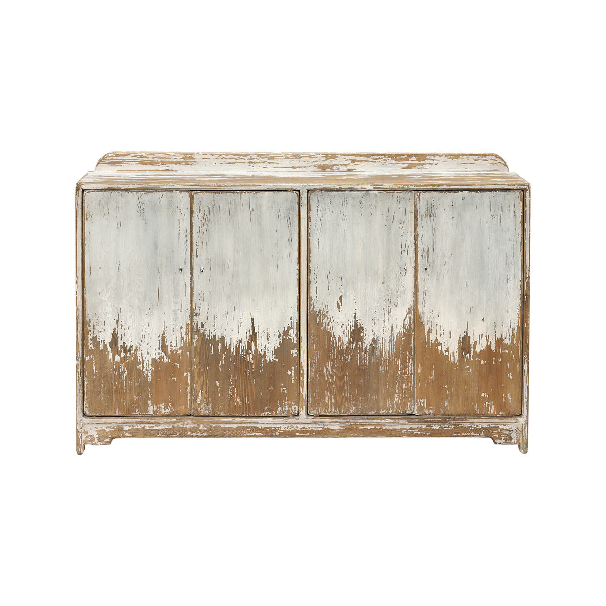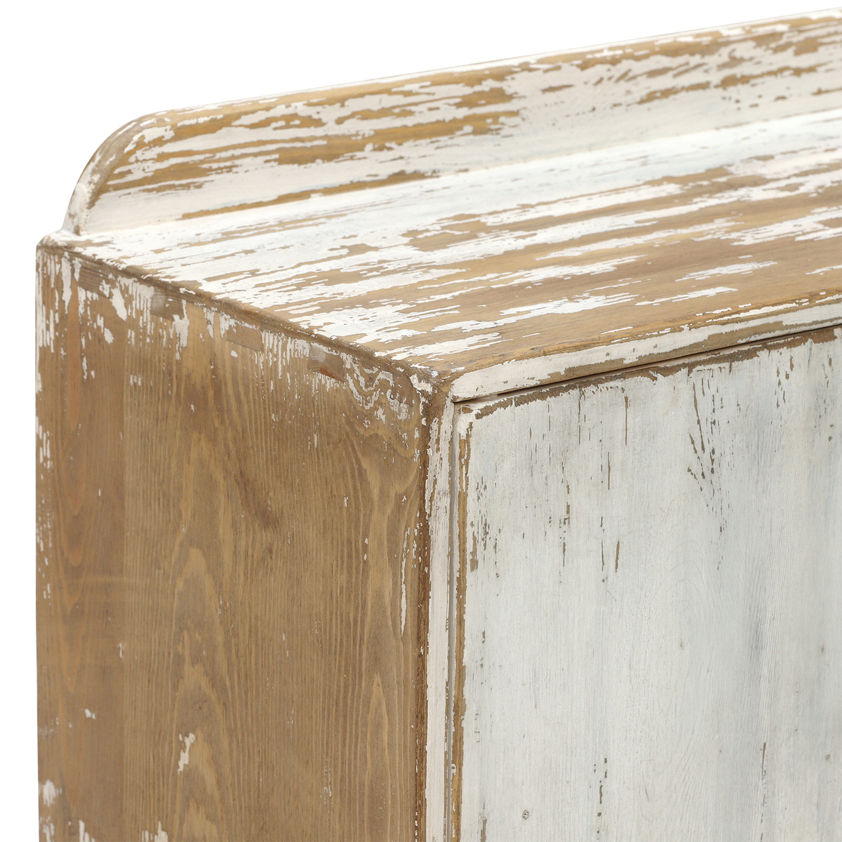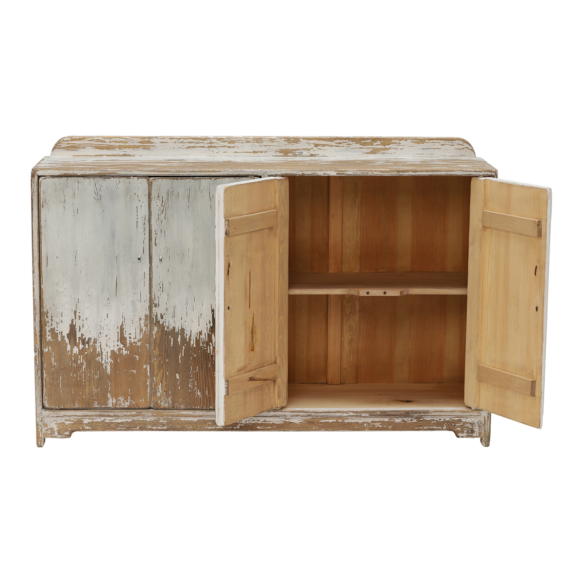 Offering a rustic appeal that complements both shabby chic and eclectic interiors, the Sulong console table boasts traditional style with an edge. Made entirely from solid pine, it features a whitewash finish that has been partially distressed, creating a striking effect that allows the natural wood to show through. Discreet metal loop handles decorate the two cupboard doors, which open to reveal a fixed shelf and ample space inside – perfect for any home that requires a little extra storage. With its simple silhouette and subtle curves to the back and apron, this piece makes an impact whether dressed up with accessories or left to speak for itself. Explore the full Sulong range to complete the look.