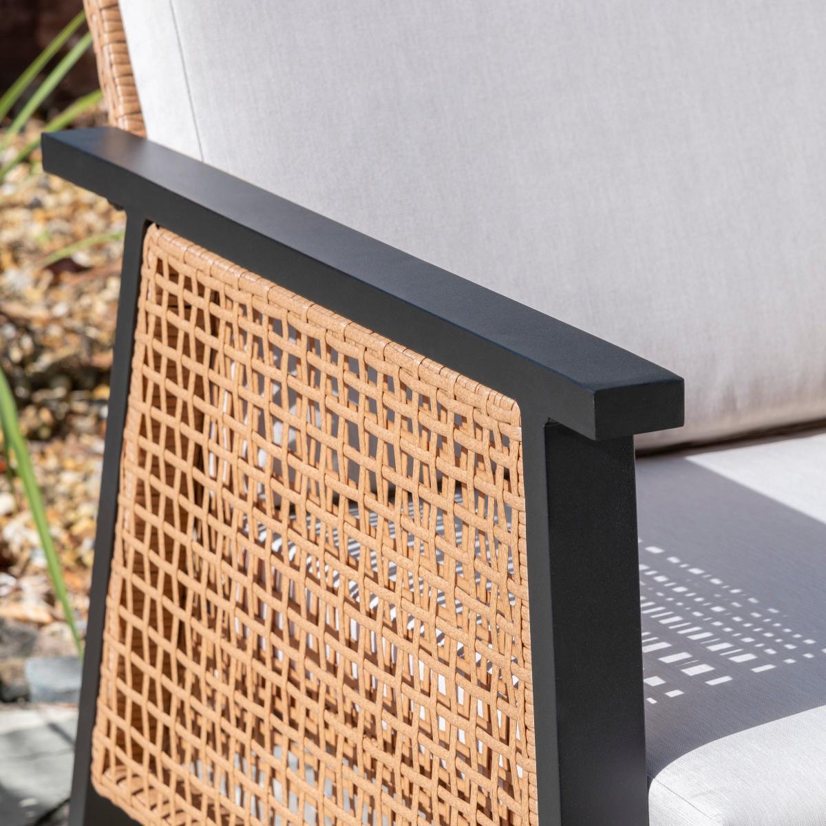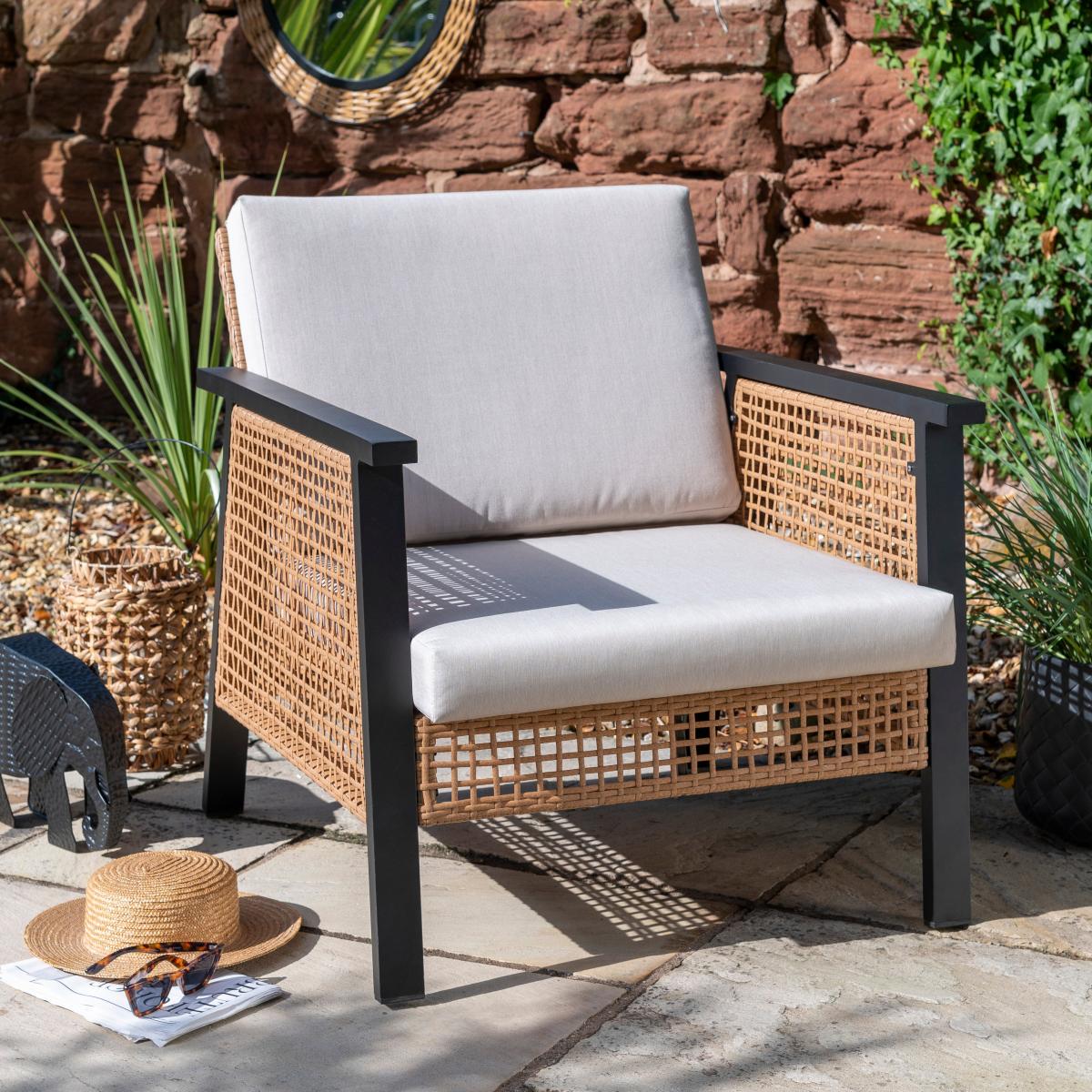 I love this garden chair for its blend of natural rattan detailing and sturdy black frame, which adds a contemporary edge to outdoor spaces. It works particularly well in relaxed, casual settings like patios or small garden corners, especially when styled with neutral or earthy tones to accentuate its organic feel. Practical tips include pairing it with a cosy cushion or throw for added comfort and durability, plus placing it near lush greenery or colourful planters to enhance its inviting look. Its versatile design makes it suitable for both modern and rustic garden aesthetics, making it a reliable choice for creating a welcoming outdoor retreat.