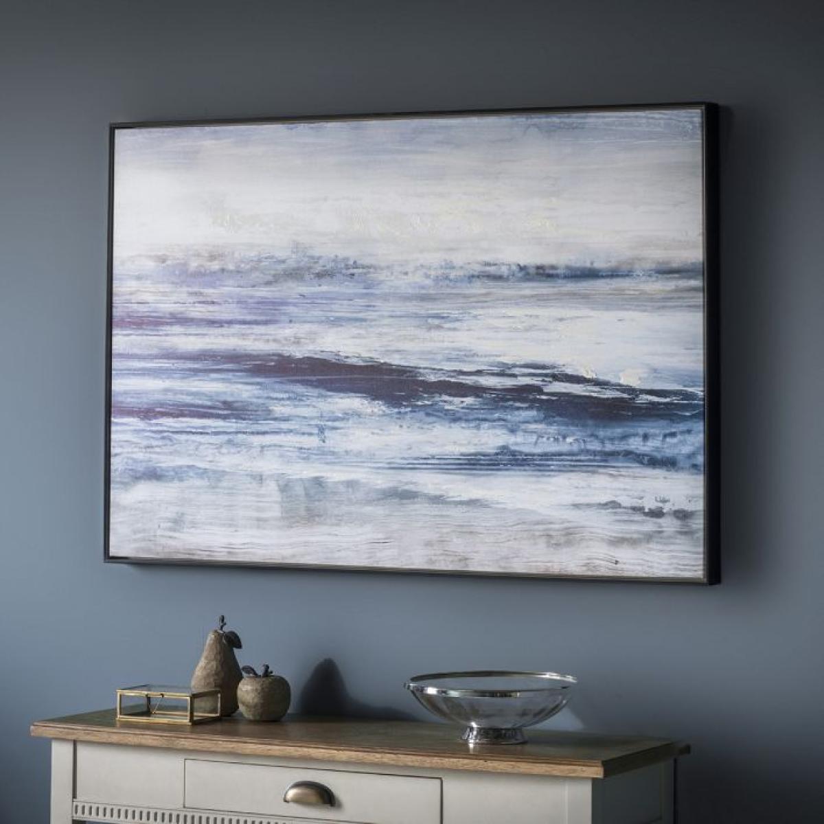 Stunning seascape scene printed giclee canvas, capturing the movement of the waves with textured hand applied acrylic highlights and set in a stylish black frame. Orientation: Landscape. Fixing Type: D-Ring. Framed:Yes. Colour: Blue.